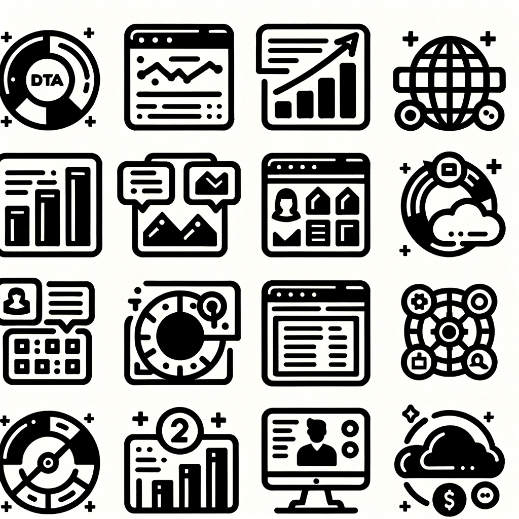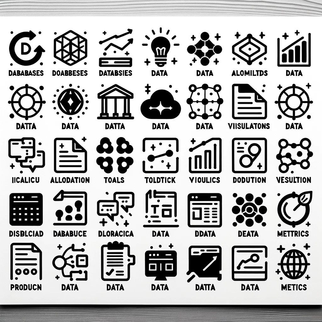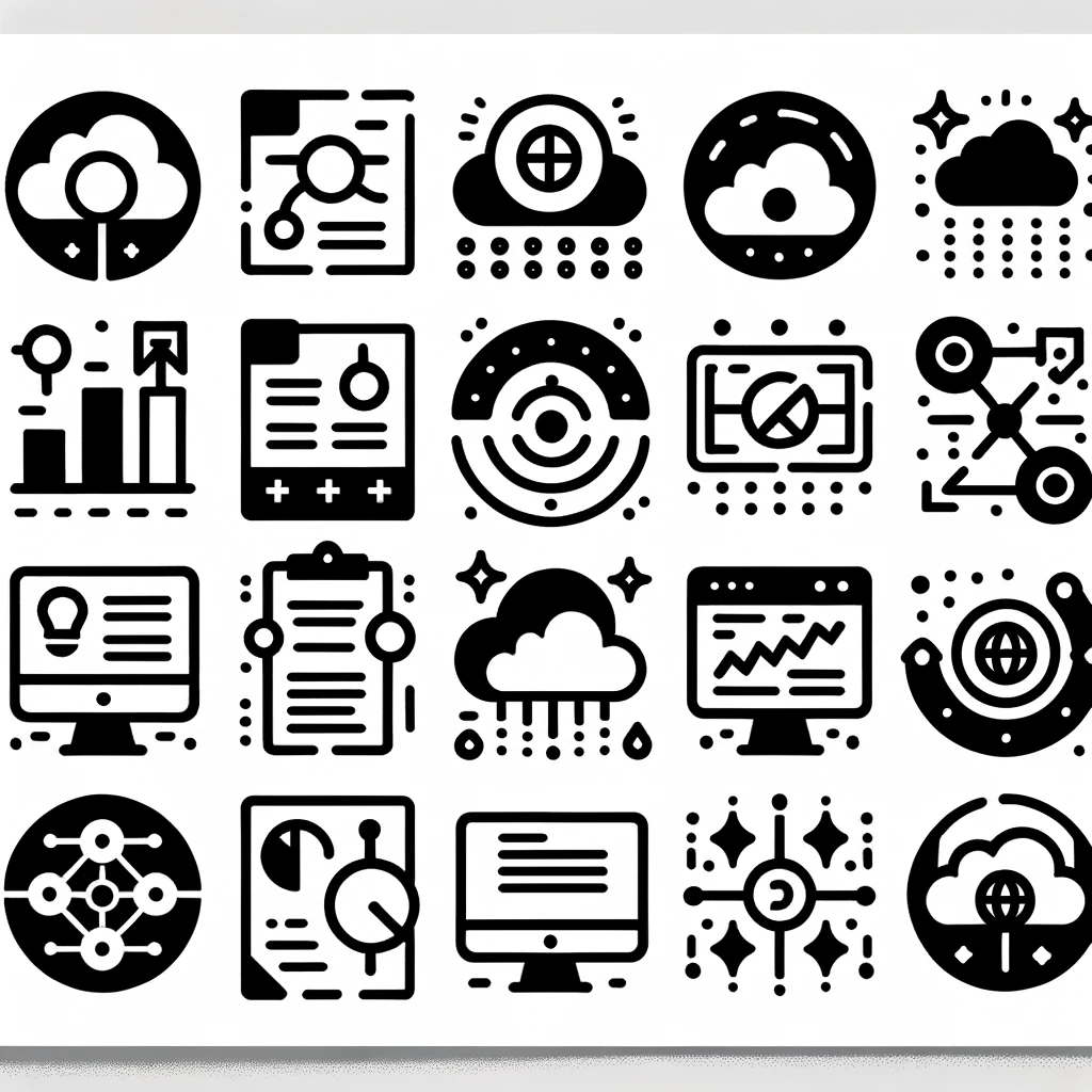 このデジタルアイコンのコレクションは、現代のデータソリューションとデジタルセキュリティを象徴しています。各アイコンは、データベース、クラウドコンピューティング、分析、グローバルネットワーク、セキュリティといった、情報技術の重要な要素を直感的に表現しています。明確でシンプルなデザインは、ユーザーにとって視認性が高く、技術的な複雑さをわかりやすく伝えています。これらのアイコンは、デジタル時代の基本的な構成要素を、一目で理解できるようにするための視覚的な言語です。