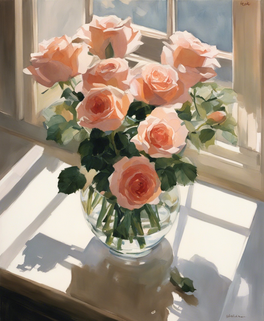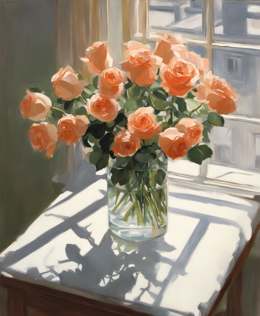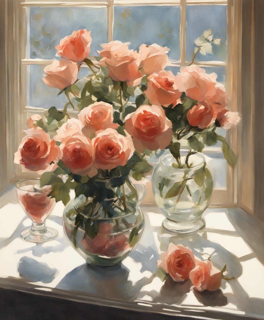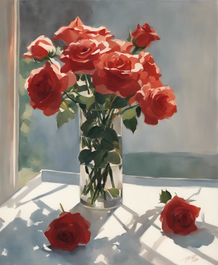 透明感あふれるガラスの花瓶に生けられた薔薇を描いた静物画です。窓辺に置かれた花瓶から差し込む自然光が、花びらの質感や影の美しさを際立たせています。タイトル「午後の光に包まれた薔薇」は、静かな午後の一時を捉え、温かみのある光の中で優雅に咲く薔薇の姿を表しています。画家は緻密な筆使いで花びらの一枚一枚に微妙な色の変化を付け、生命感あふれる表現をしています。ガラスの花瓶の透明感とその中の水、そしてその影は、現実と見紛うほどのリアリティを醸し出しており、絵を通じて観る者に穏やかな時間を感じさせる作品です。