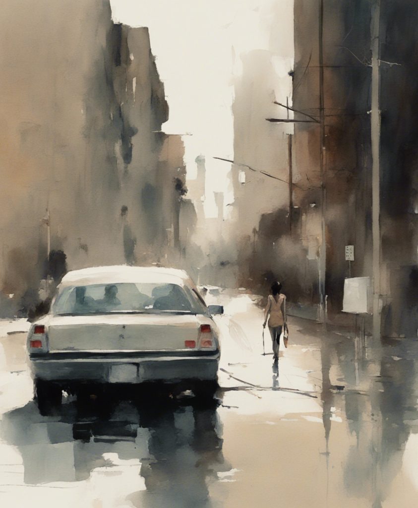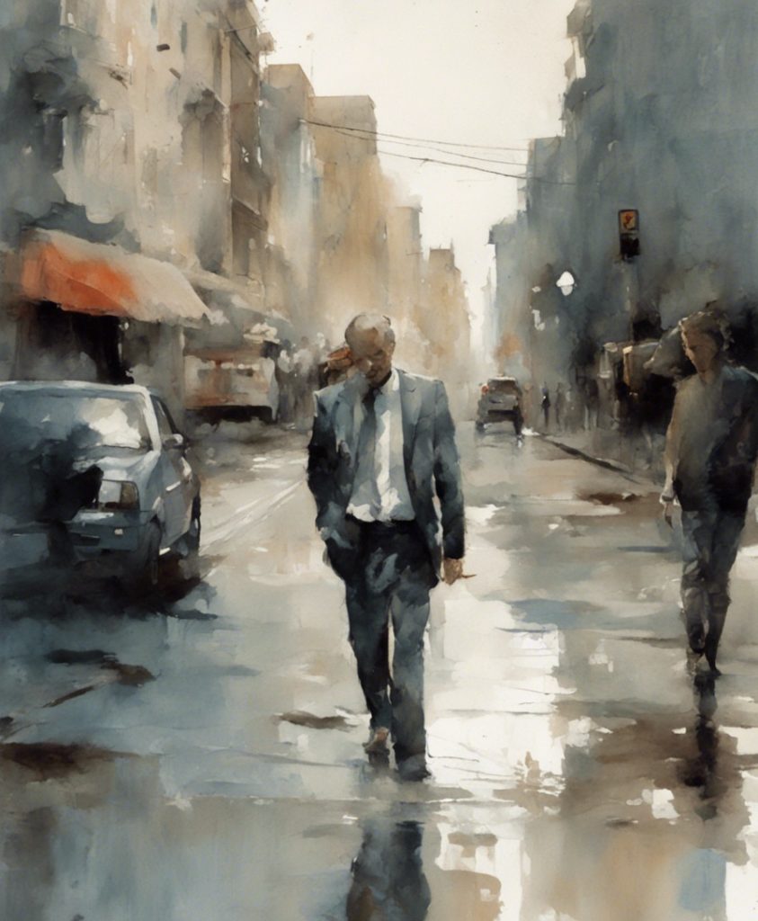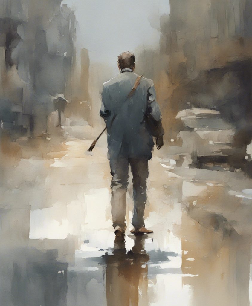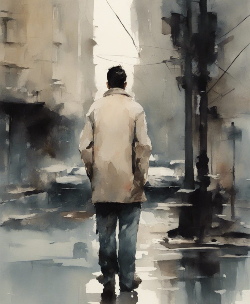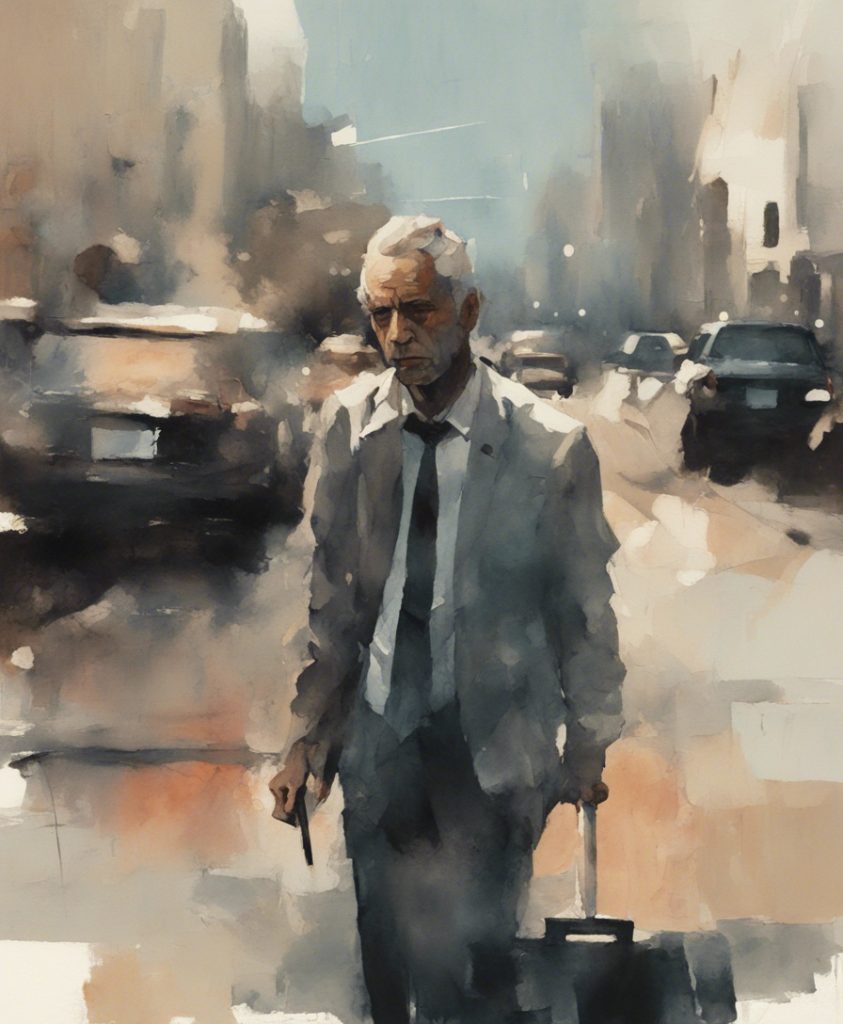 都会のざわめきの中で独り佇む一人の老紳士を描いています。彼の顔には、言葉にできない後悔や謝罪の感情が込められており、観る者に深い共感を呼び起こします。エルトン・ジョンの「Sorry Seems To Be The Hardest Word」の旋律が、まるで背景の一部としてこの絵に溶け込んでいるかのようです。色彩は抑えられており、その静かなトーンが内省的な雰囲気を強く印象づけています。