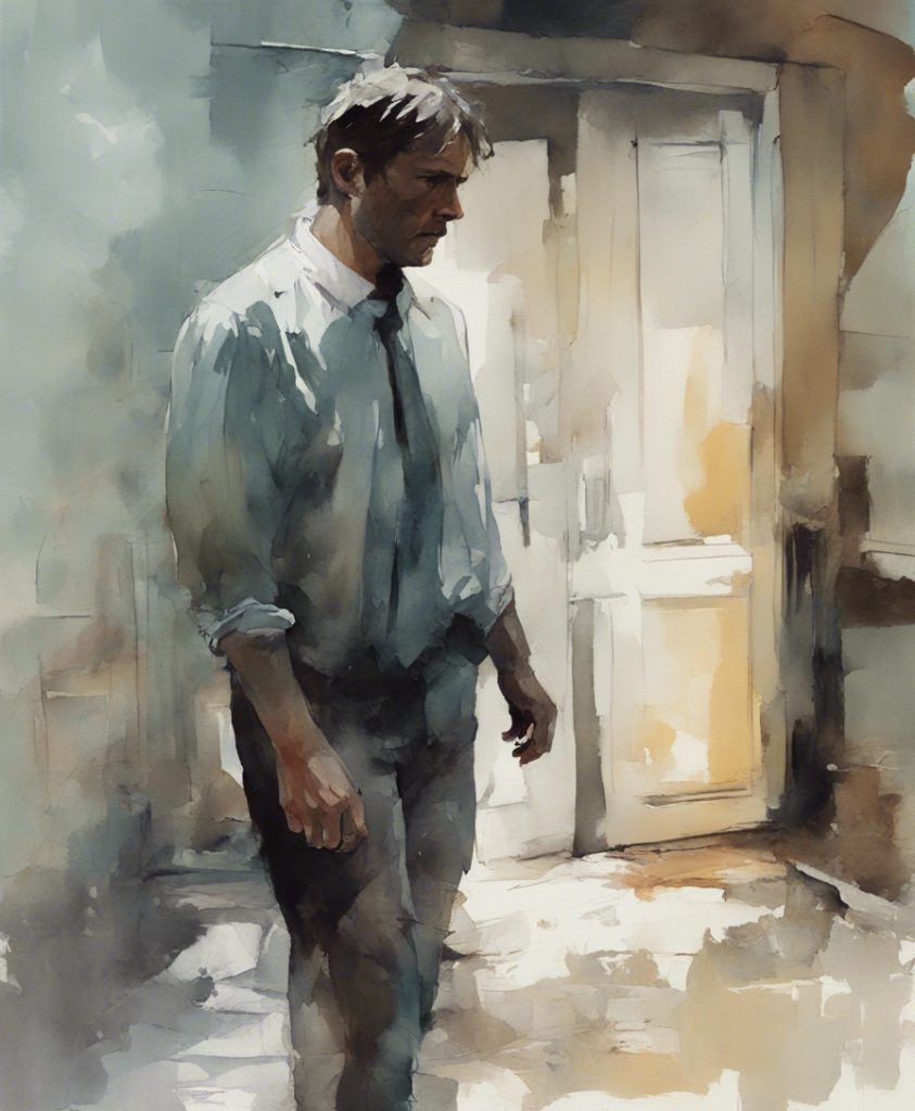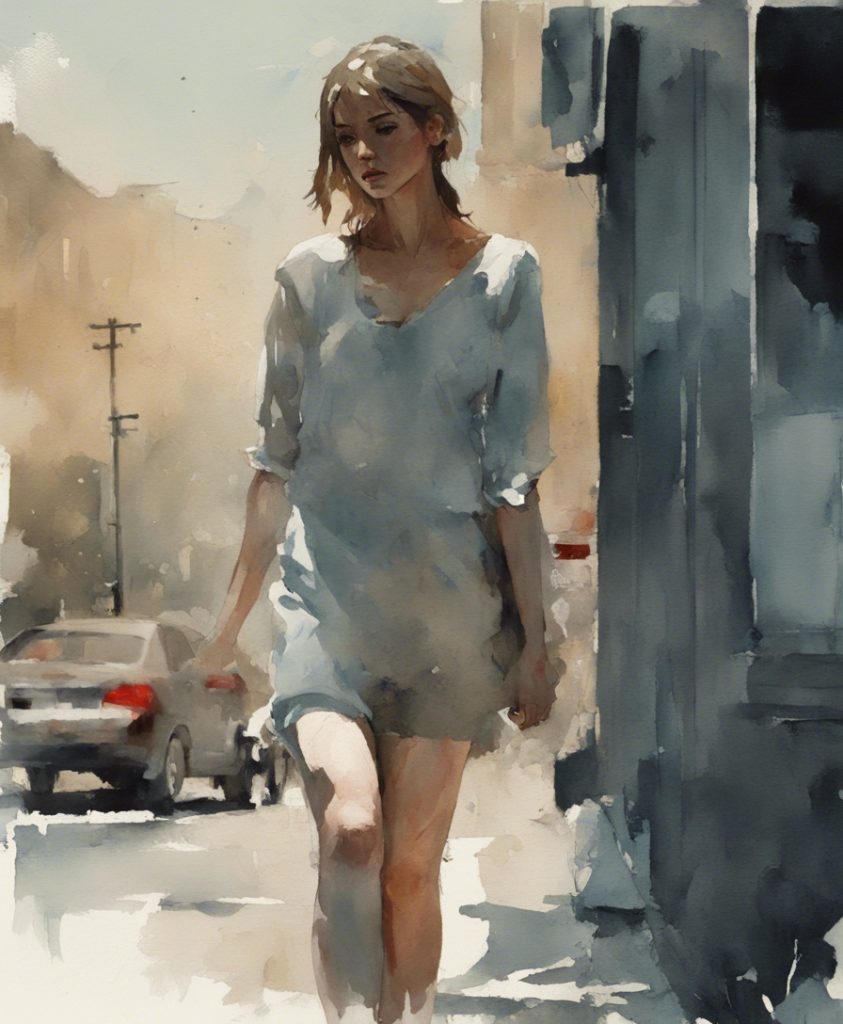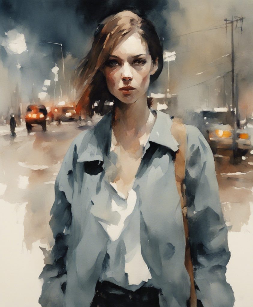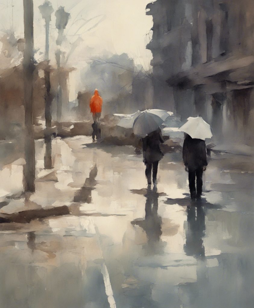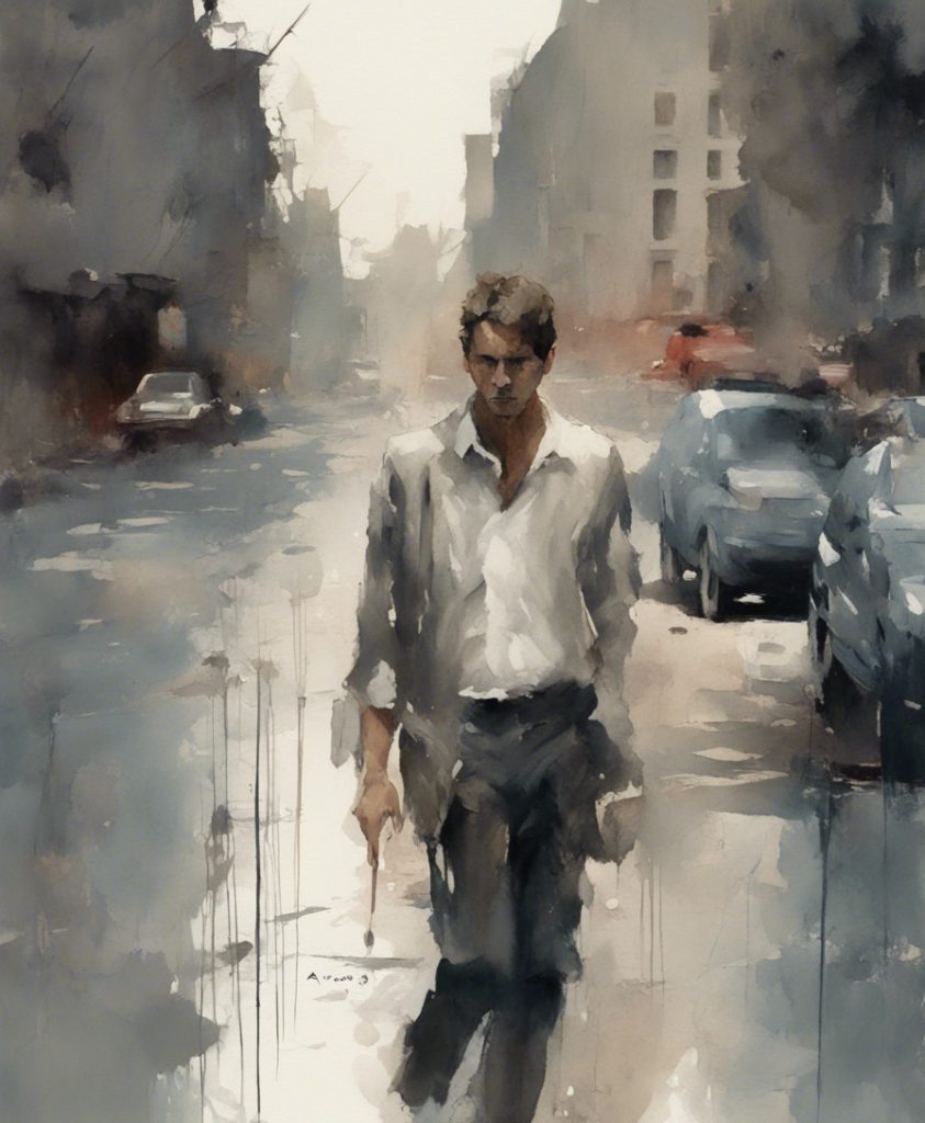 都会のざわめきの中で独り佇む一人の老紳士を描いています。彼の顔には、言葉にできない後悔や謝罪の感情が込められており、観る者に深い共感を呼び起こします。エルトン・ジョンの「Sorry Seems To Be The Hardest Word」の旋律が、まるで背景の一部としてこの絵に溶け込んでいるかのようです。色彩は抑えられており、その静かなトーンが内省的な雰囲気を強く印象づけています。