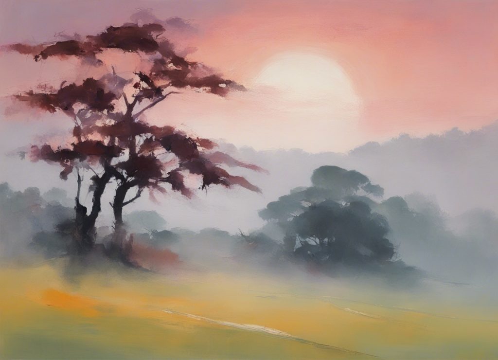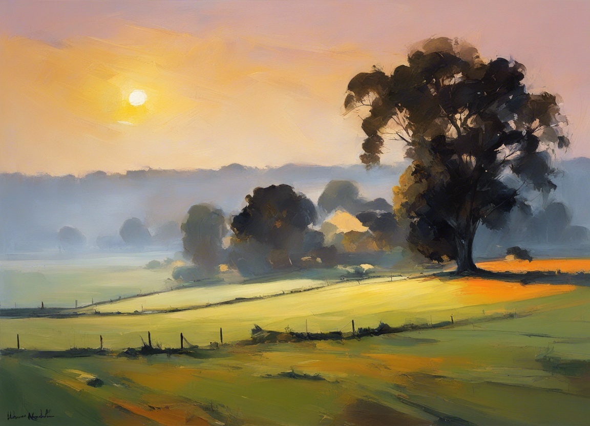夜が明ける直前の田園風景を温かく柔らかな色彩で表現しています。水面に映る太陽の光と、遠くに連なる木々のシルエットが穏やかな朝の到来を予感させます。この印象派風景画は、観る者を静寂で包み込む自然の美しさへと誘います。黄金色に染まる大地と、水辺にそびえる木々の落ち着いた佇まいが、新しい一日の希望と可能性を象徴しているかのようです。