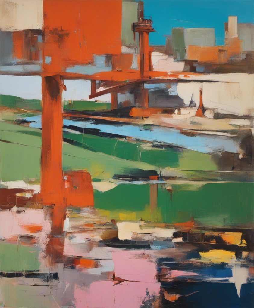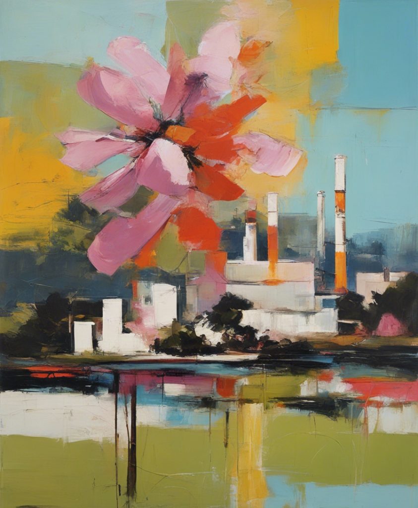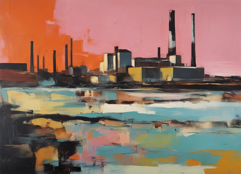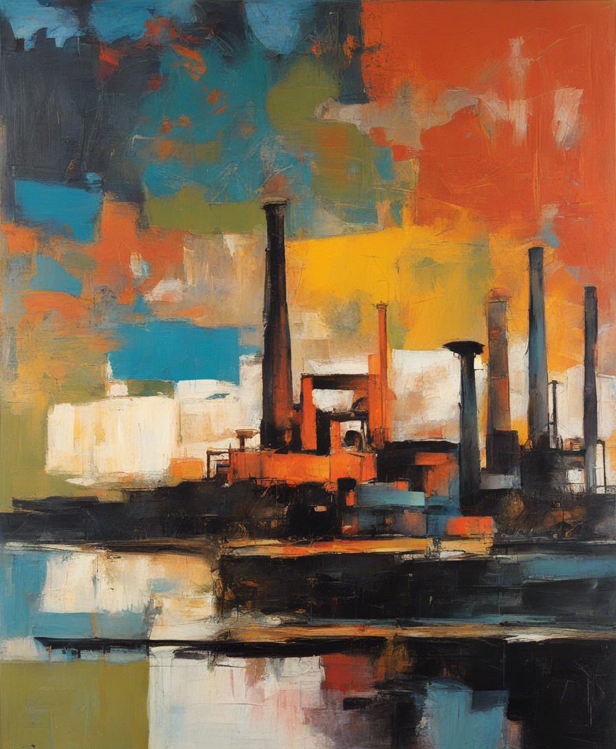 目を引く一枚。色彩が強く、感情を揺さぶる「響き合う工業の調べ」です。こちらの作品は、抽象表現主義の手法で描かれた風景画です。黄色や赤、青などの力強い色が混ざり合いながら、工場のシルエットを表現しています。画面下部には水面の反射を連想させる静かな部分があり、活気ある工業地帯のもう一つの顔を見せています。この絵は、ただの風景を越えて、私たちの心に訴えかける何か特別なメッセージを持っているようです。皆さんも、このカラフルな抽象の中に自分だけの物語を見つけてみてはいかがでしょうか。