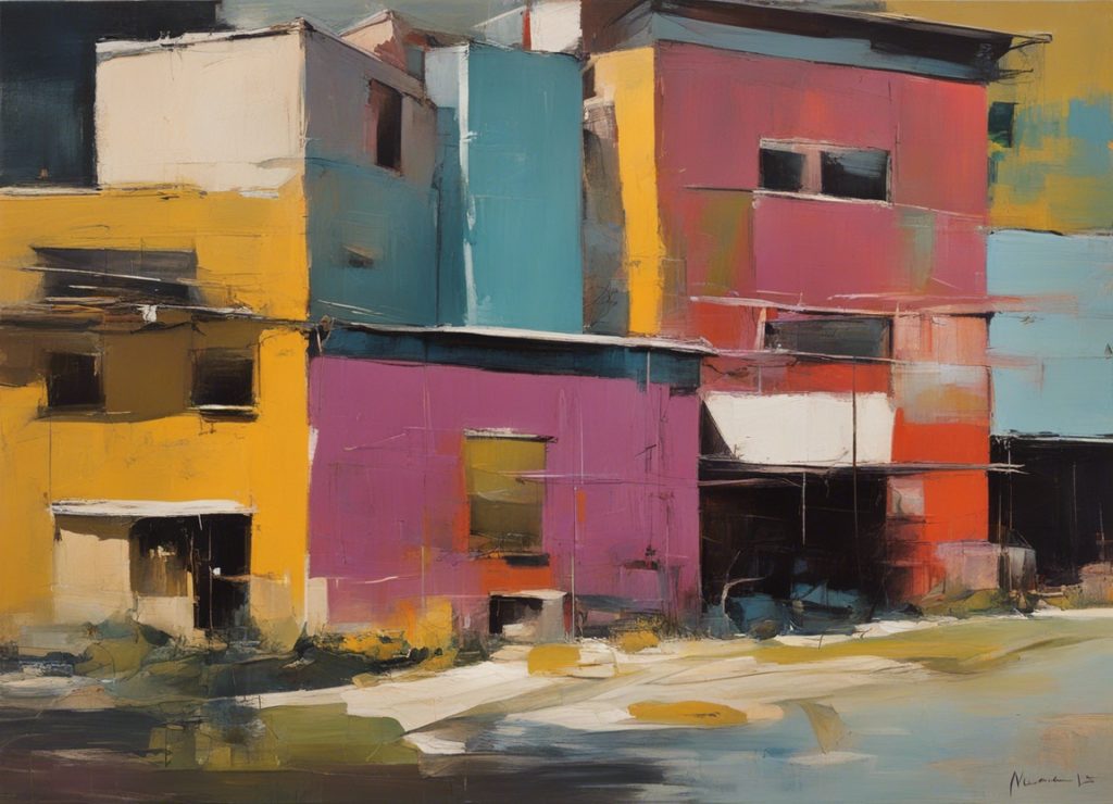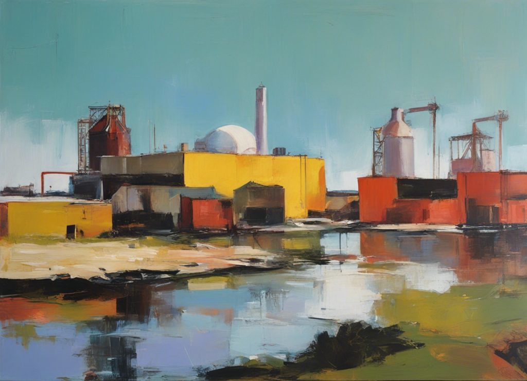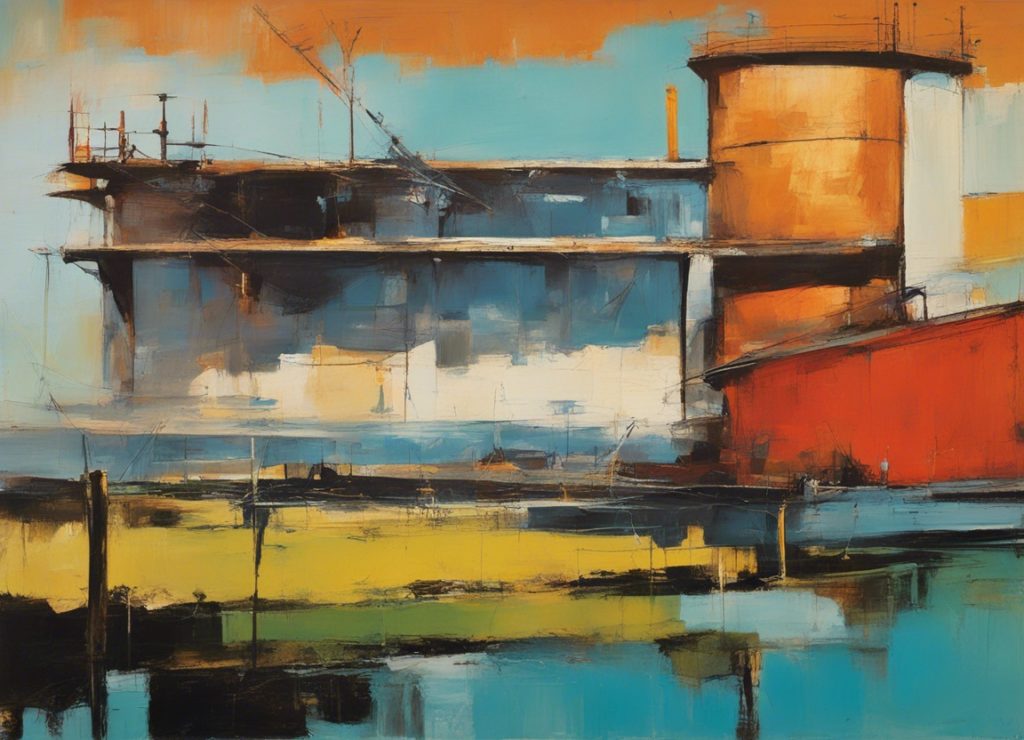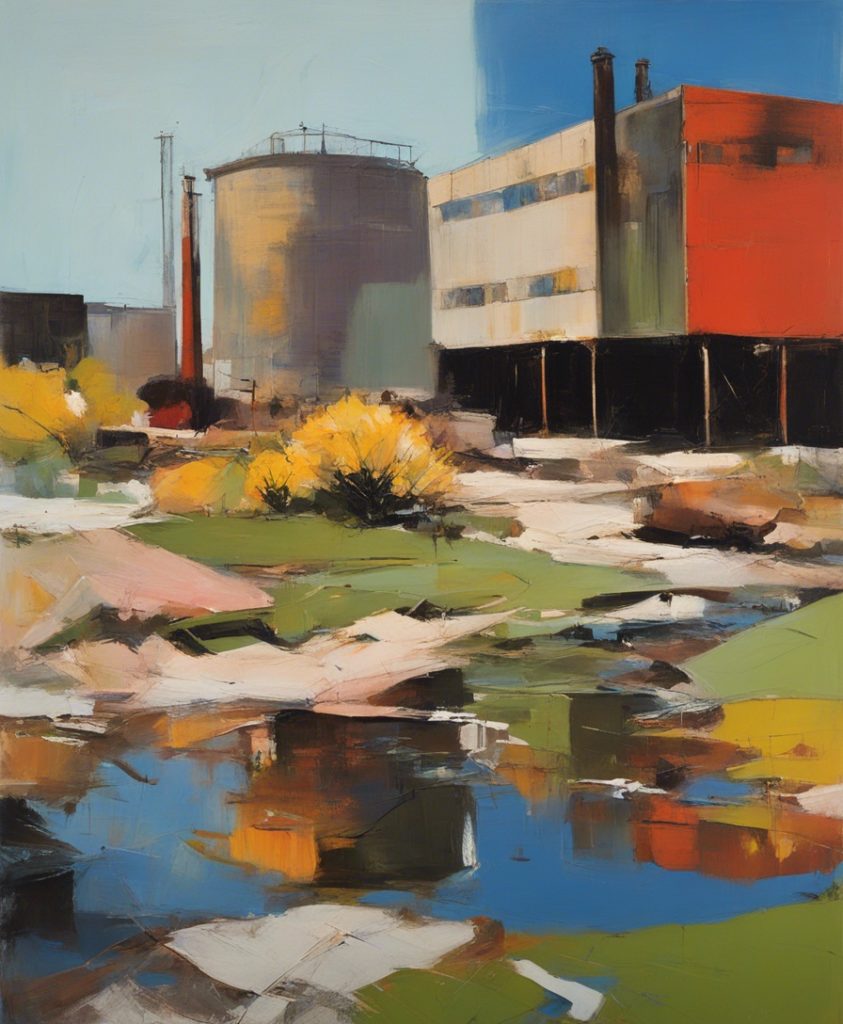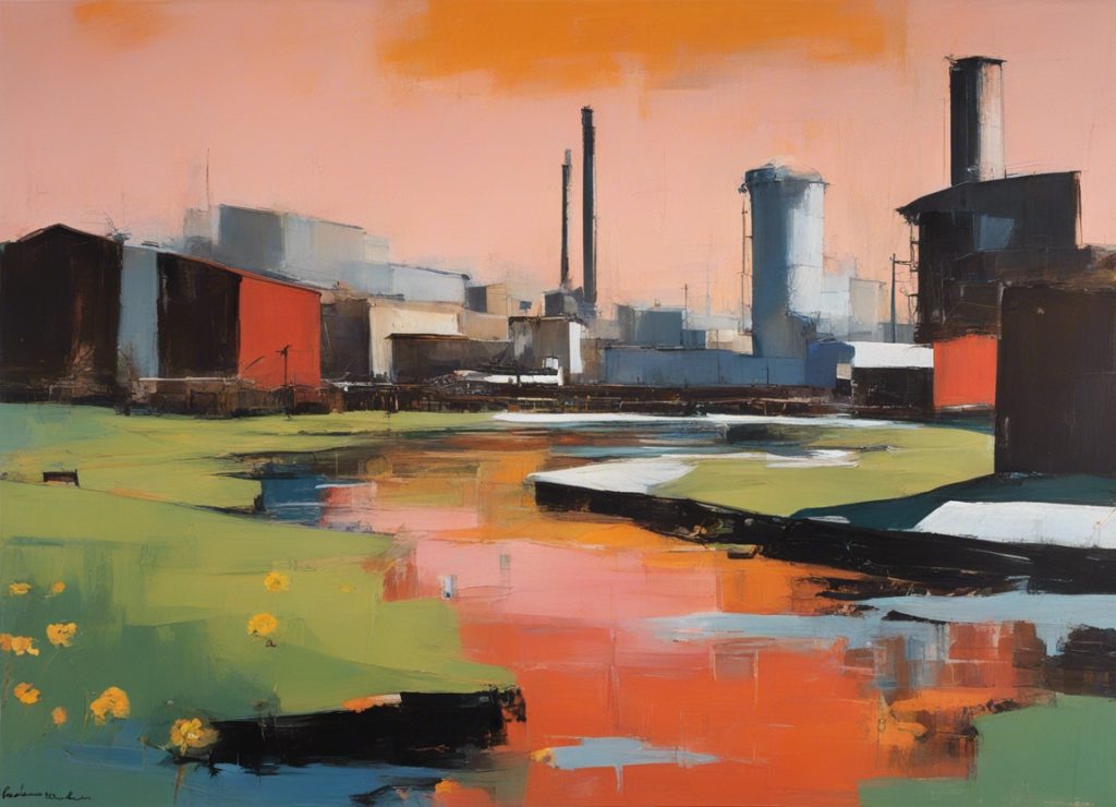 目を引く一枚。色彩が強く、感情を揺さぶる「響き合う工業の調べ」です。こちらの作品は、抽象表現主義の手法で描かれた風景画です。黄色や赤、青などの力強い色が混ざり合いながら、工場のシルエットを表現しています。画面下部には水面の反射を連想させる静かな部分があり、活気ある工業地帯のもう一つの顔を見せています。この絵は、ただの風景を越えて、私たちの心に訴えかける何か特別なメッセージを持っているようです。皆さんも、このカラフルな抽象の中に自分だけの物語を見つけてみてはいかがでしょうか。