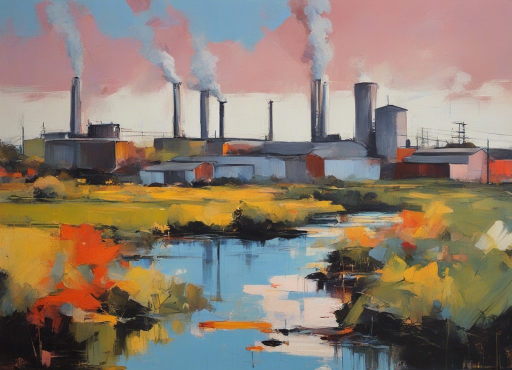 Pronput:Vibrant Industrial Zone, Factories, clear sky, small flower, small river,