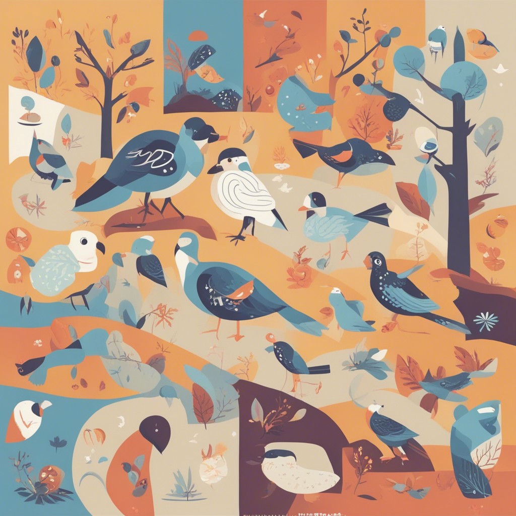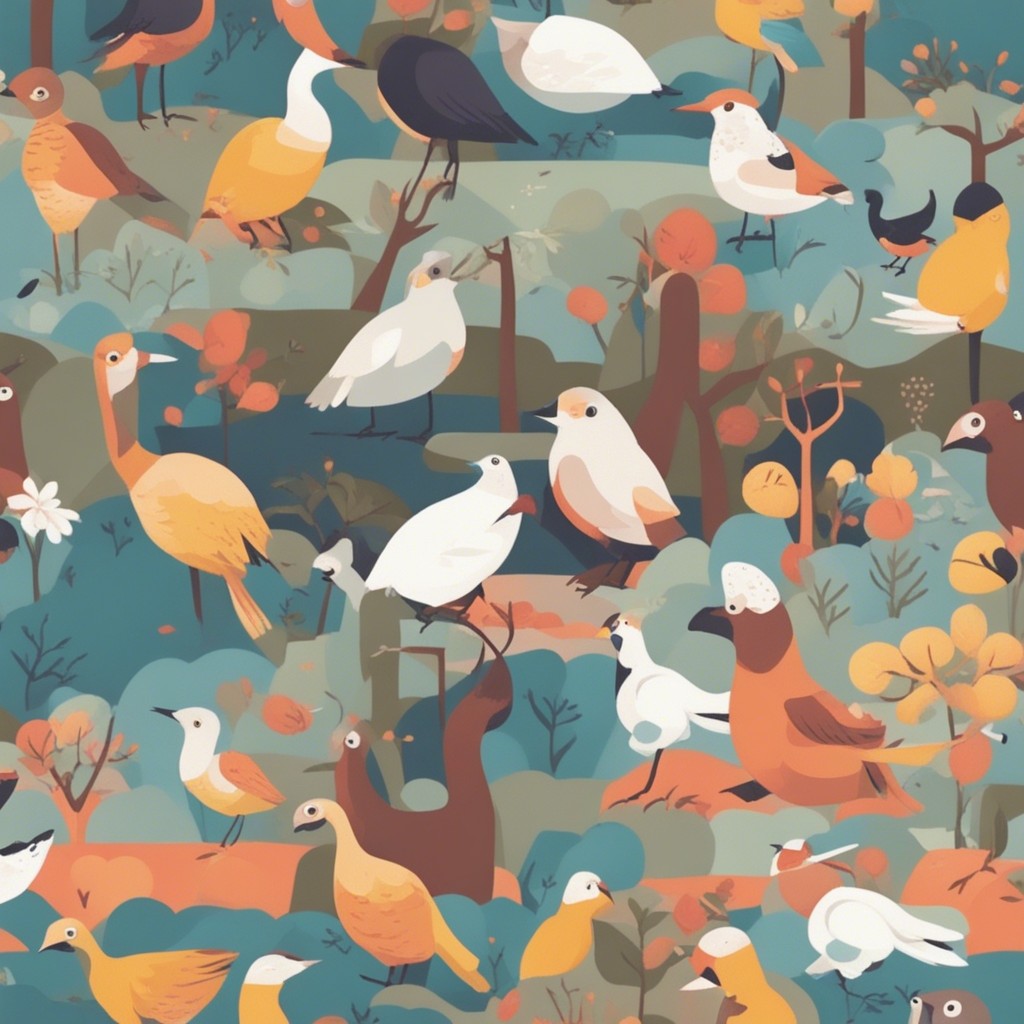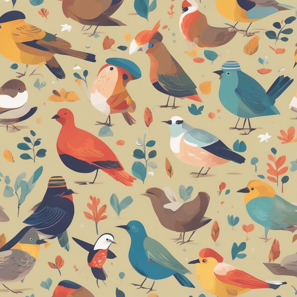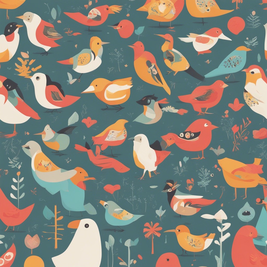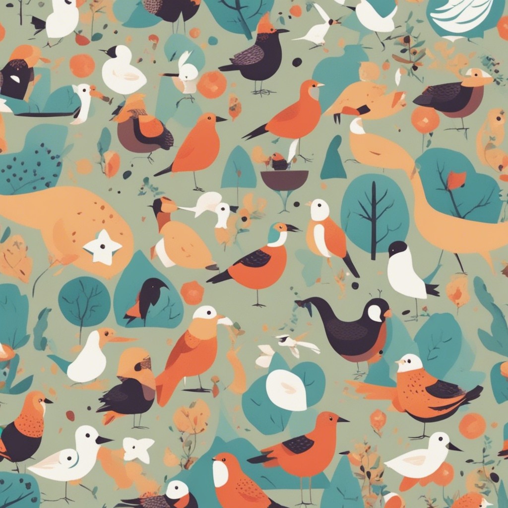 この彩り豊かなパターンデザインは、多様な鳥たちが集う楽園を描いています。青やオレンジ、白といった鮮やかな色彩を用いて、それぞれの鳥の個性を表現している一方で、全体のハーモニーも見事に保たれています。背景に散りばめられた植物のモチーフが自然の豊かさを感じさせ、ビジュアルの中に生命の営みの躍動を感じることができます。見る者に心地よい印象を与える、暖かみのある作品です。