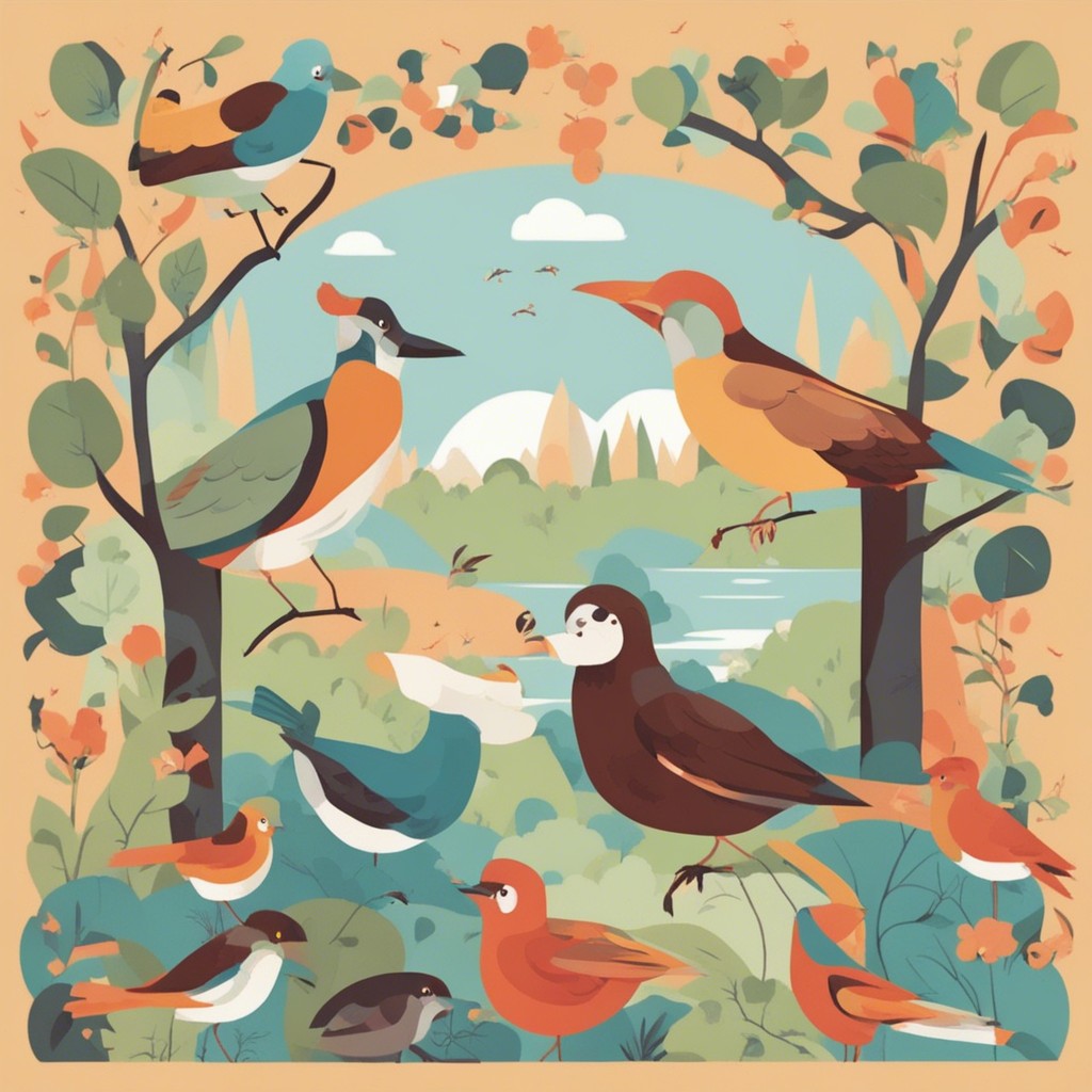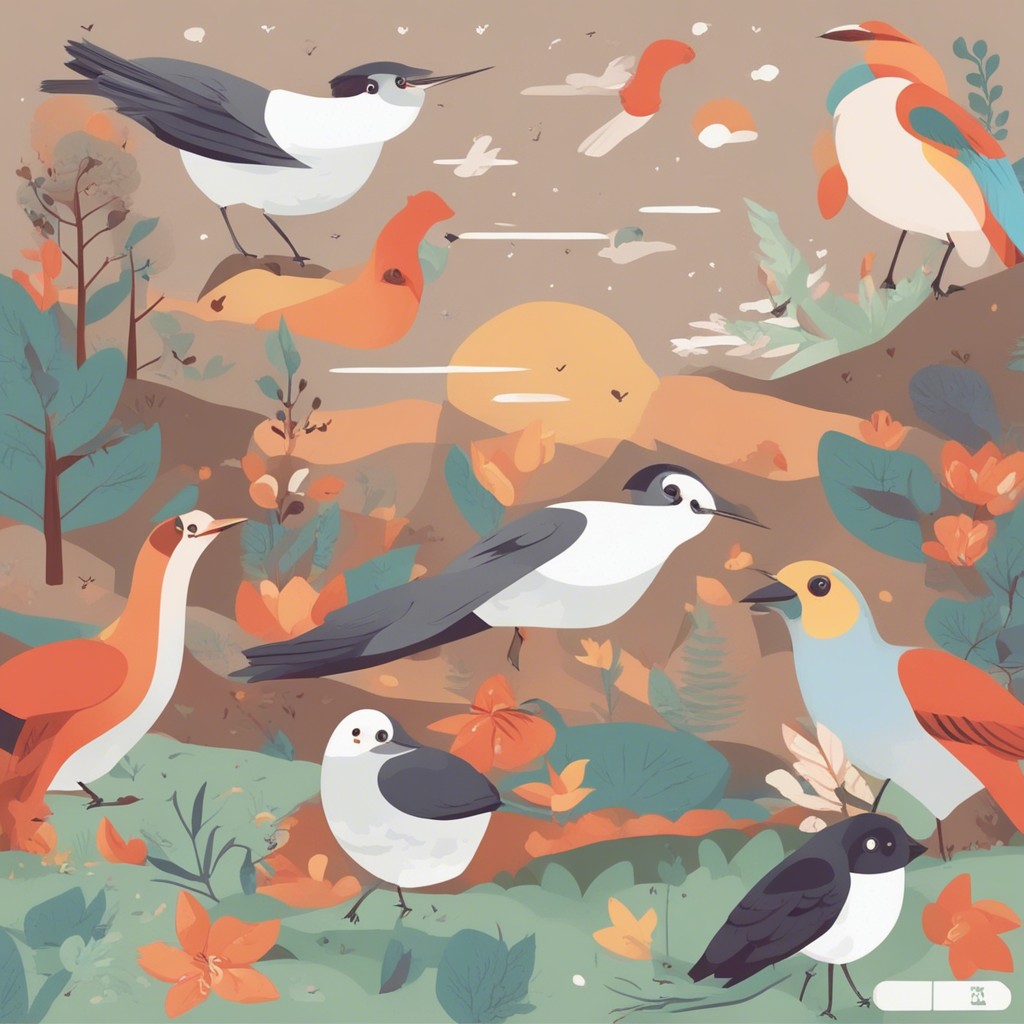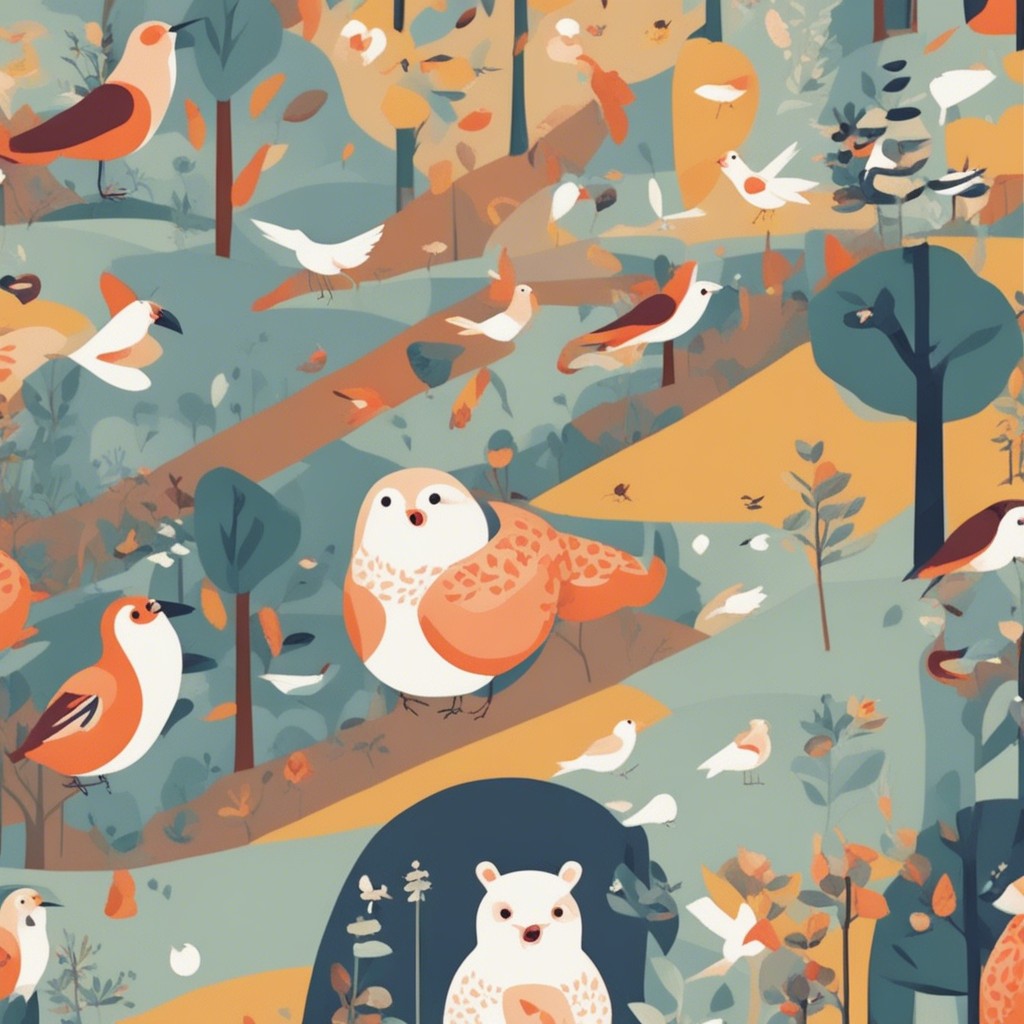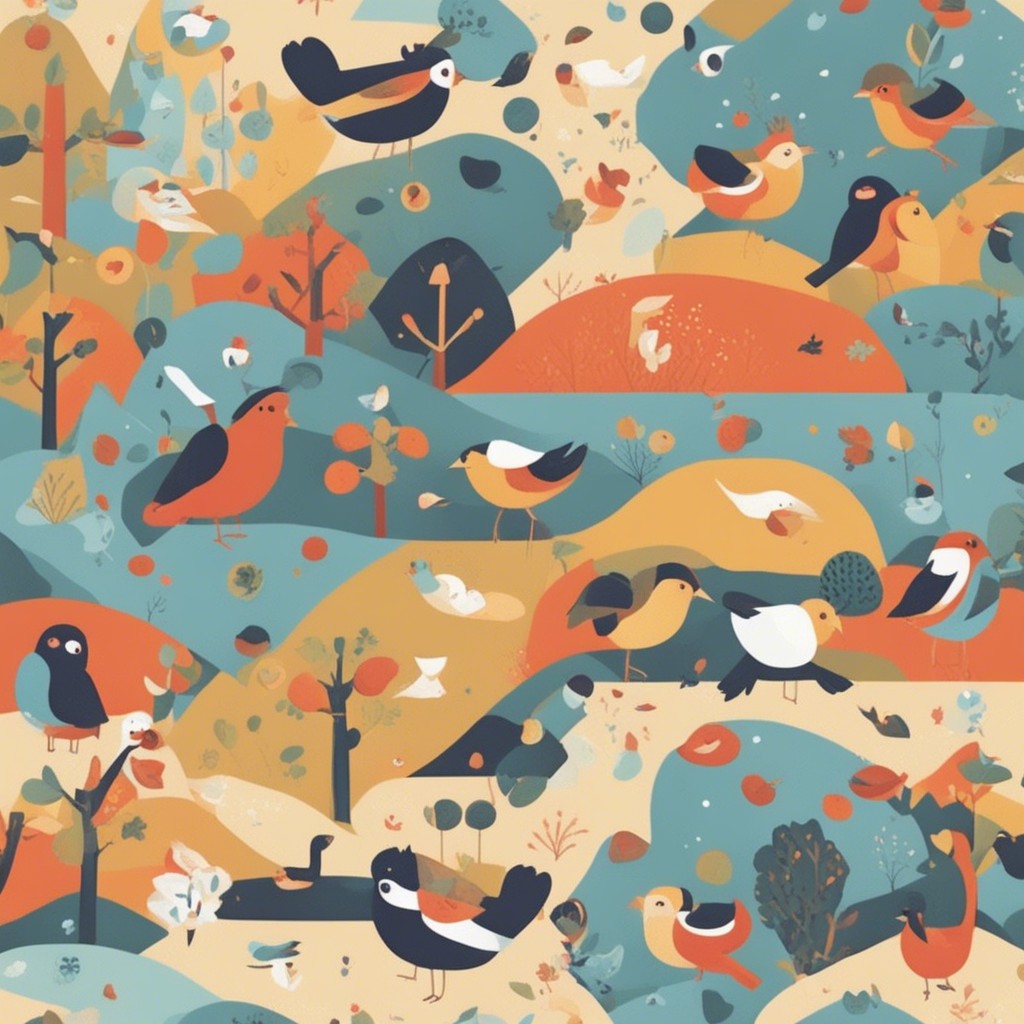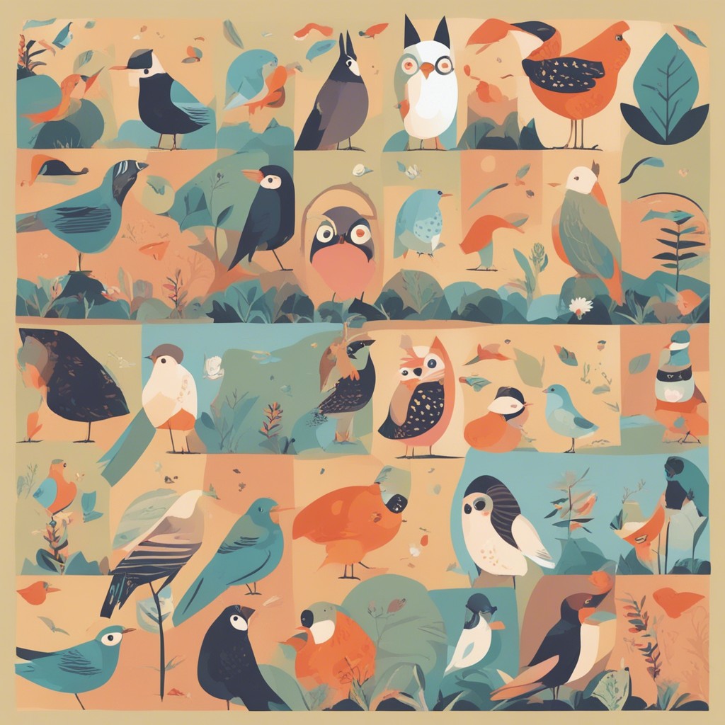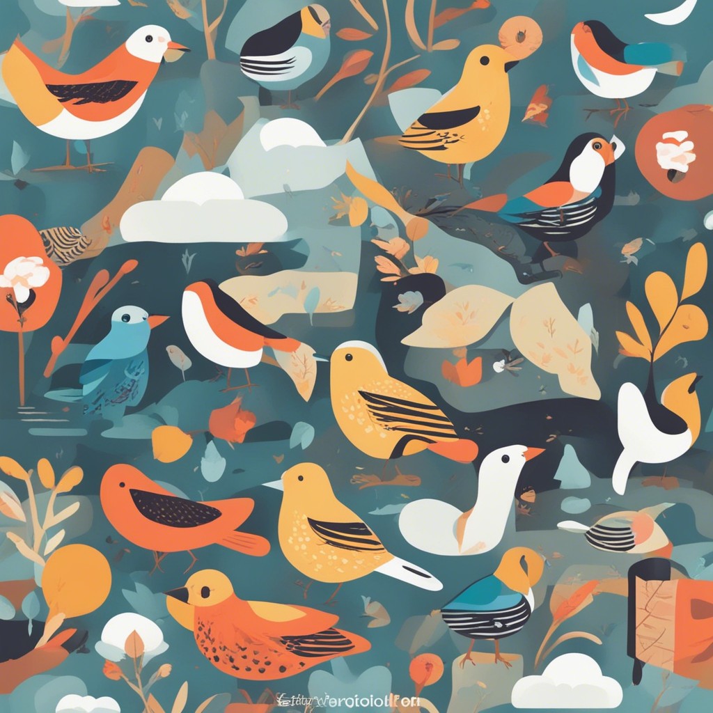 この彩り豊かなパターンデザインは、多様な鳥たちが集う楽園を描いています。青やオレンジ、白といった鮮やかな色彩を用いて、それぞれの鳥の個性を表現している一方で、全体のハーモニーも見事に保たれています。背景に散りばめられた植物のモチーフが自然の豊かさを感じさせ、ビジュアルの中に生命の営みの躍動を感じることができます。見る者に心地よい印象を与える、暖かみのある作品です。