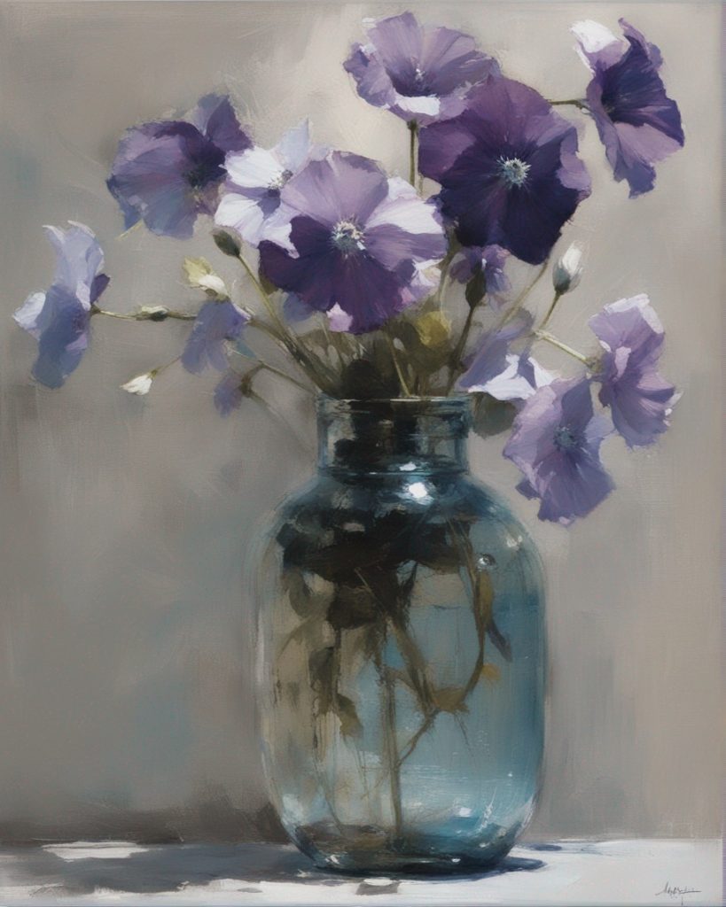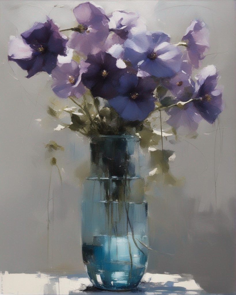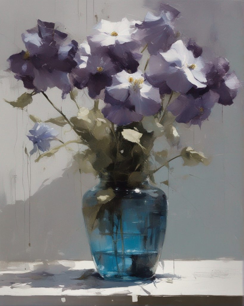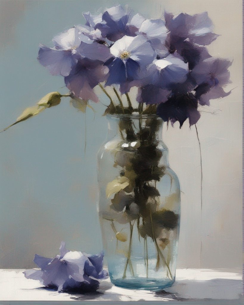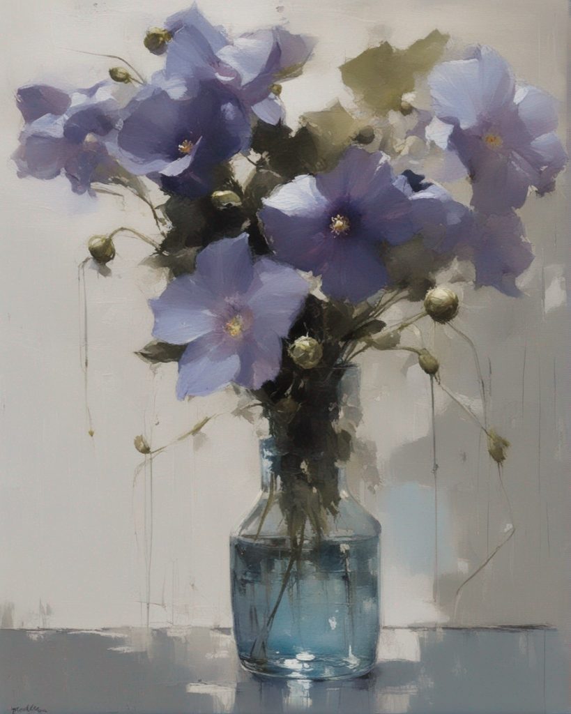 ハッシュタグ: #静物画,#桔梗,#青瓶,#紫色,#力強い筆のストローク,#透明感,#繊細な美,#自然の美,#静謐