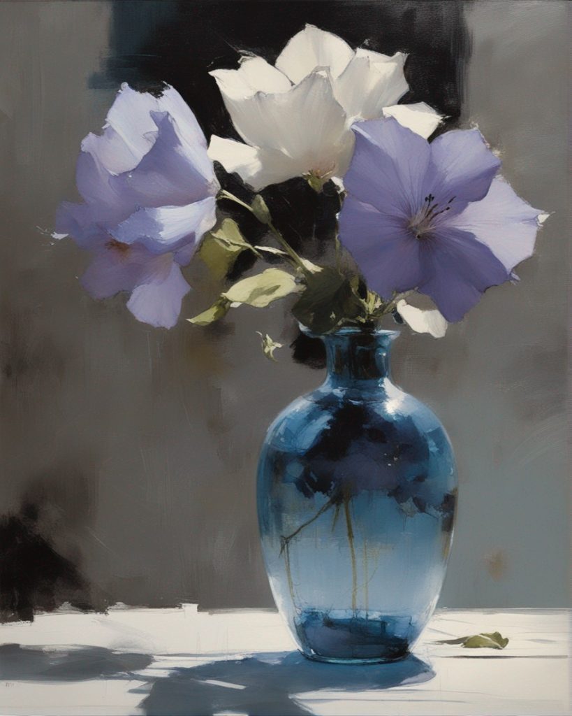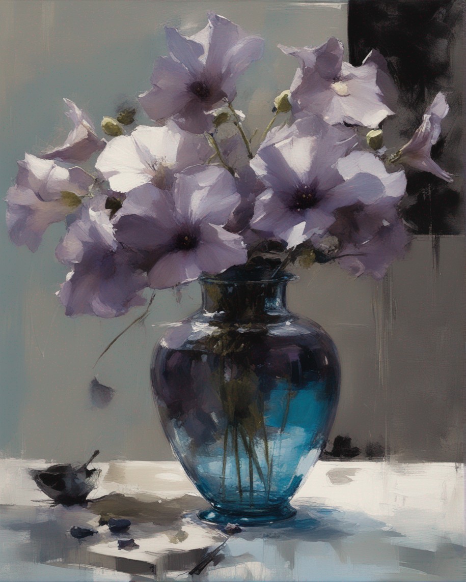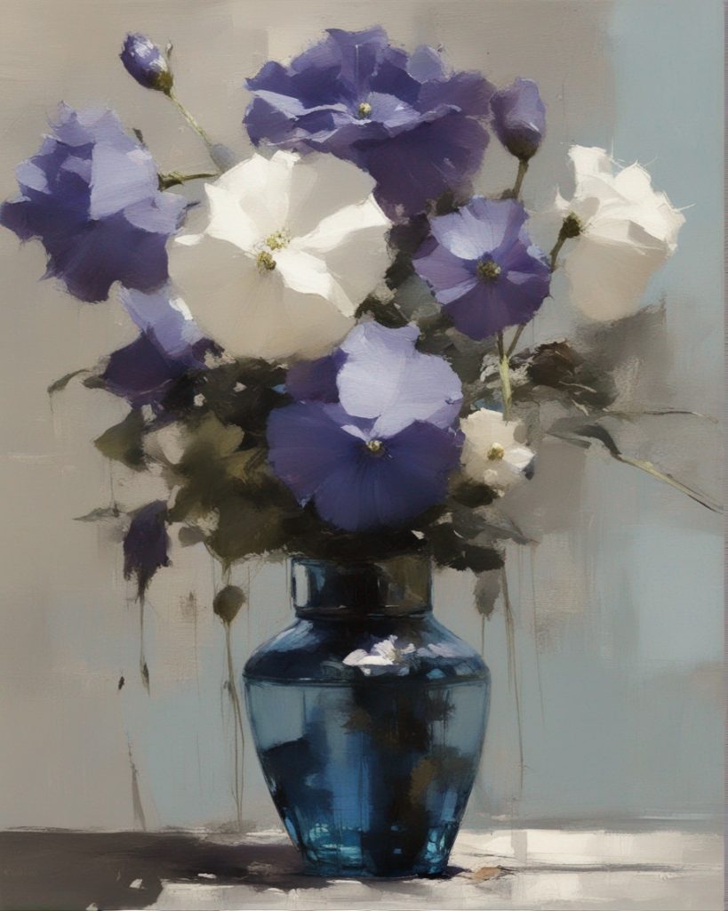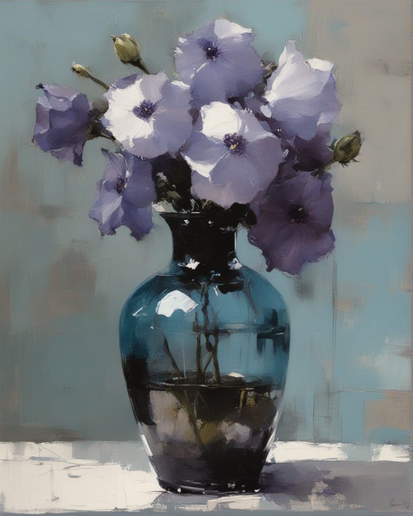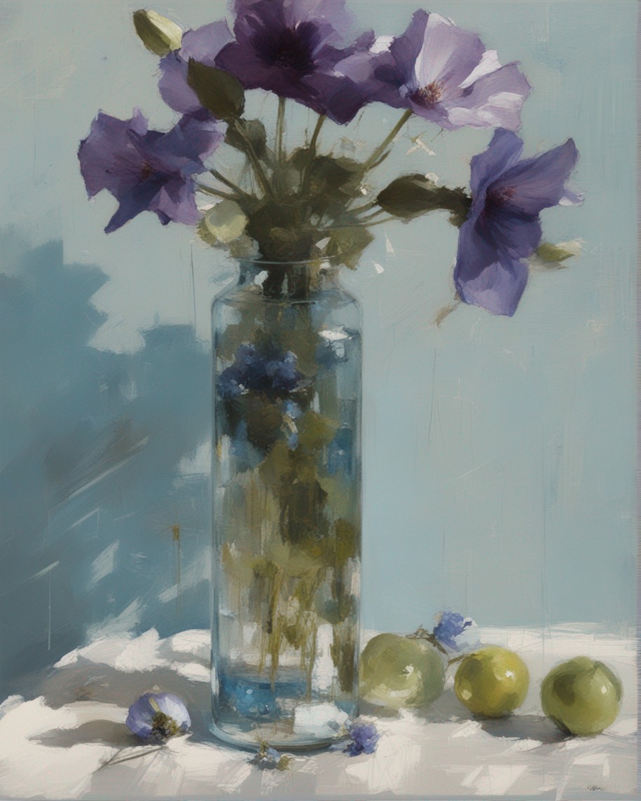 ハッシュタグ: #静物画,#桔梗,#青瓶,#紫色,#力強い筆のストローク,#透明感,#繊細な美,#自然の美,#静謐