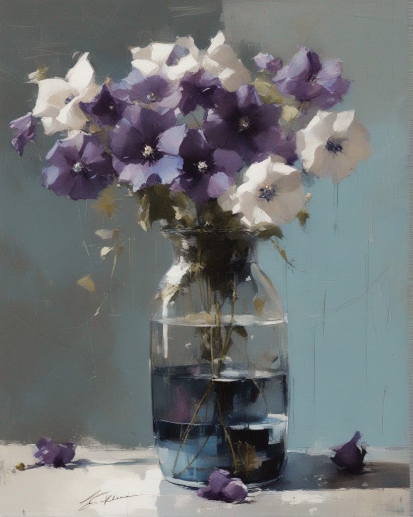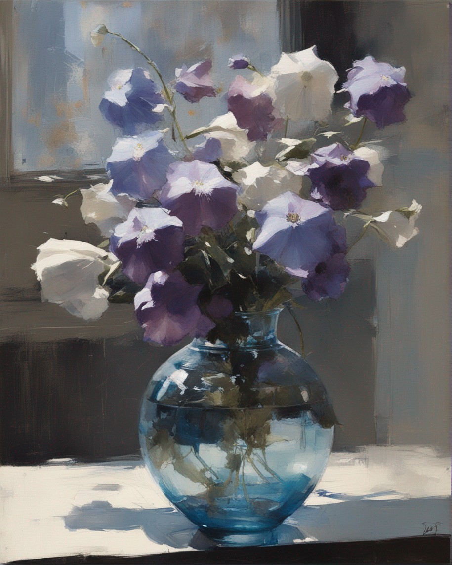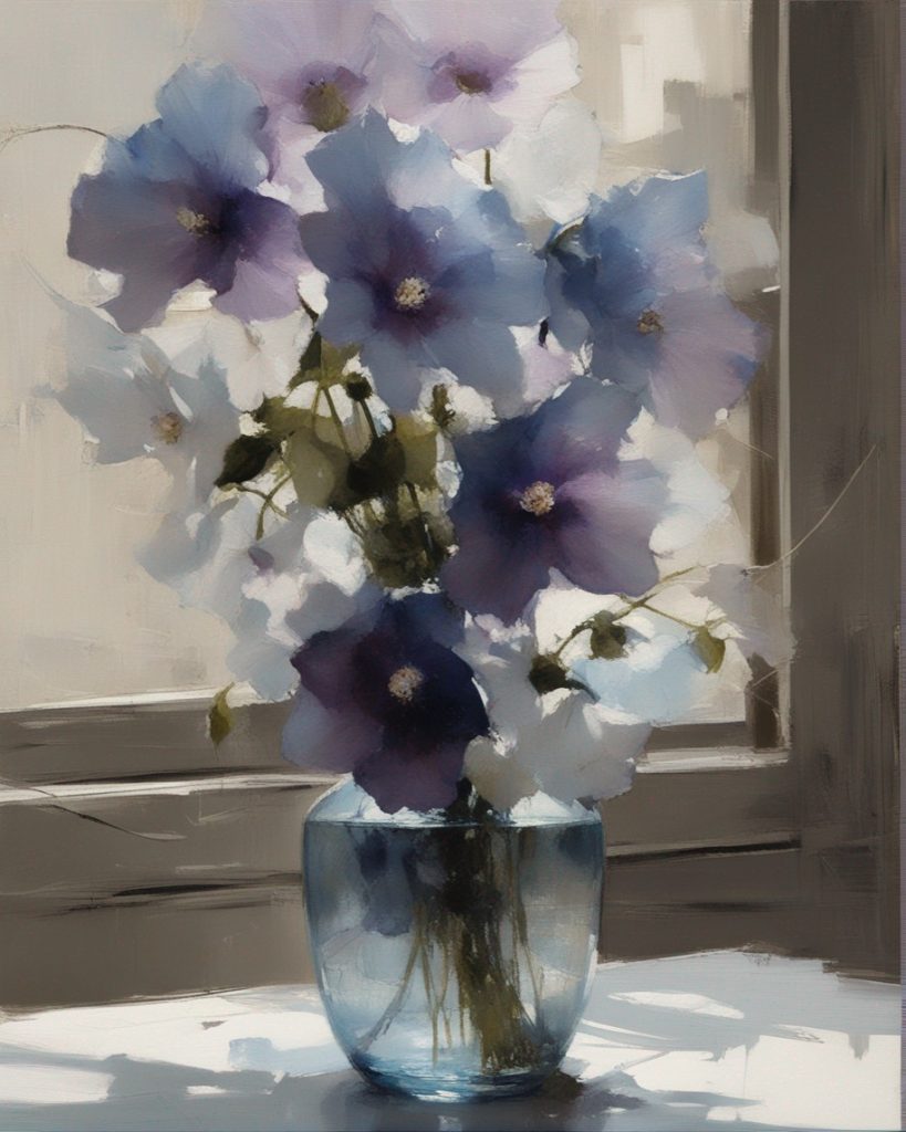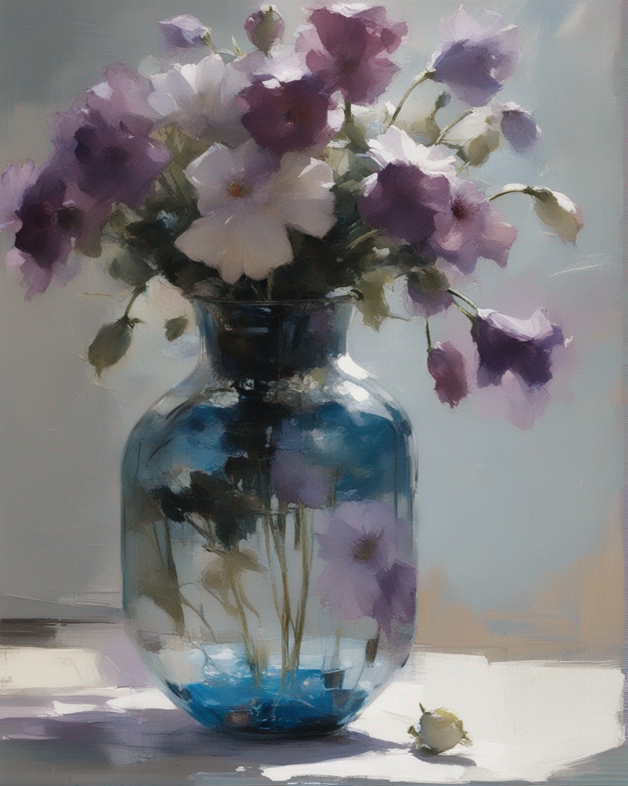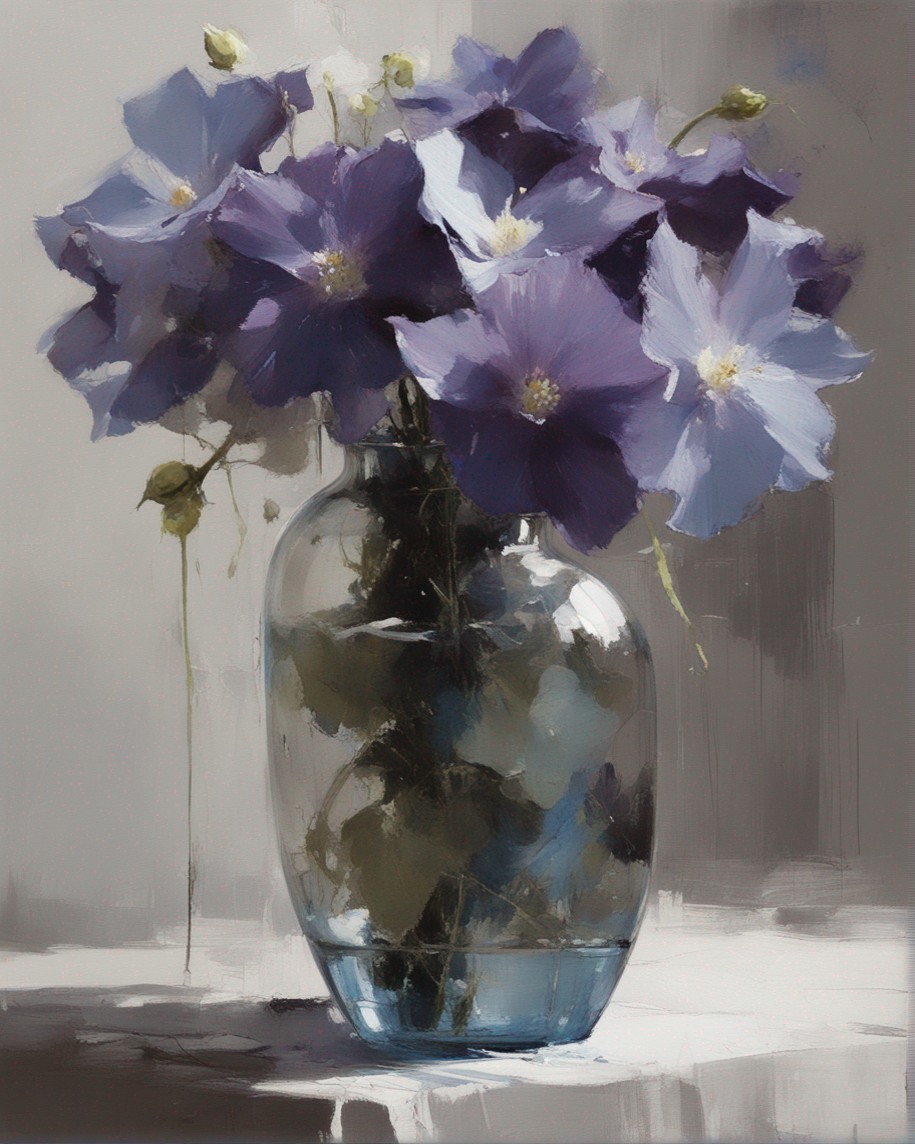 ハッシュタグ: #静物画,#桔梗,#青瓶,#紫色,#力強い筆のストローク,#透明感,#繊細な美,#自然の美,#静謐