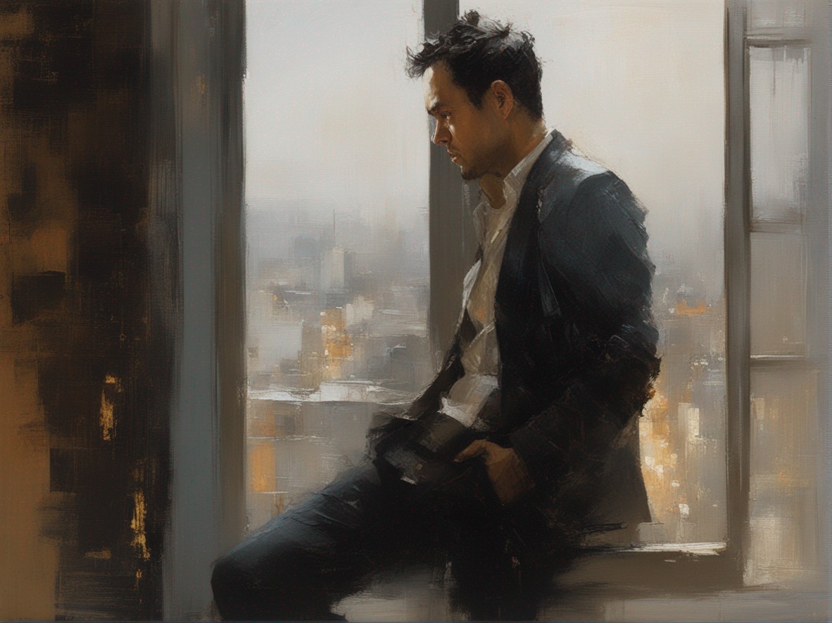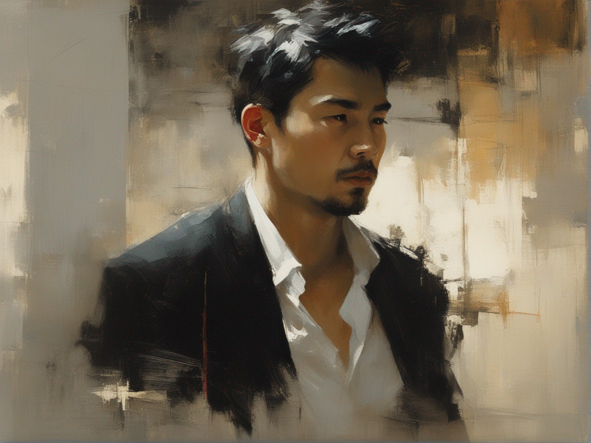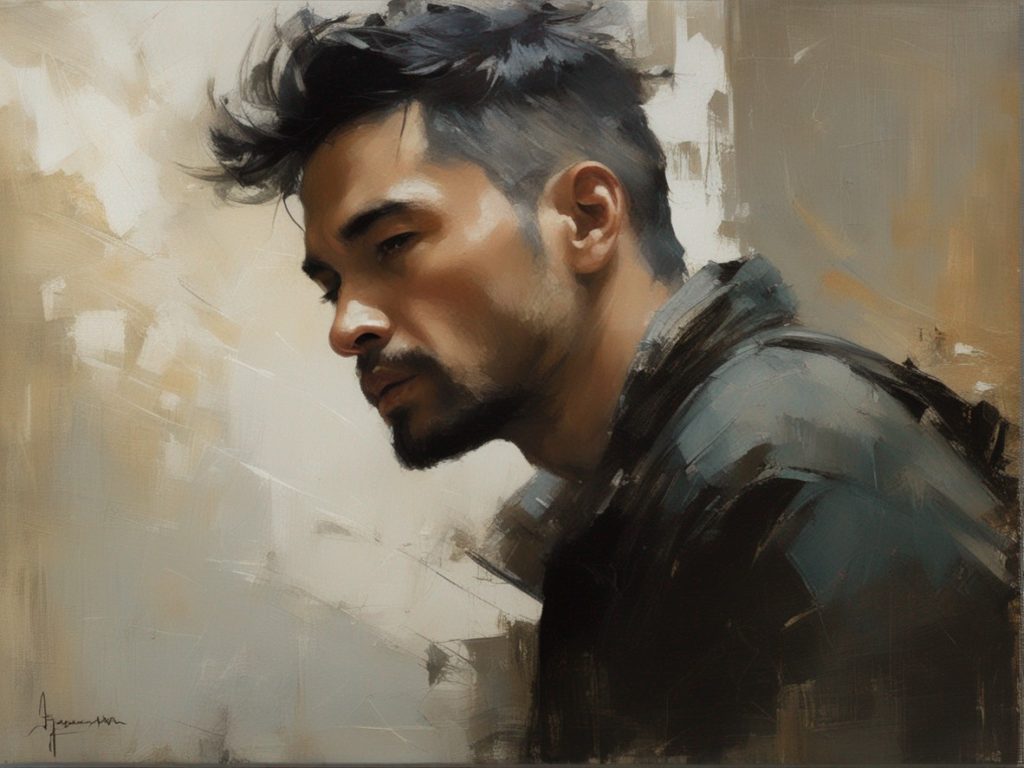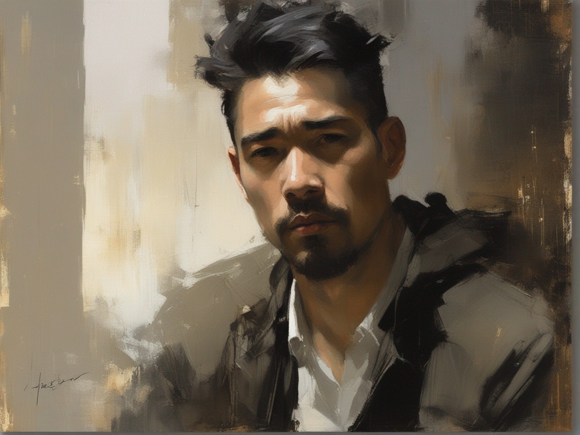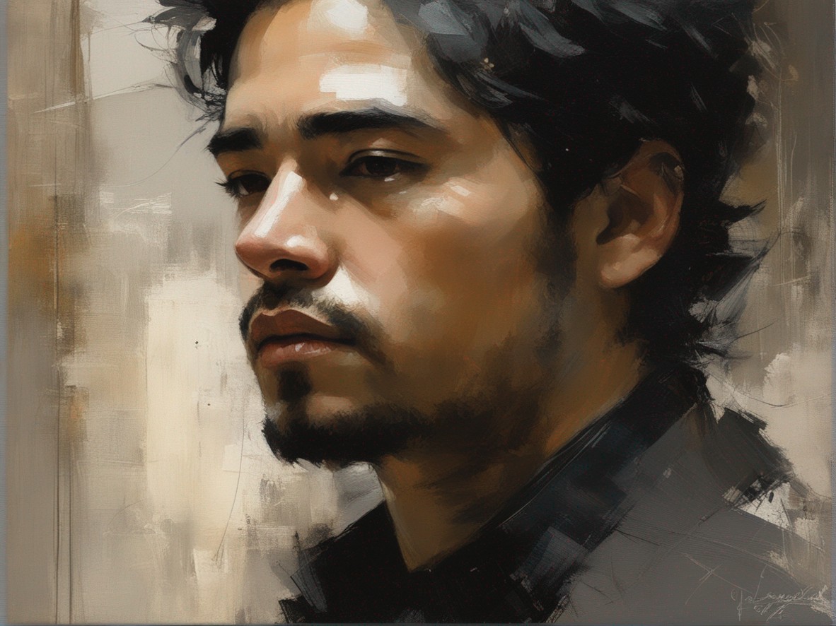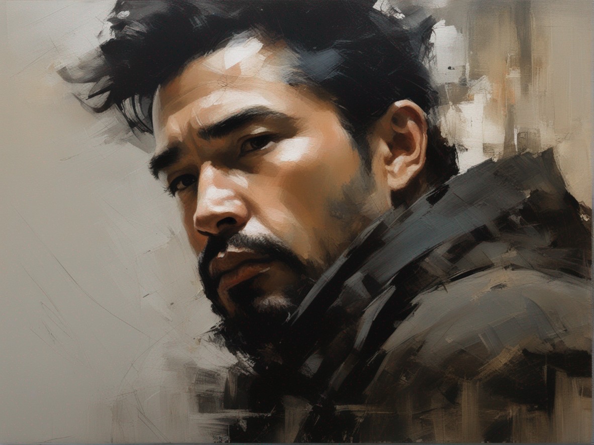 強い視線と思慮深い表情を持つ男性を描いた肖像画です。彼の目は何か遠くを見つめ、内省と静寂の瞬間をとらえています。画家の力強い筆使いは、被写体の感情の深みを強調し、肖像に生命を吹き込んでいます。背景は抽象的なタッチで描かれており、主題の人物が一層際立つようにしています。この作品は、観る者に男性の内面的な世界への思索を促すと同時に、人間の感情の複雑さを感じさせます。