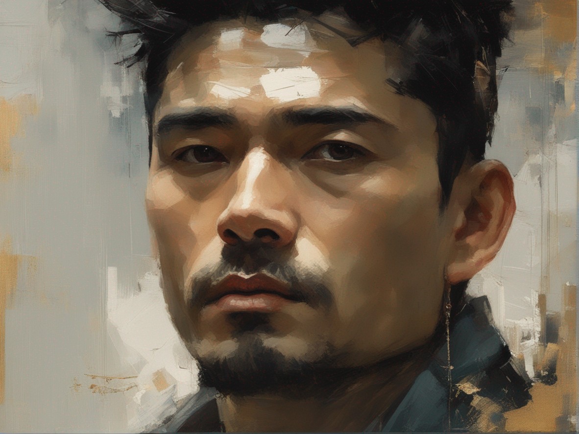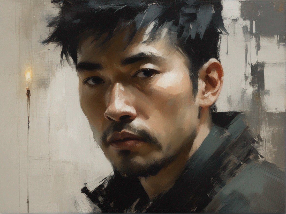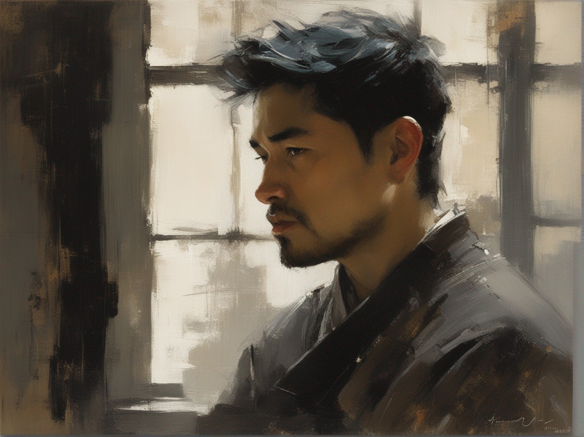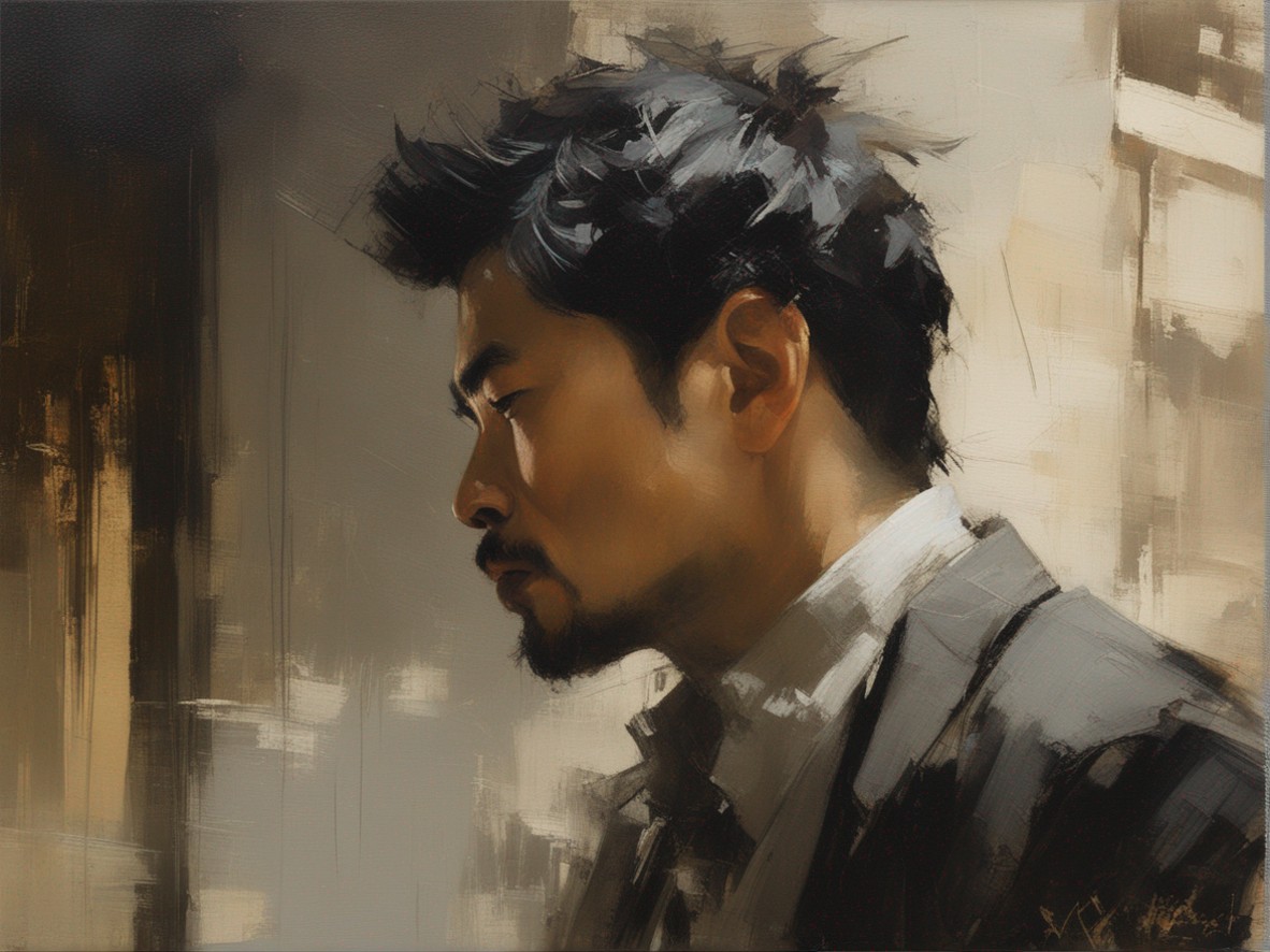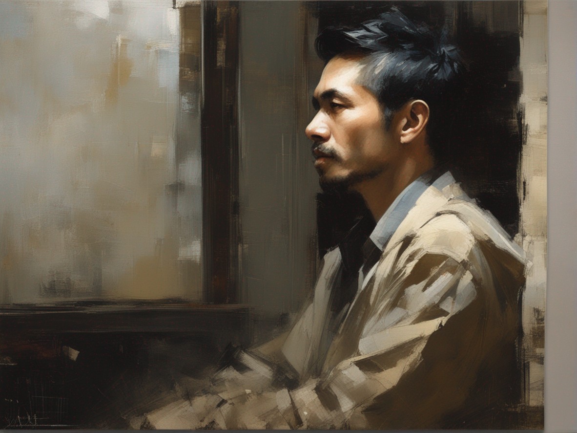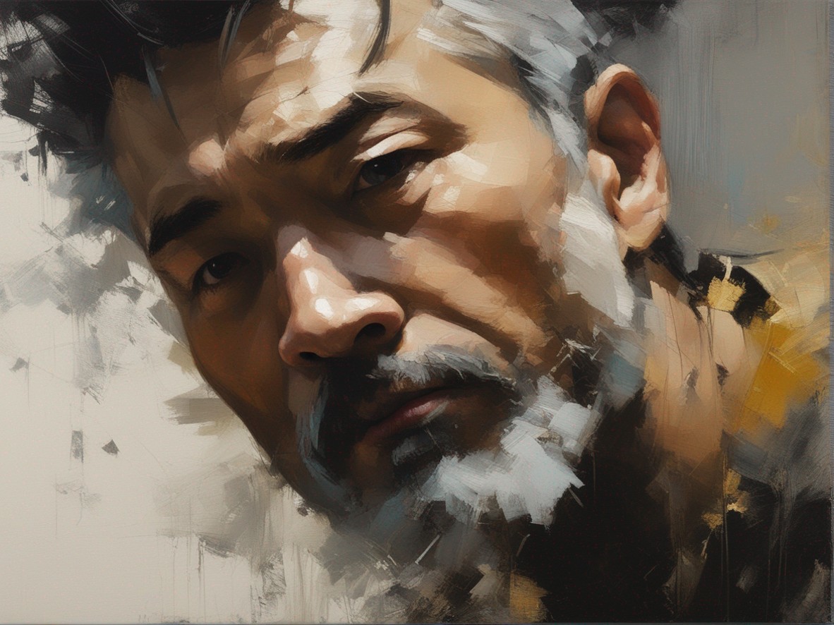 ハッシュタグ: #肖像画,#視線,#思慮深い,#内省,#静寂,#力強い筆使い,#感情の深み,#抽象的背景,#人間の感情
