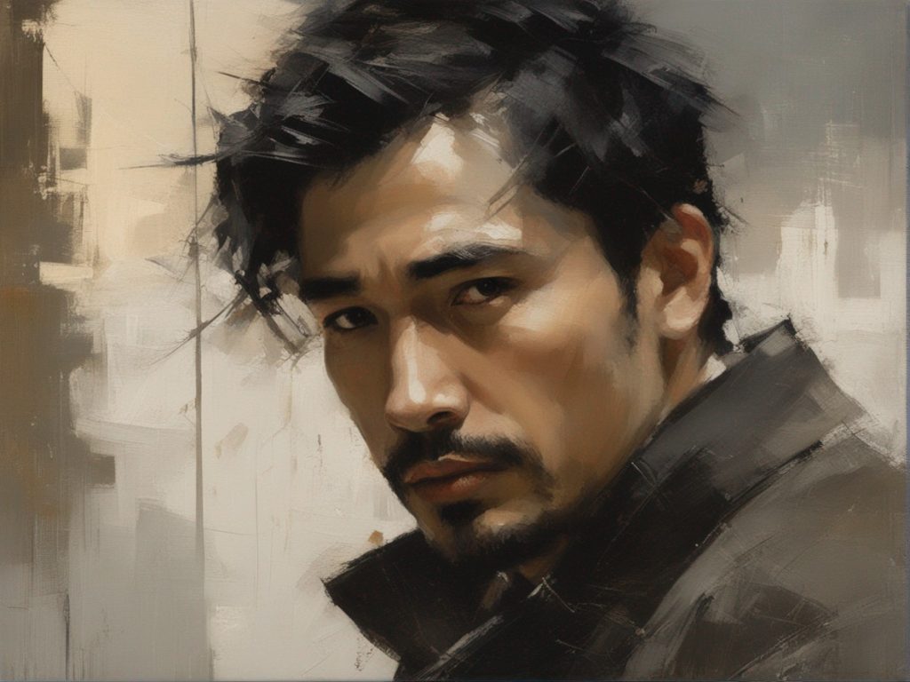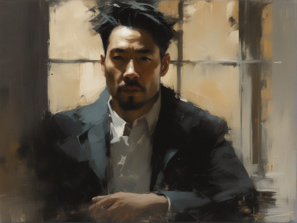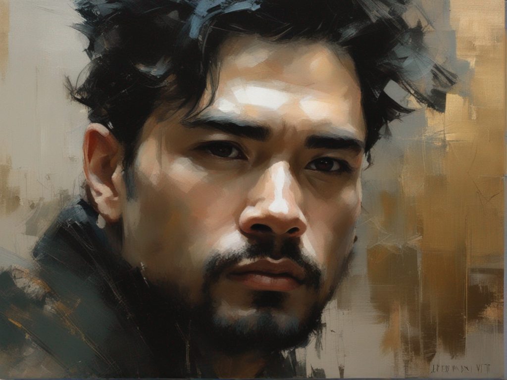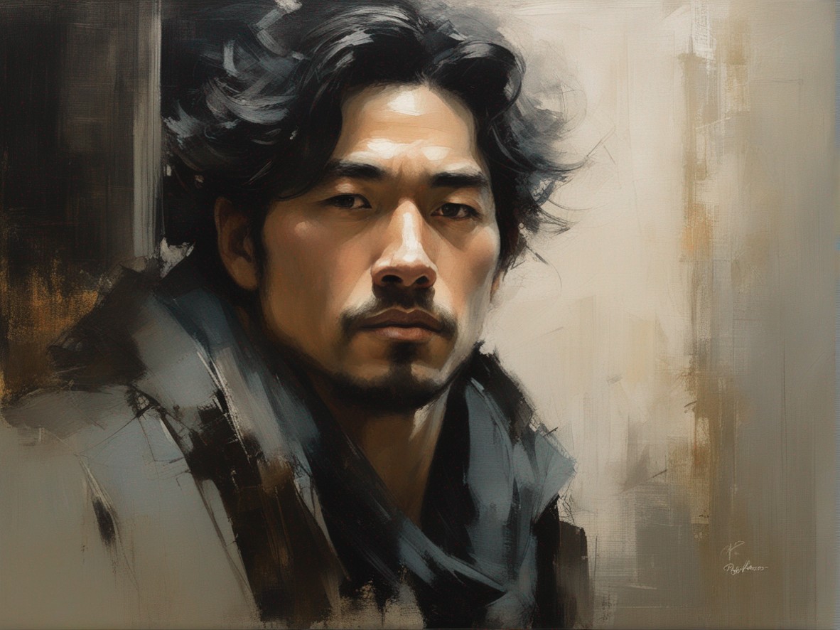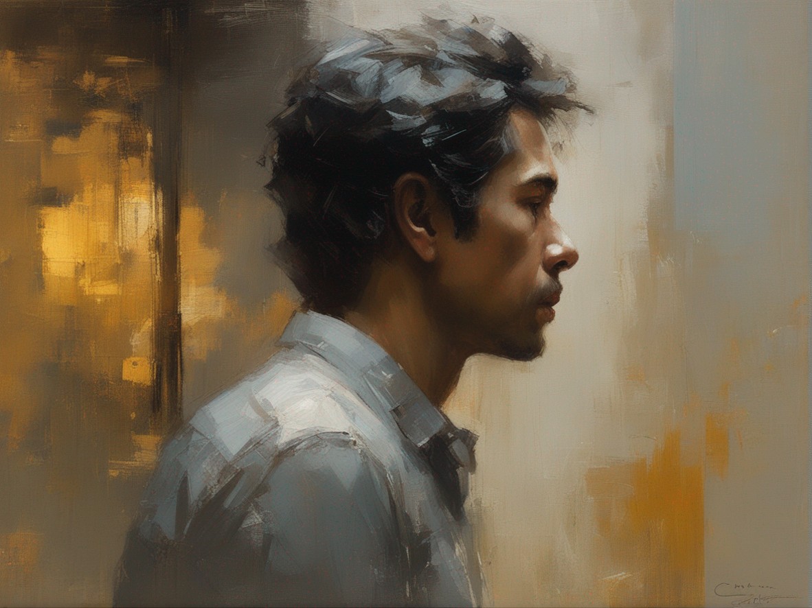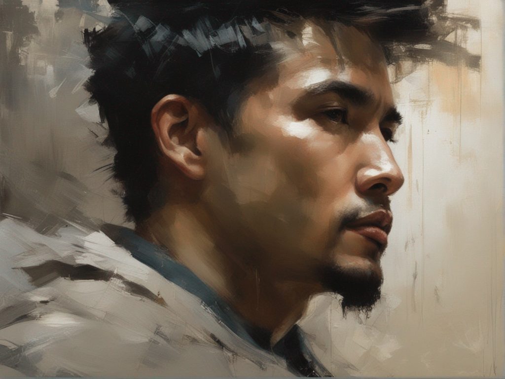 ハッシュタグ: #肖像画,#視線,#思慮深い,#内省,#静寂,#力強い筆使い,#感情の深み,#抽象的背景,#人間の感情