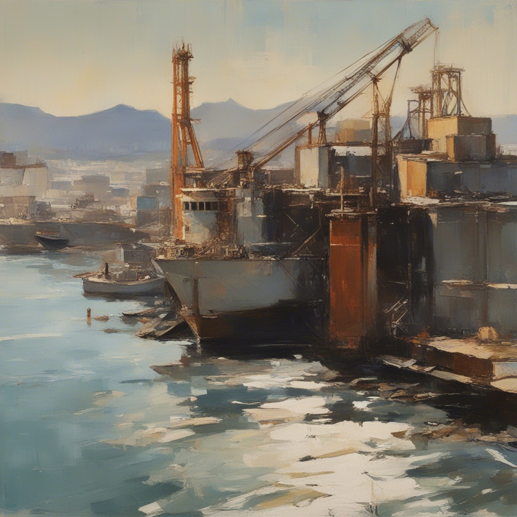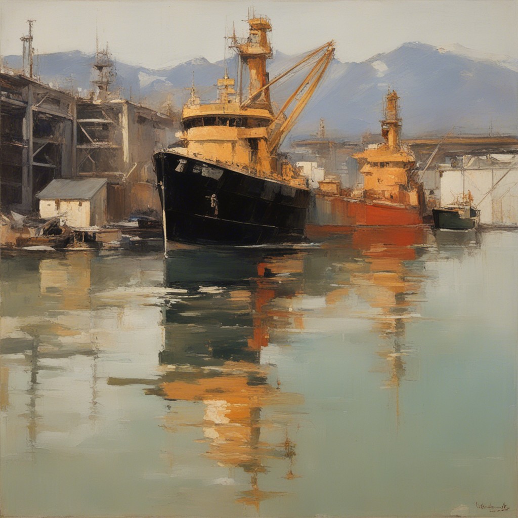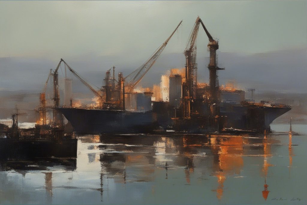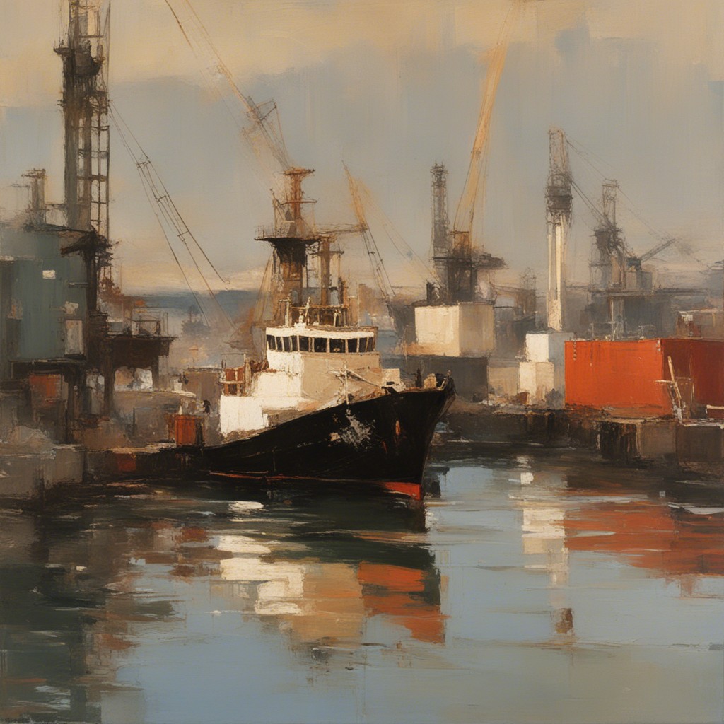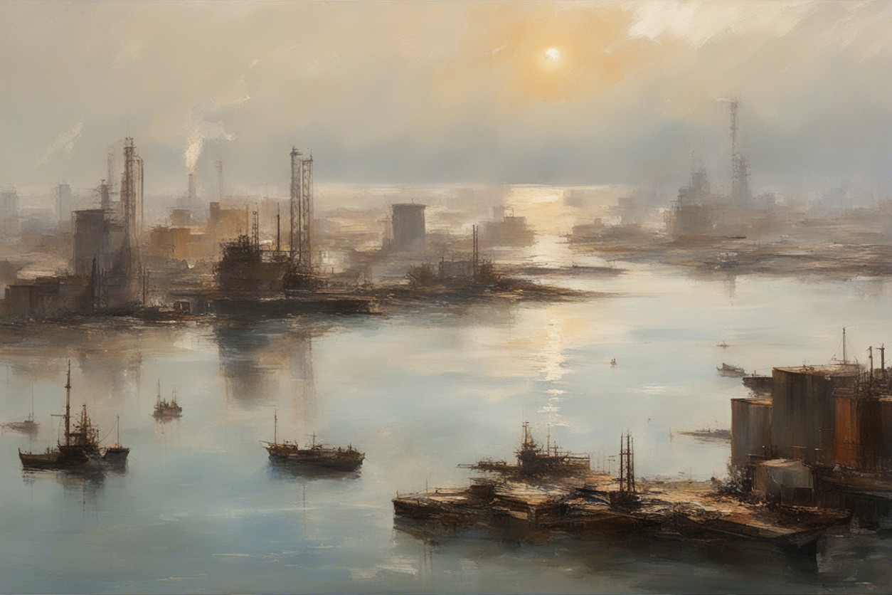 柔らかい光が差し込む港町を捉えています。遠くに広がる山並みと、海面に反射する光が穏やかな一日の始まりを予感させます。港に停泊する船々と、そこで働く人々の活動が始まる瞬間を描き、産業の営みと自然の調和を表現しています。この作品は、ウィリアム・ターナーのような光の使い方と、マイケル・カーソンのスタイルを思わせる筆致で、港の生命力と美しさを見事に描き出しています。