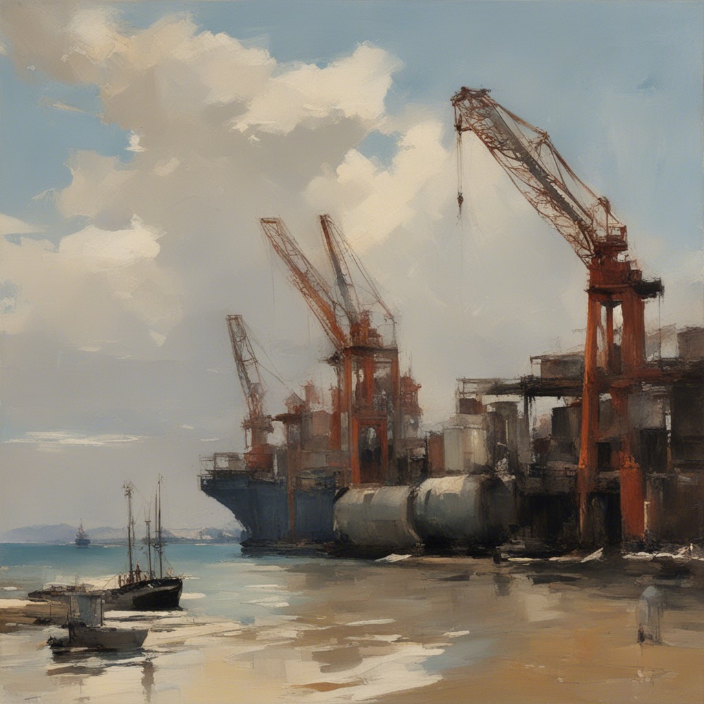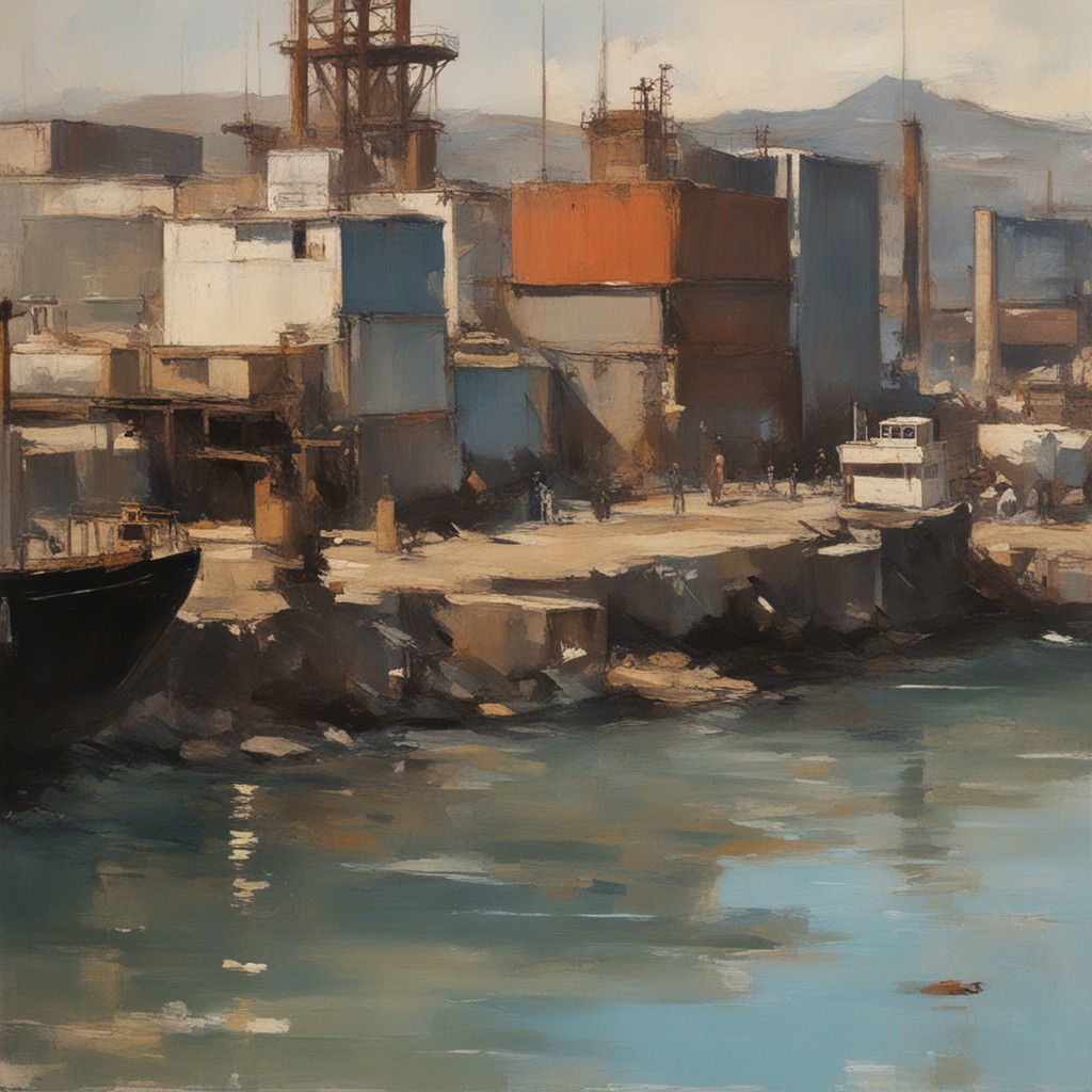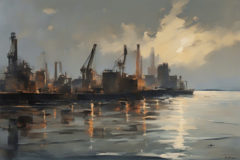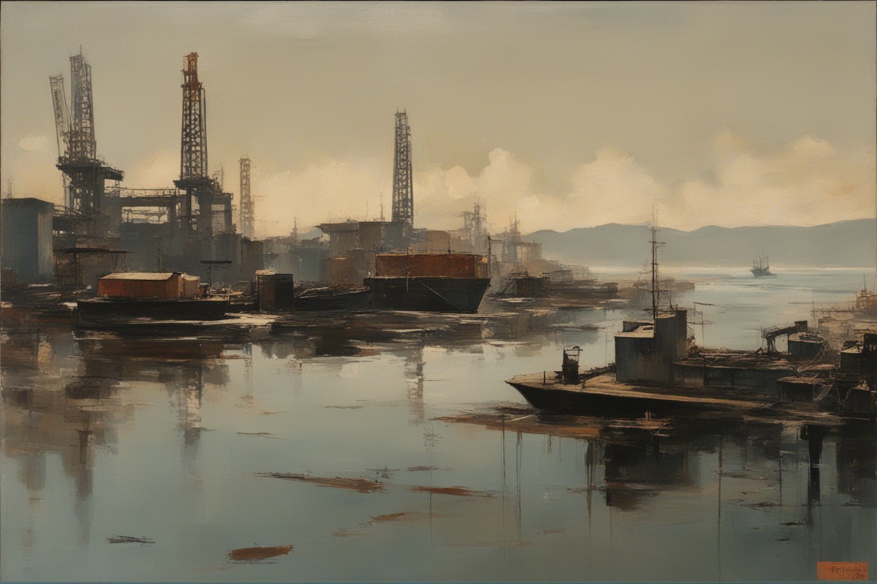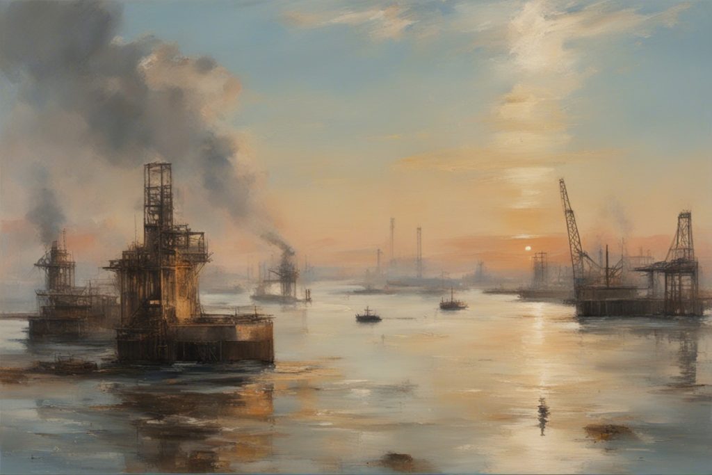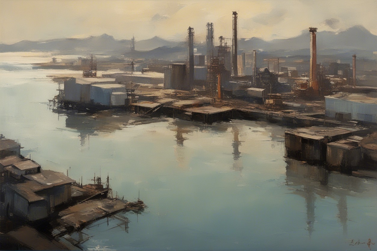 柔らかい光が差し込む港町を捉えています。遠くに広がる山並みと、海面に反射する光が穏やかな一日の始まりを予感させます。港に停泊する船々と、そこで働く人々の活動が始まる瞬間を描き、産業の営みと自然の調和を表現しています。この作品は、ウィリアム・ターナーのような光の使い方と、マイケル・カーソンのスタイルを思わせる筆致で、港の生命力と美しさを見事に描き出しています。