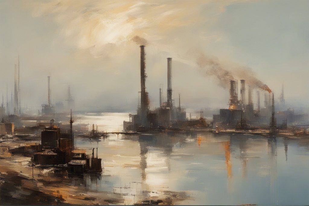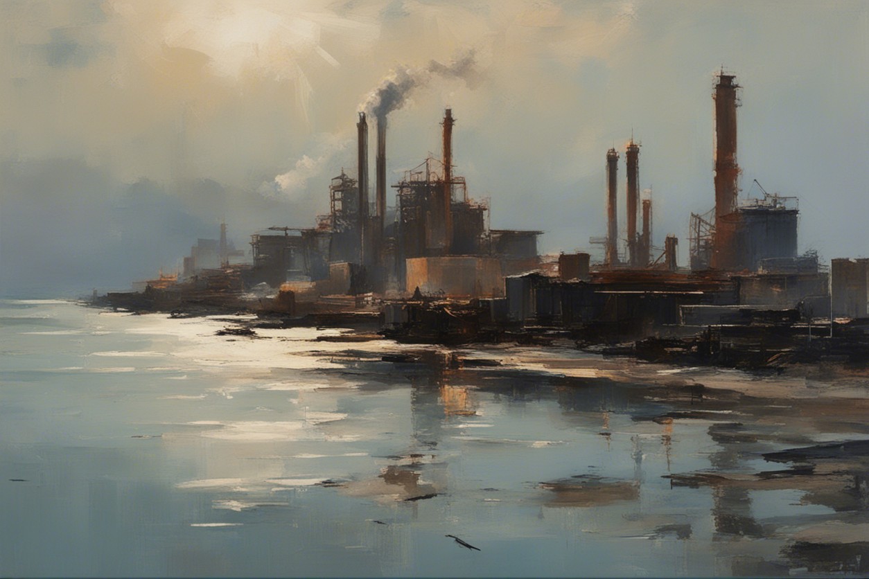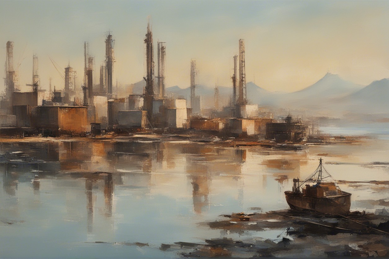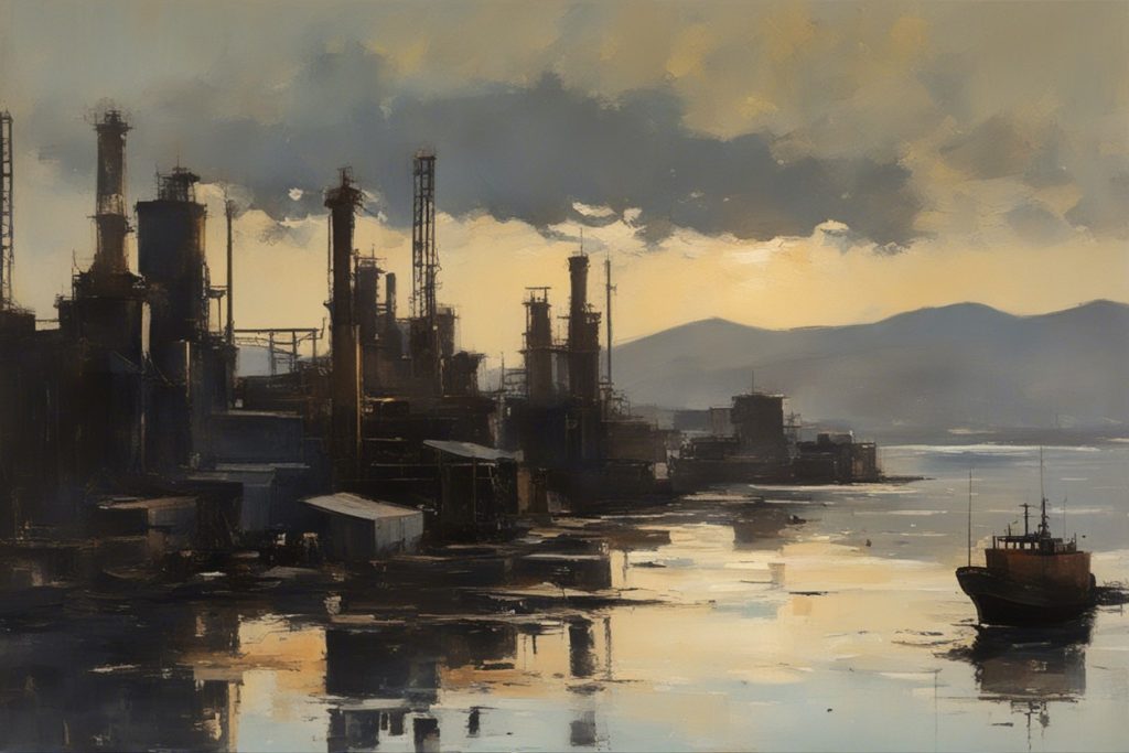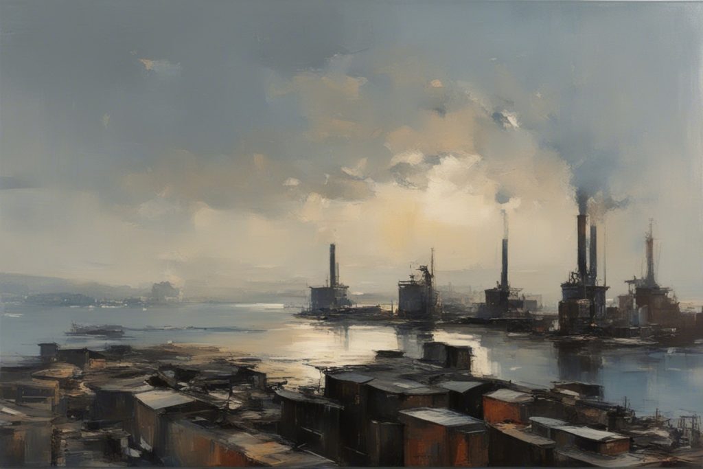 柔らかい光が差し込む港町を捉えています。遠くに広がる山並みと、海面に反射する光が穏やかな一日の始まりを予感させます。港に停泊する船々と、そこで働く人々の活動が始まる瞬間を描き、産業の営みと自然の調和を表現しています。この作品は、ウィリアム・ターナーのような光の使い方と、マイケル・カーソンのスタイルを思わせる筆致で、港の生命力と美しさを見事に描き出しています。