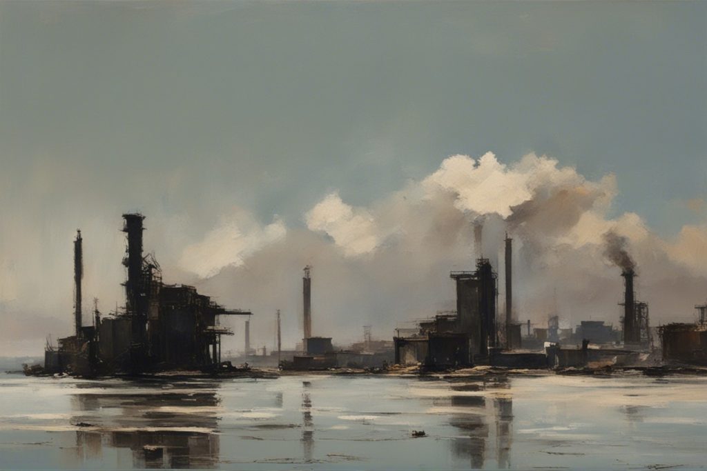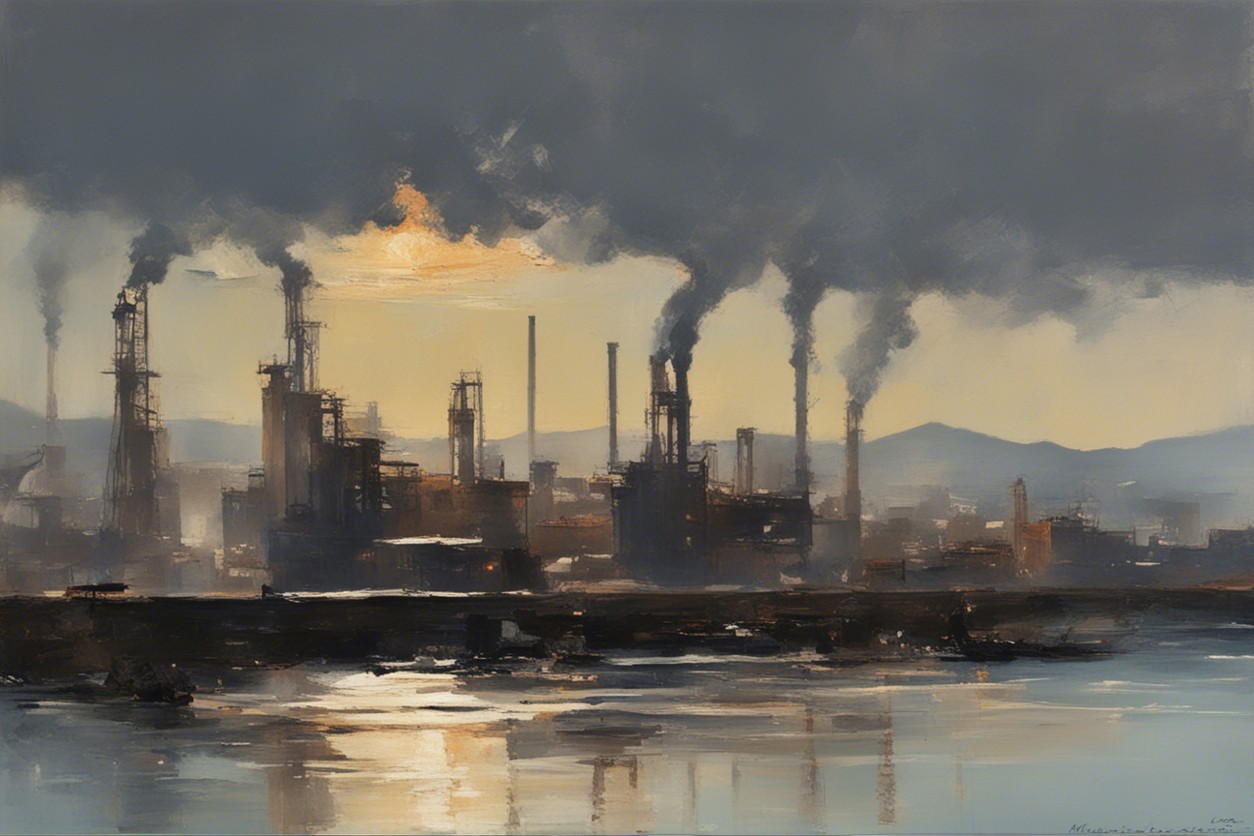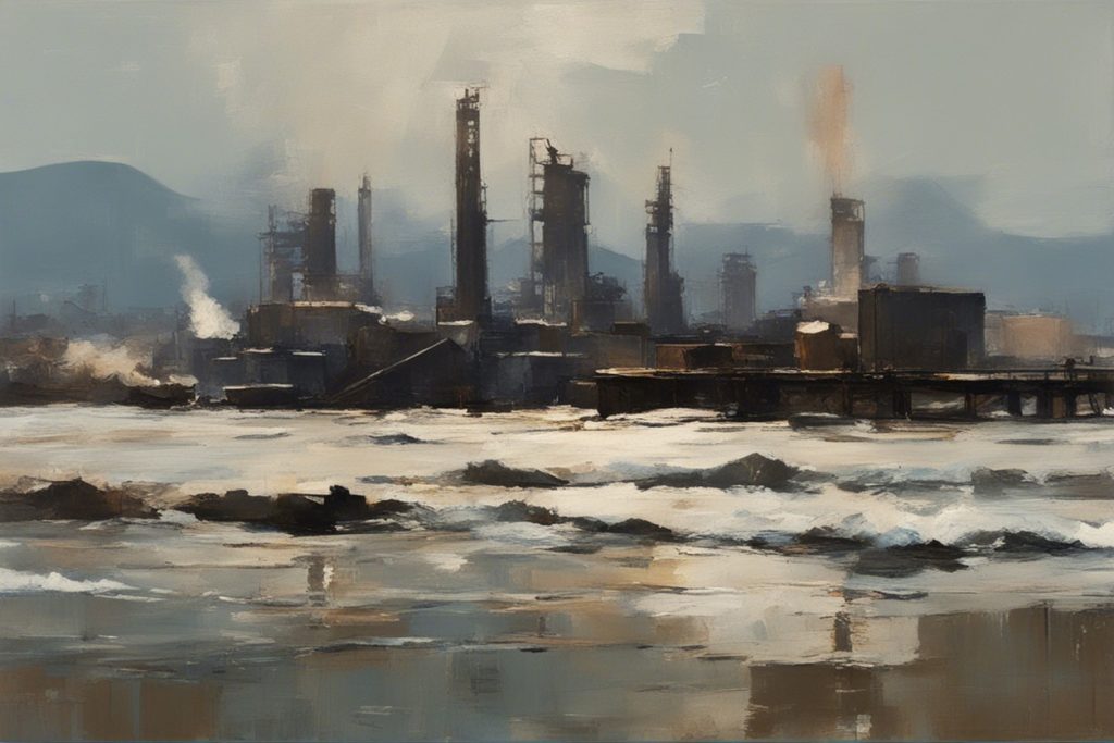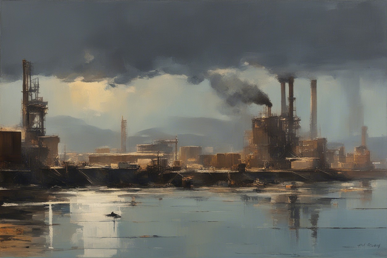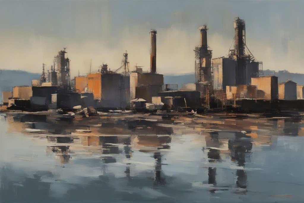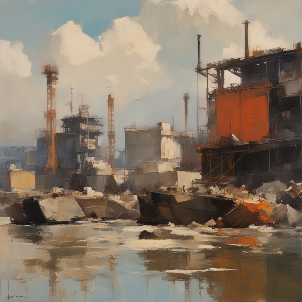 柔らかい光が差し込む港町を捉えています。遠くに広がる山並みと、海面に反射する光が穏やかな一日の始まりを予感させます。港に停泊する船々と、そこで働く人々の活動が始まる瞬間を描き、産業の営みと自然の調和を表現しています。この作品は、ウィリアム・ターナーのような光の使い方と、マイケル・カーソンのスタイルを思わせる筆致で、港の生命力と美しさを見事に描き出しています。