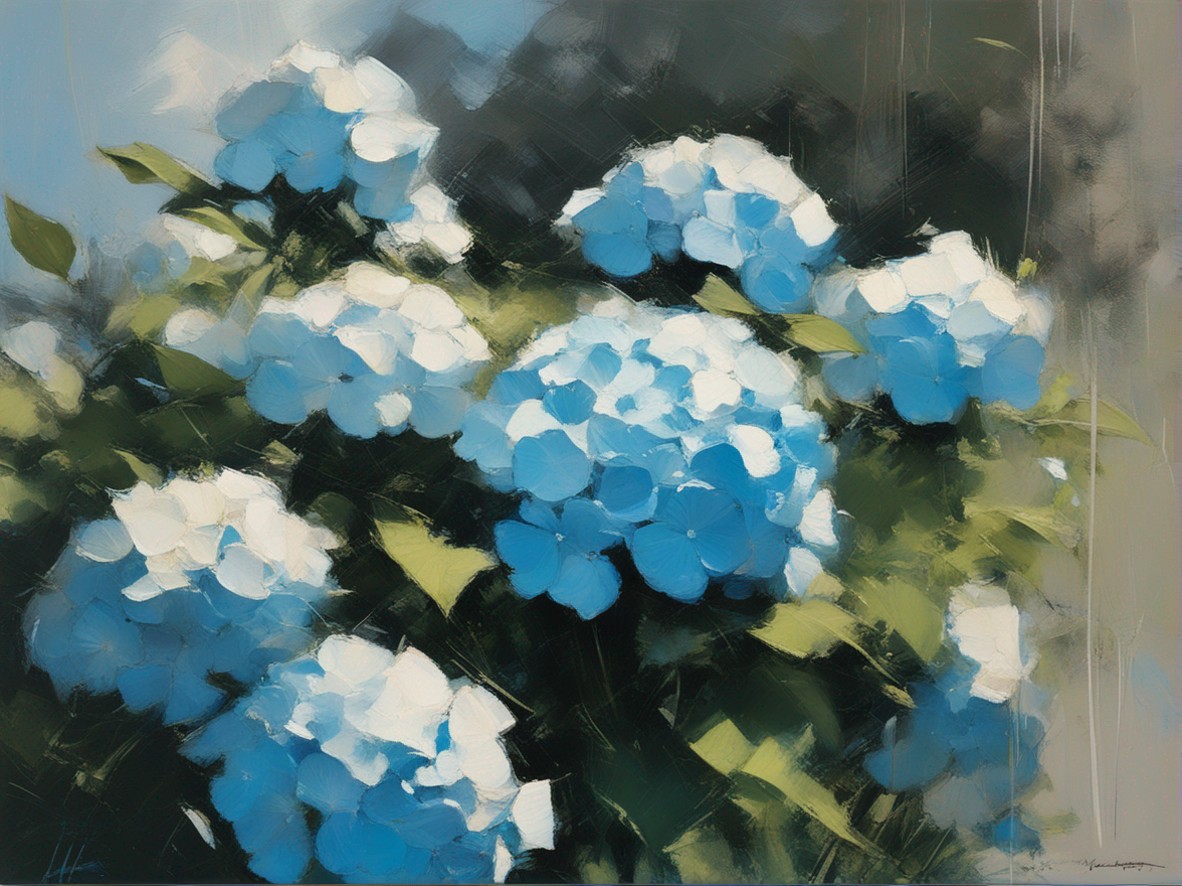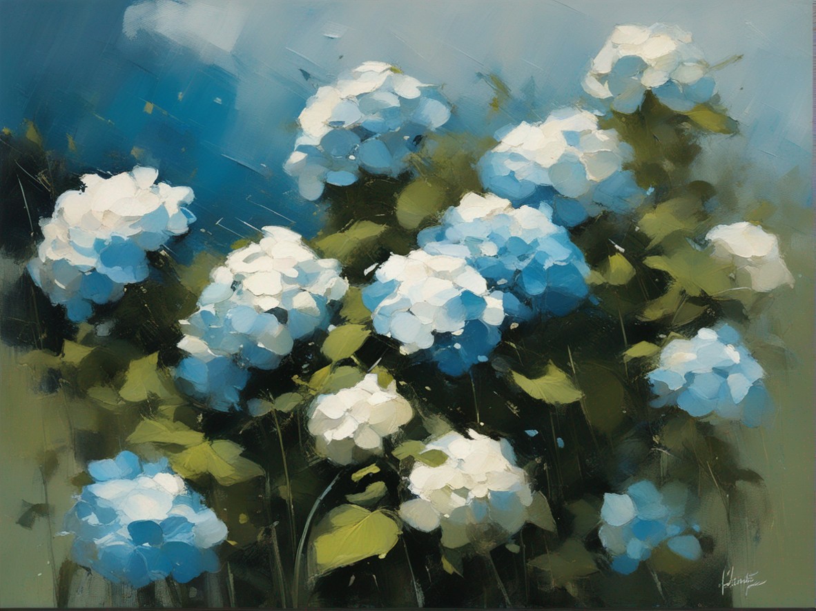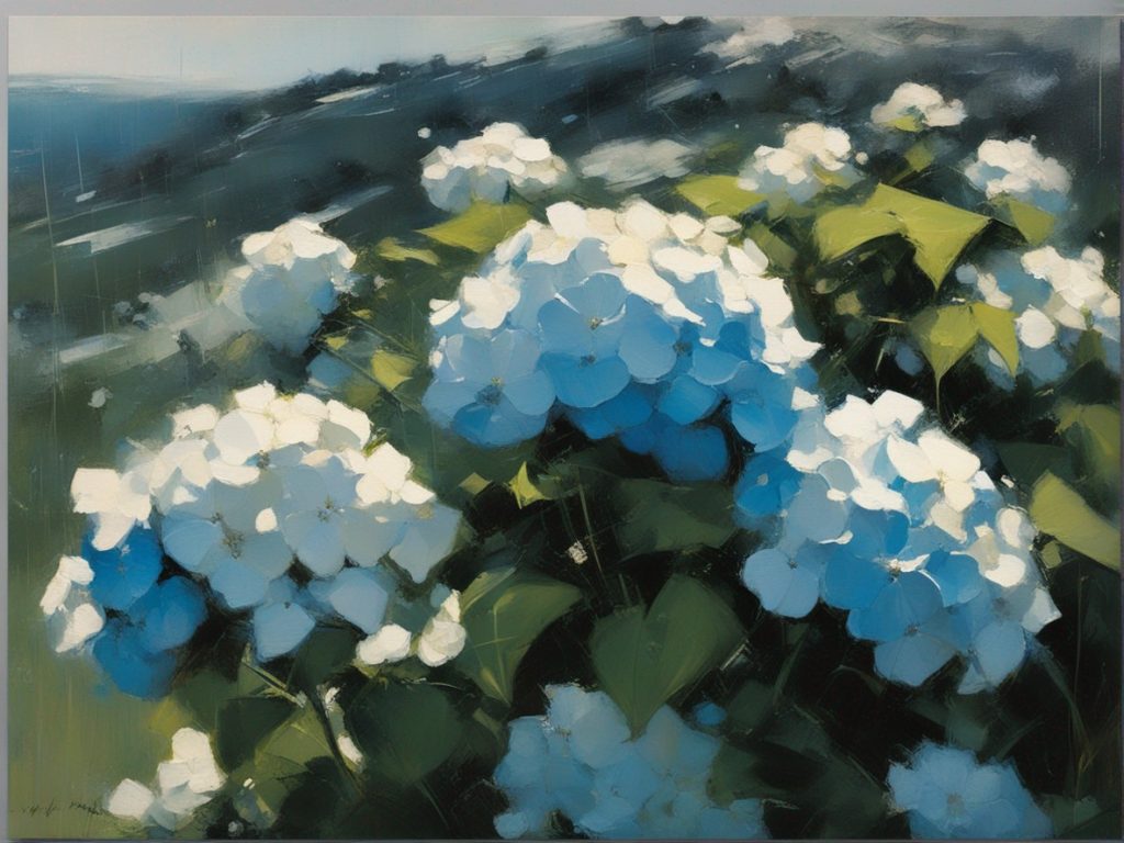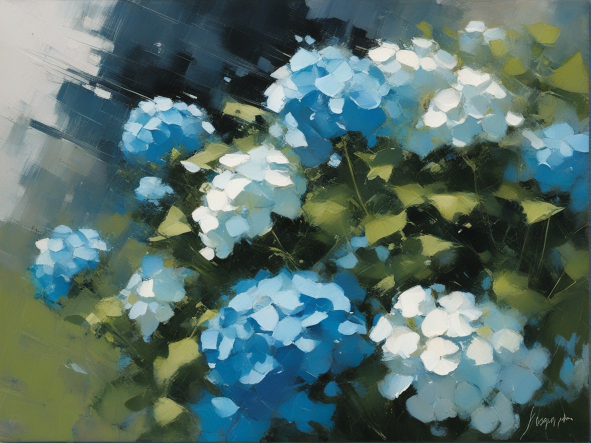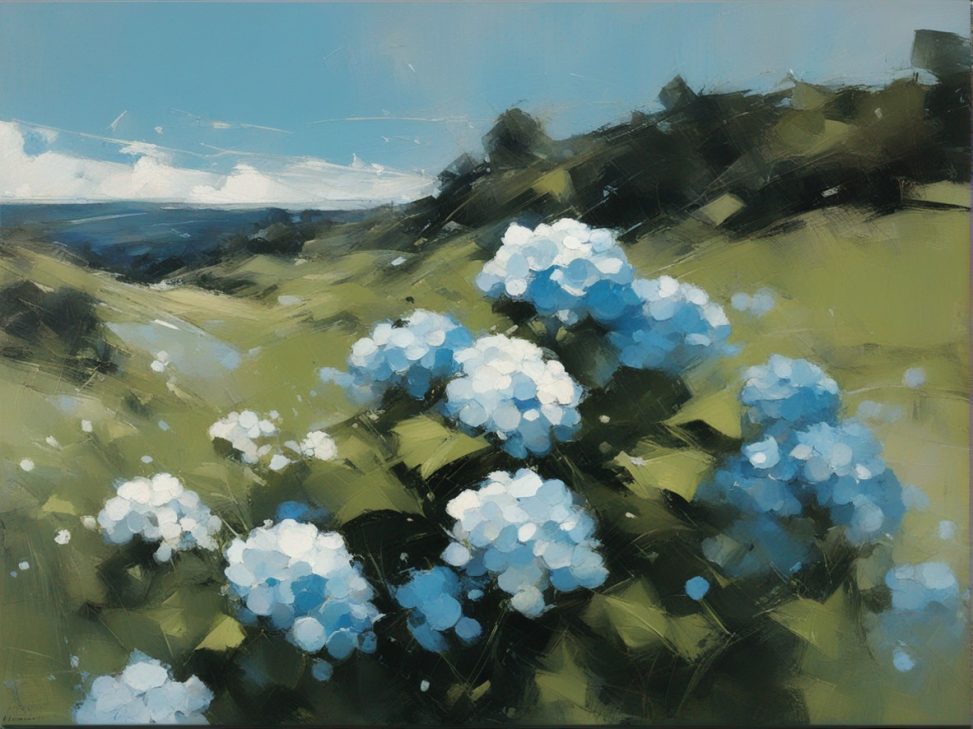 青く澄んだ空の下に広がる紫陽花の丘を描いた風景画です。大胆かつリニアな筆のタッチで表現された紫陽花は、豊かな青と白の色彩でキャンバスに活力を与えています。遠景には穏やかな空と地平線が見え、心地よい夏の日を感じさせます。この絵は、自然の美しさと季節の移ろいを捉え、見る者に静かな喜びと安らぎを提供します。紫陽花の花々が風にそよぐ様子が、生き生きと描かれており、日常から離れた場所へと誘います。