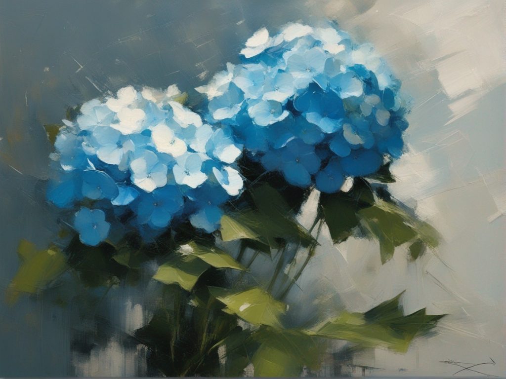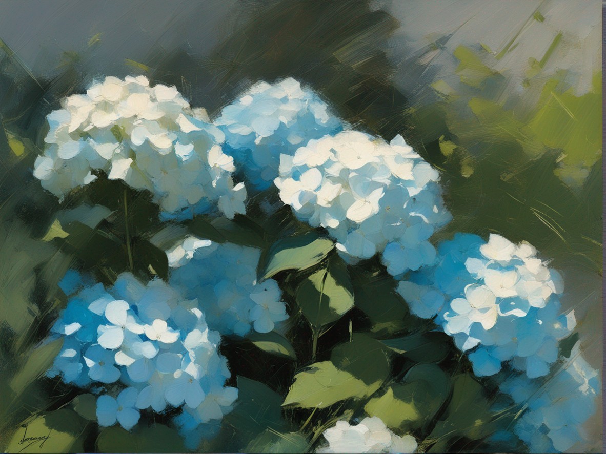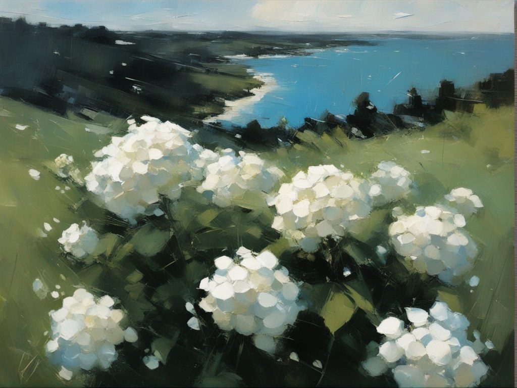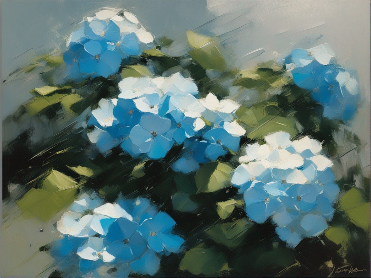 青く澄んだ空の下に広がる紫陽花の丘を描いた風景画です。大胆かつリニアな筆のタッチで表現された紫陽花は、豊かな青と白の色彩でキャンバスに活力を与えています。遠景には穏やかな空と地平線が見え、心地よい夏の日を感じさせます。この絵は、自然の美しさと季節の移ろいを捉え、見る者に静かな喜びと安らぎを提供します。紫陽花の花々が風にそよぐ様子が、生き生きと描かれており、日常から離れた場所へと誘います。