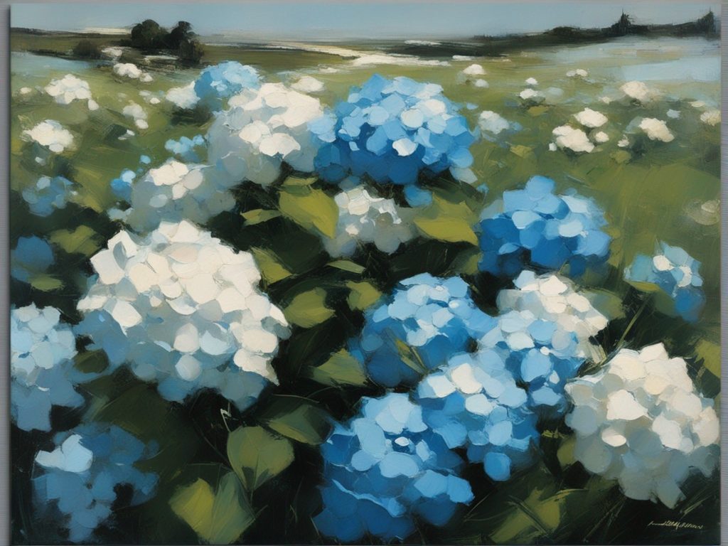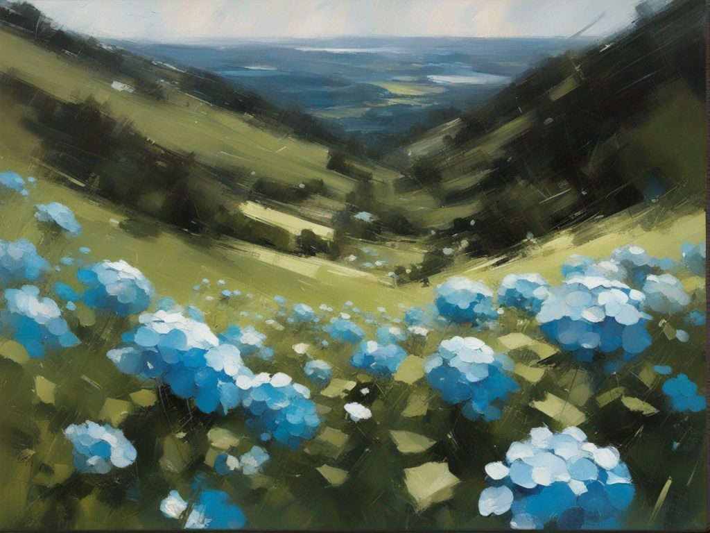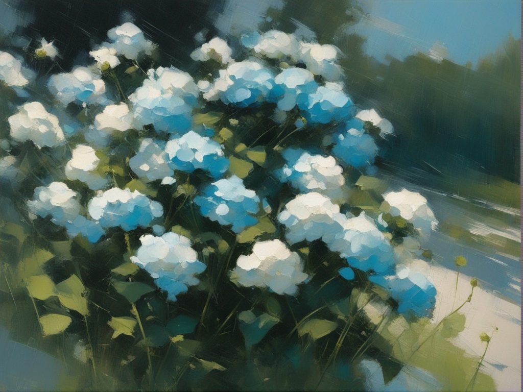ハッシュタグ: #風景画,#紫陽花,#青空,#夏の日,#自然,#豊かな色彩,#地平線,#心地よい,#安らぎ