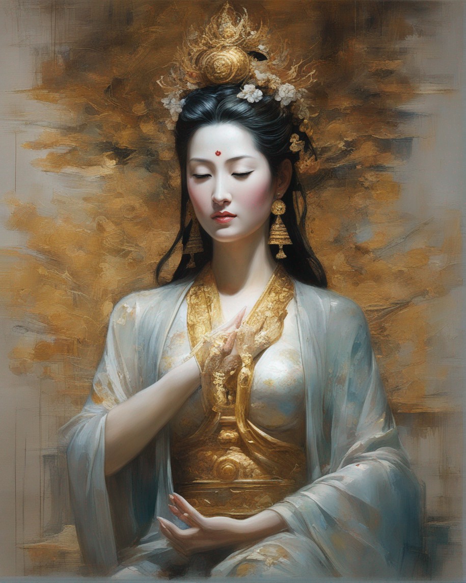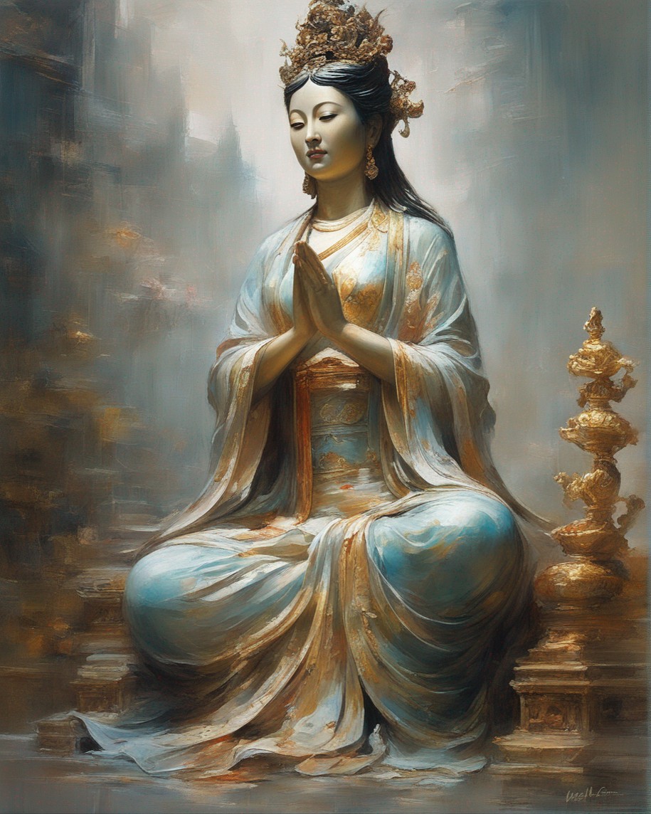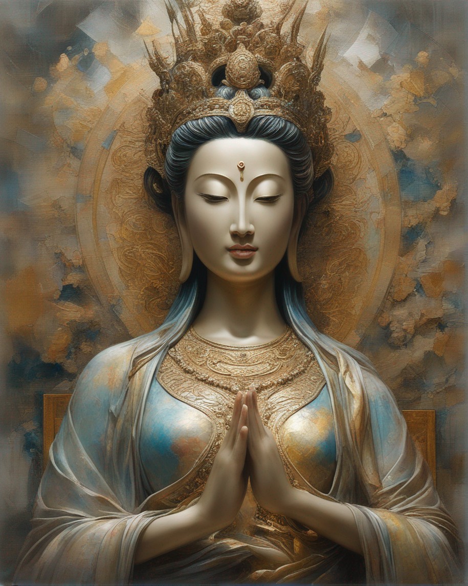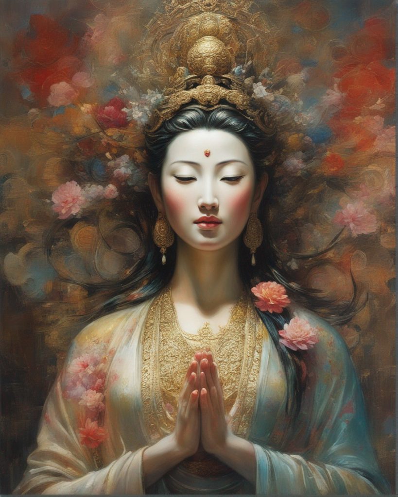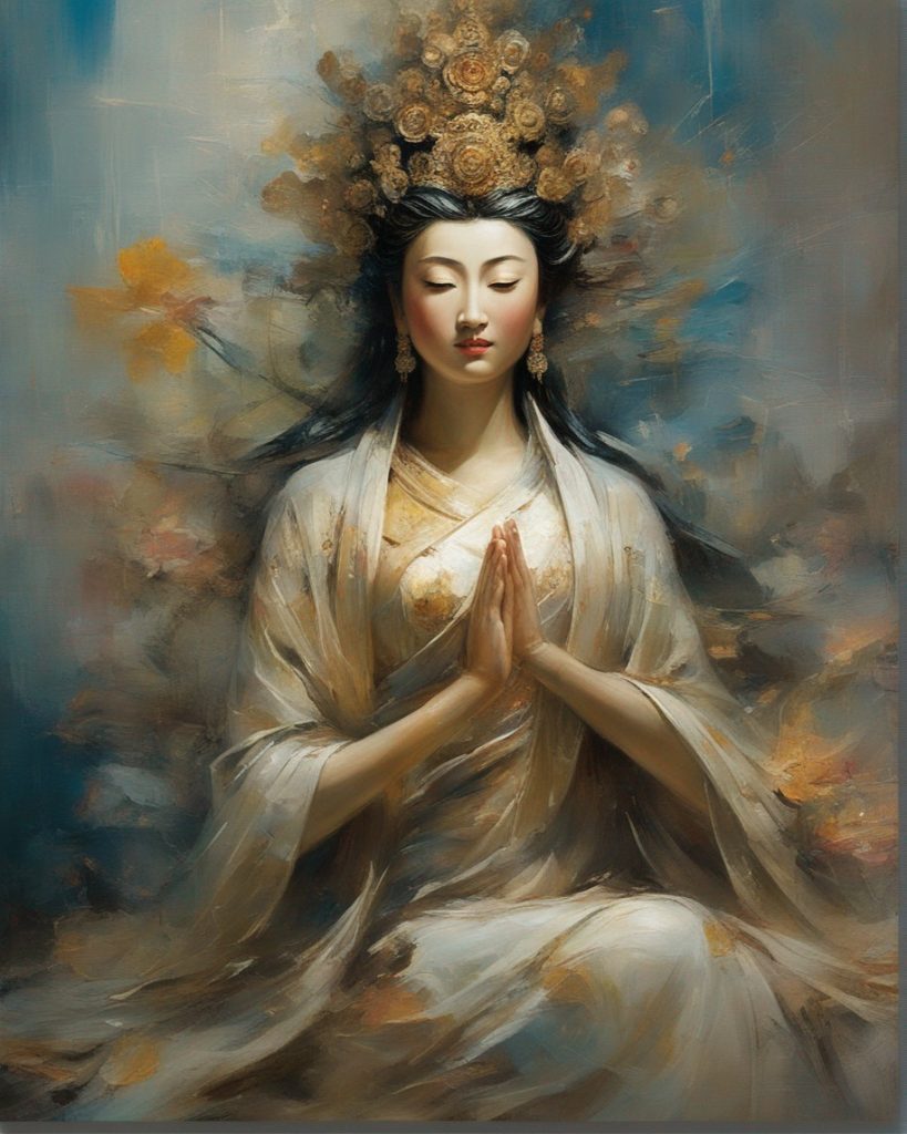 ハッシュタグ: #宗教画,#観音菩薩,#慈愛,#慈悲,#合掌,#精神性,#平和,#心の安らぎ,#共感