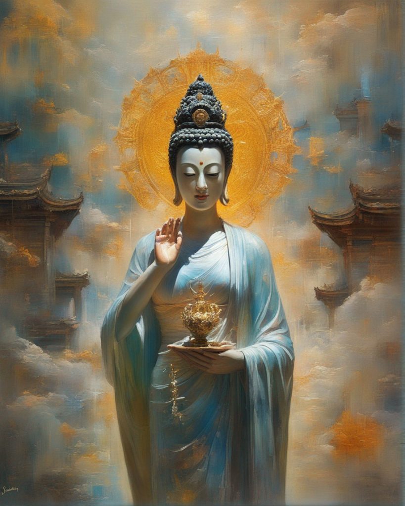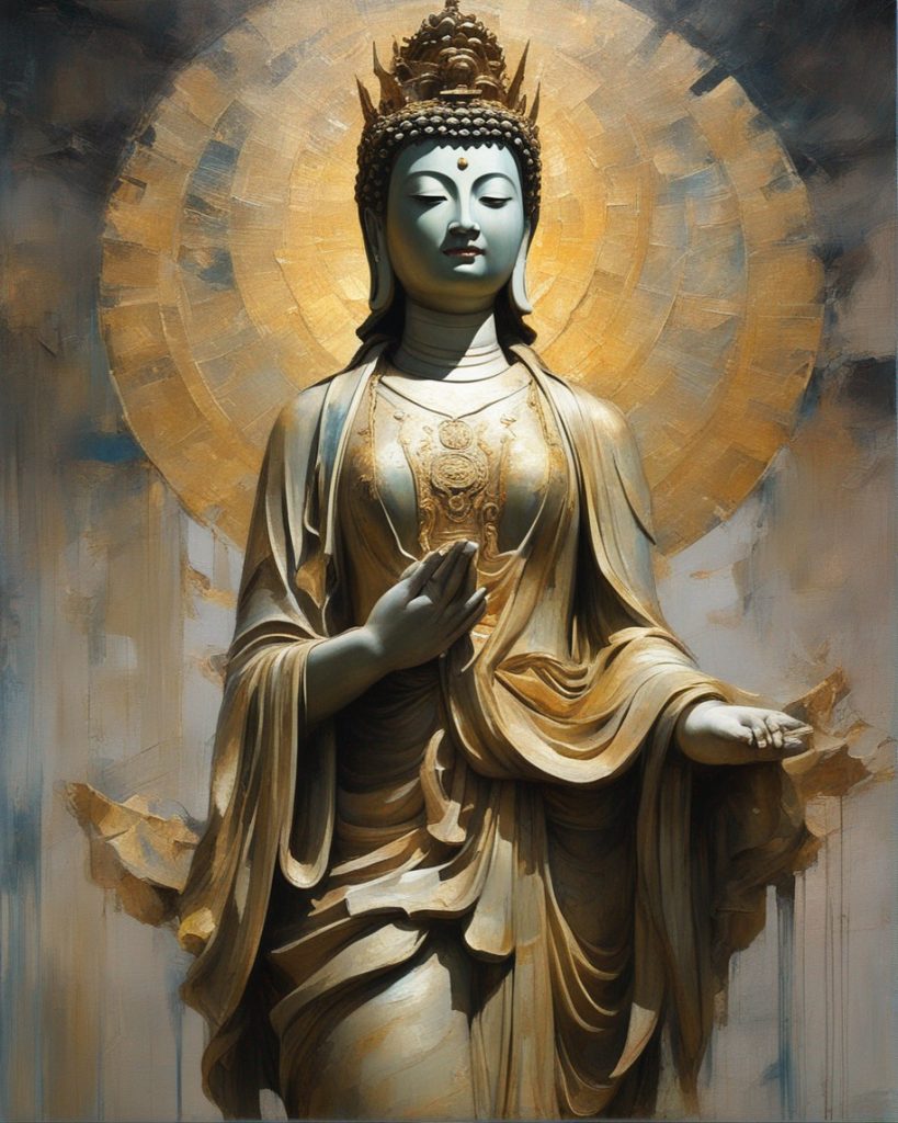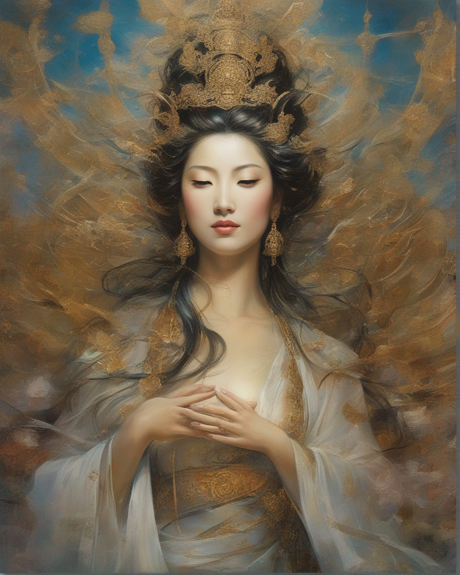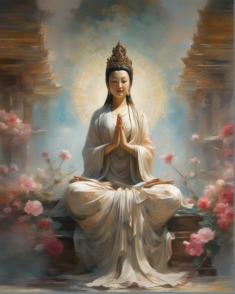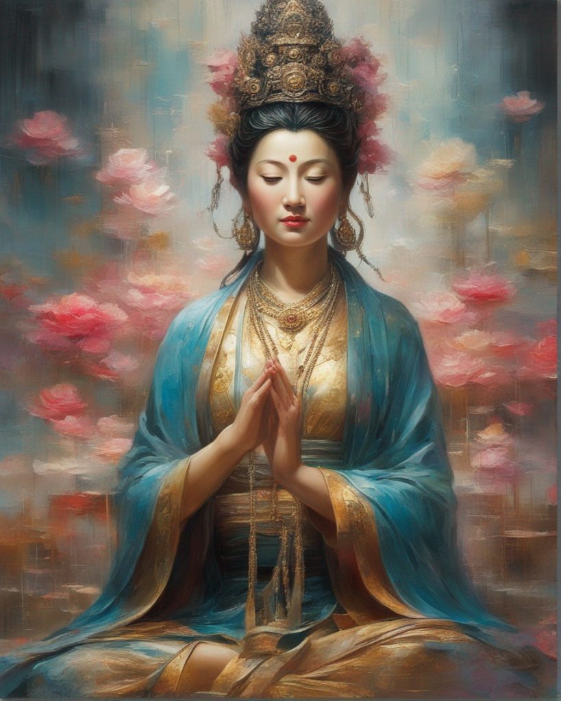 ハッシュタグ: #宗教画,#観音菩薩,#慈愛,#慈悲,#合掌,#精神性,#平和,#心の安らぎ,#共感