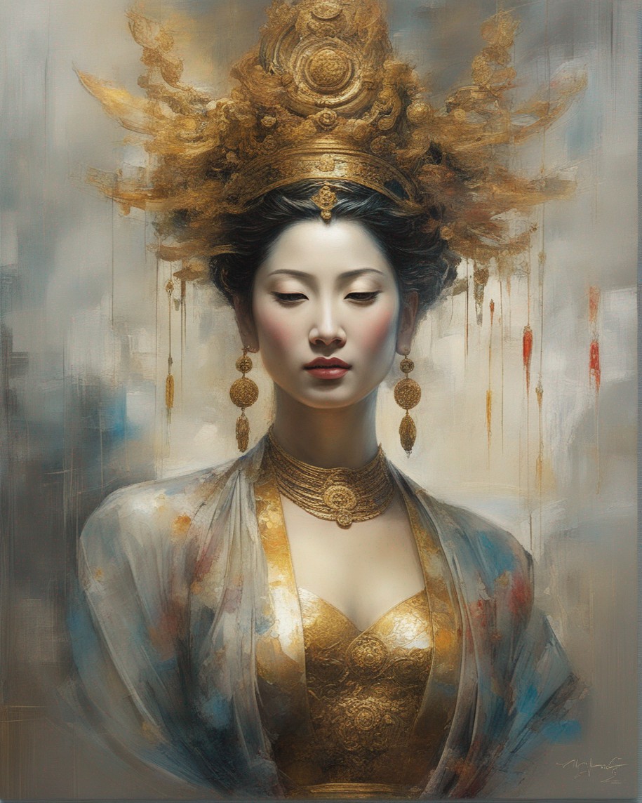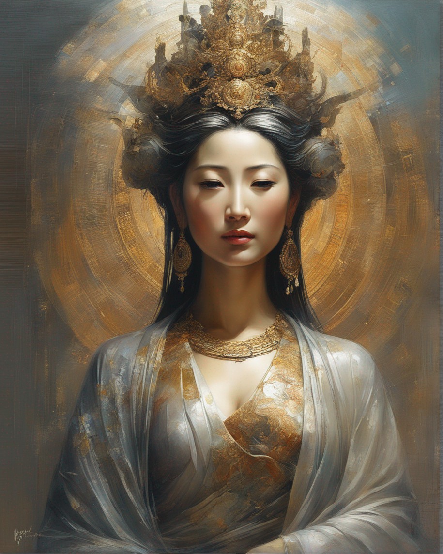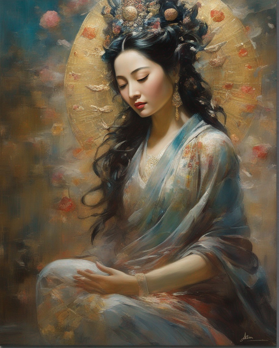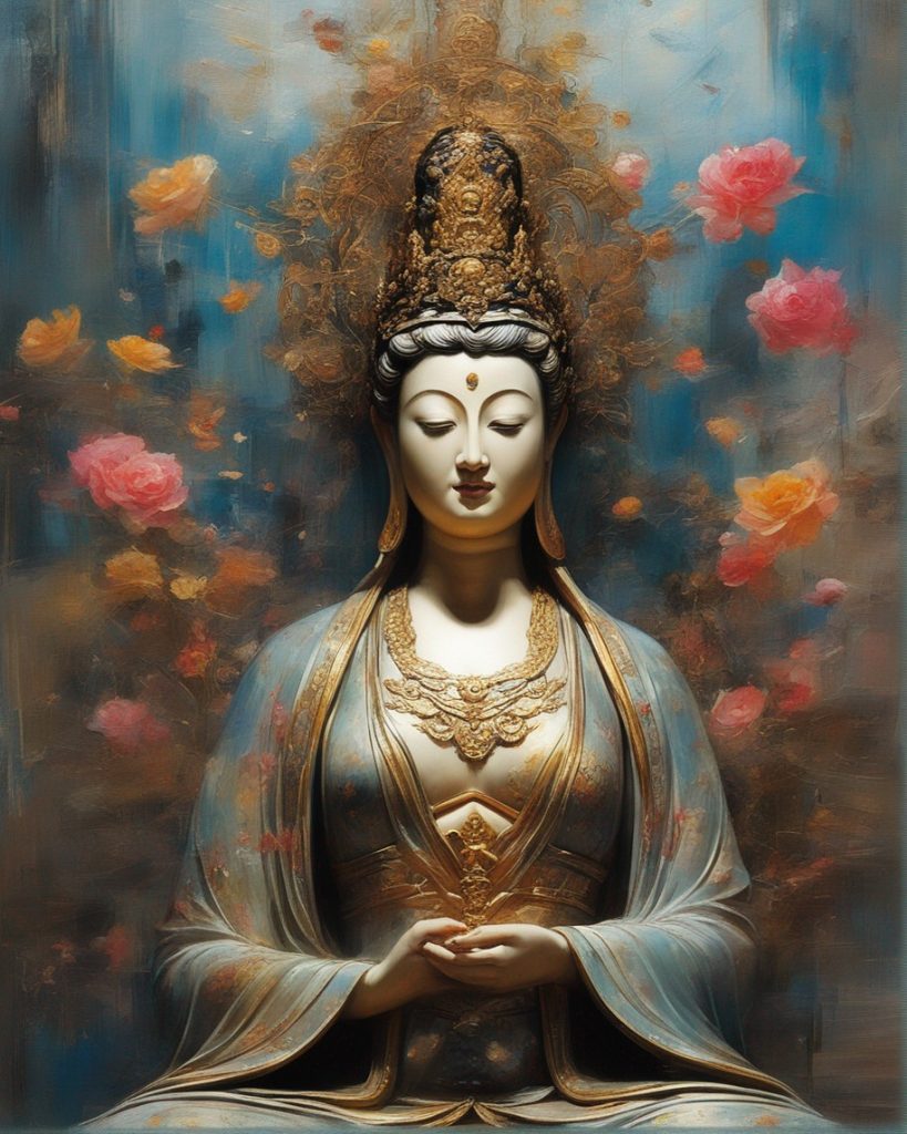 慈悲深い観音菩薩を題材とした宗教画です。彼女の穏やかな表情、合掌した姿勢、そして装飾豊かな衣装は、観音の慈愛と慈悲の象徴として表現されています。背後の花々は、暖かさと優しさを放ち、観音の周りの雰囲気に彩りを添えています。この絵は、深い精神性と平和のメッセージを伝え、心の安らぎを求める人々に対して強い共感を呼び起こします。