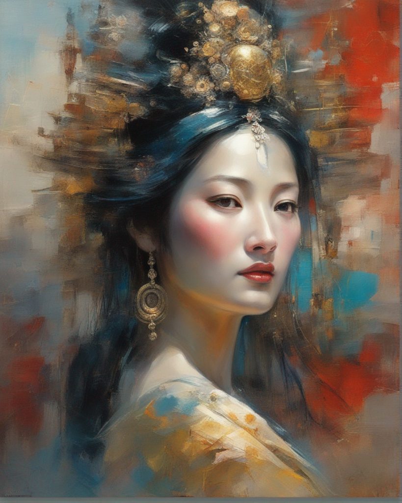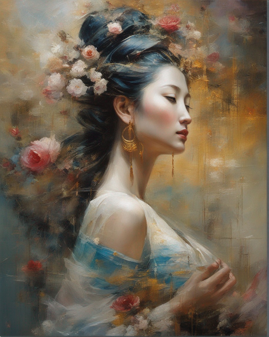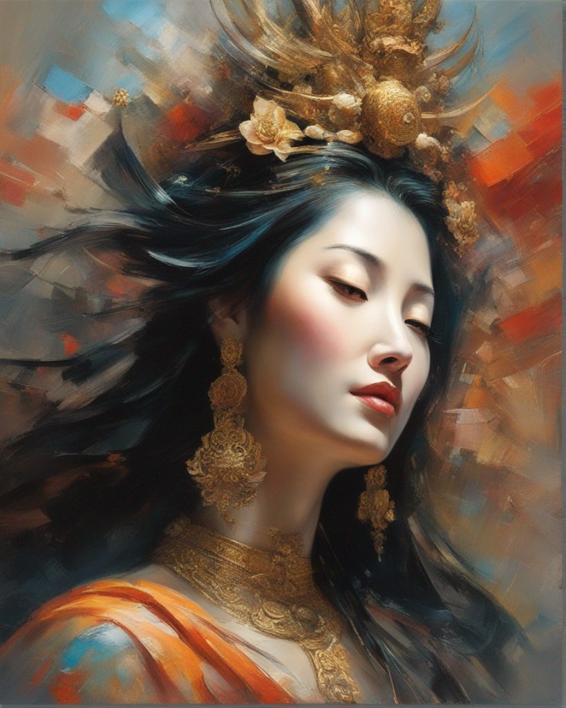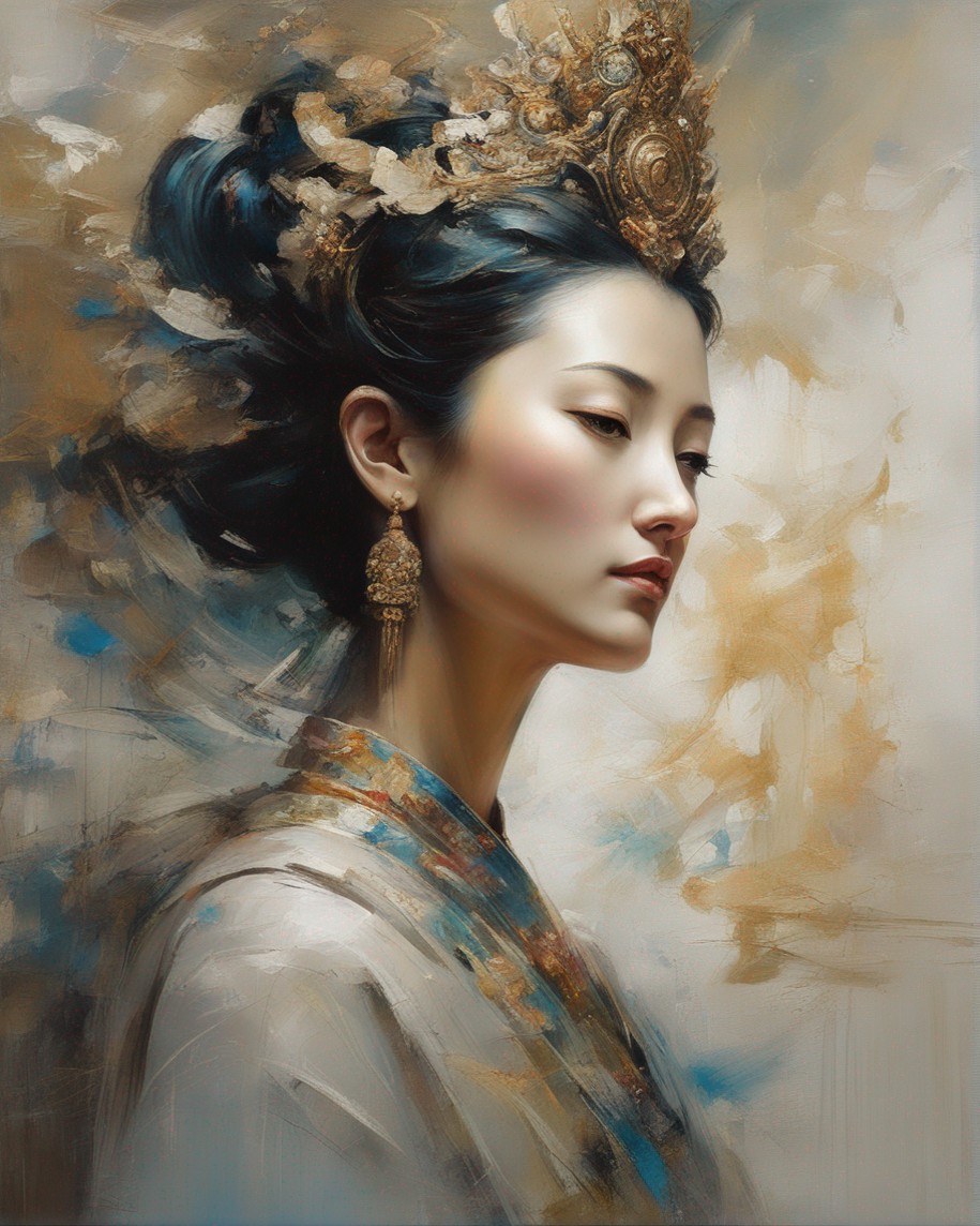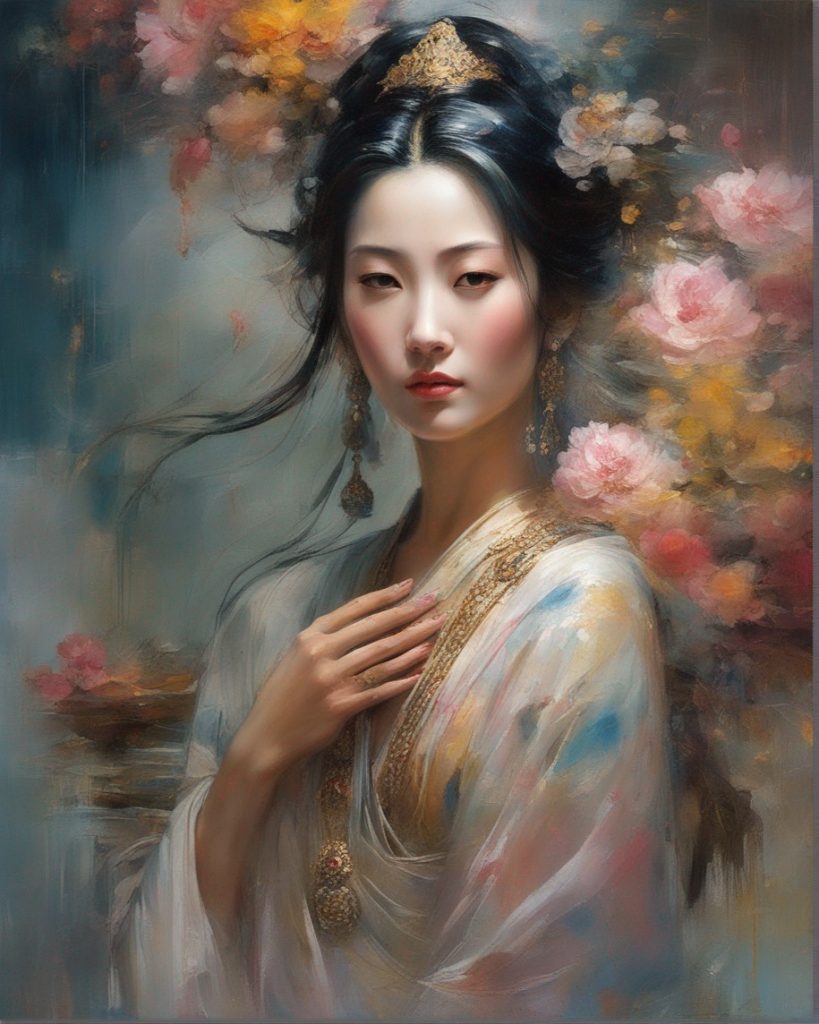 慈悲深い観音菩薩を題材とした宗教画です。彼女の穏やかな表情、合掌した姿勢、そして装飾豊かな衣装は、観音の慈愛と慈悲の象徴として表現されています。背後の花々は、暖かさと優しさを放ち、観音の周りの雰囲気に彩りを添えています。この絵は、深い精神性と平和のメッセージを伝え、心の安らぎを求める人々に対して強い共感を呼び起こします。