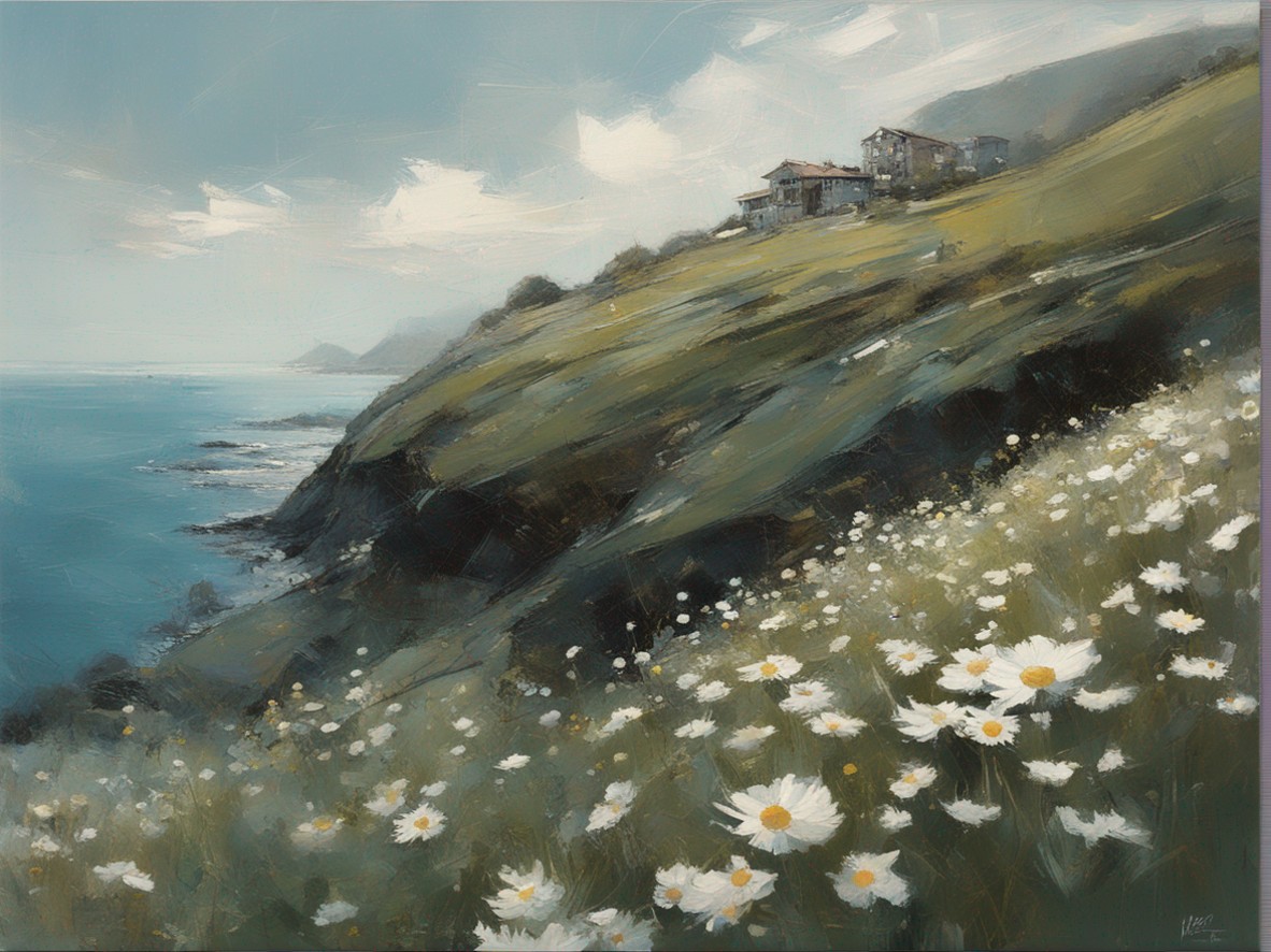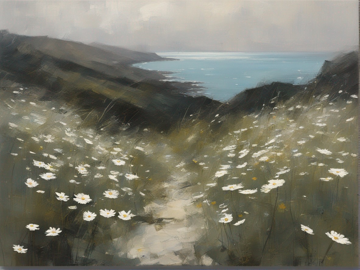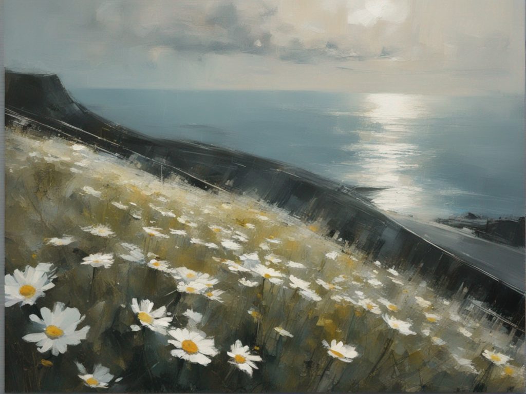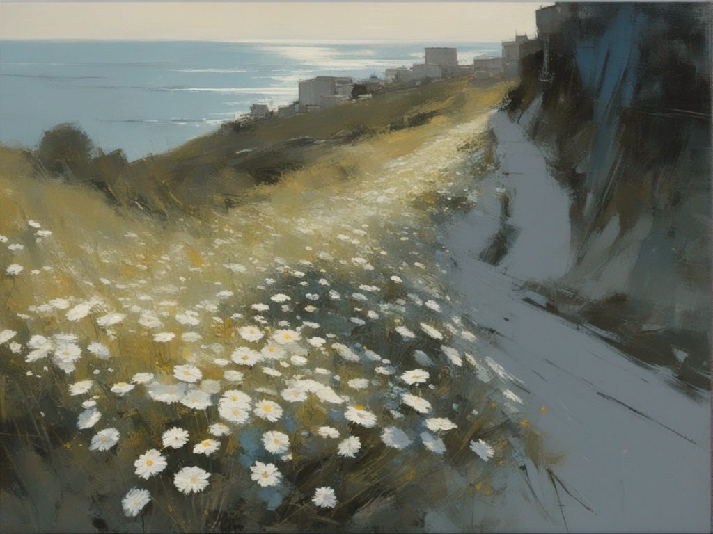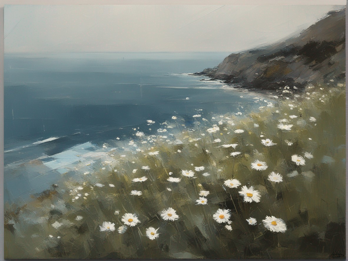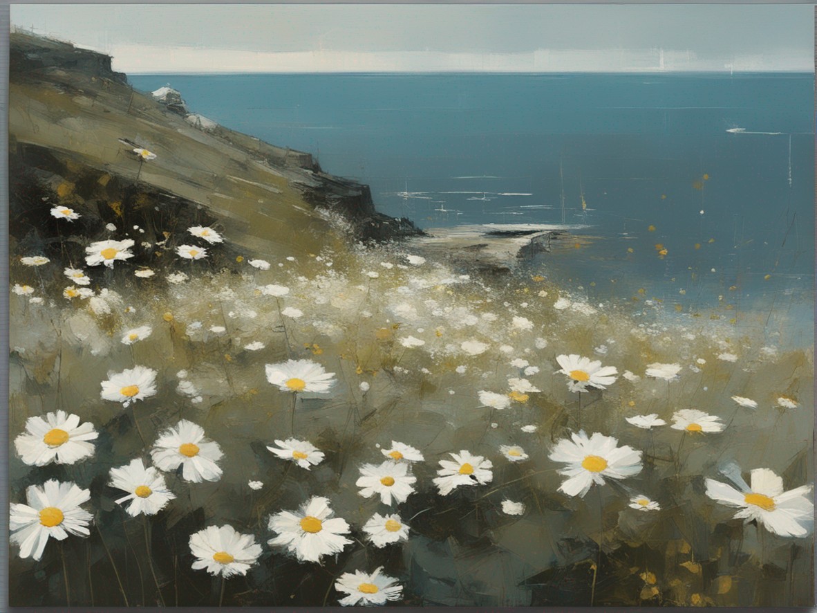 ハッシュタグ: #風景画,#マーガレット,#海峡,#崖,#大胆な筆使い,#自然,#荒々しさ,#生命の儚さ,#穏やかな世界