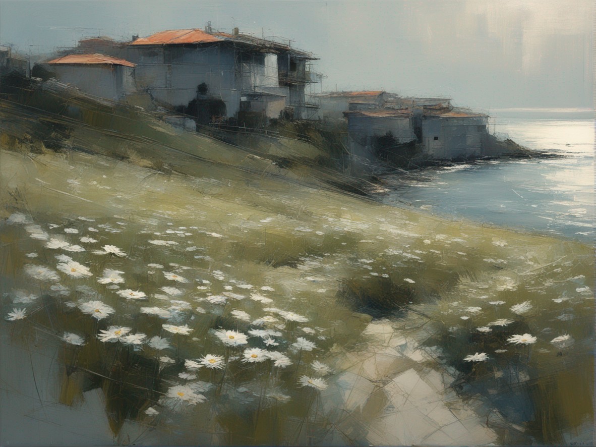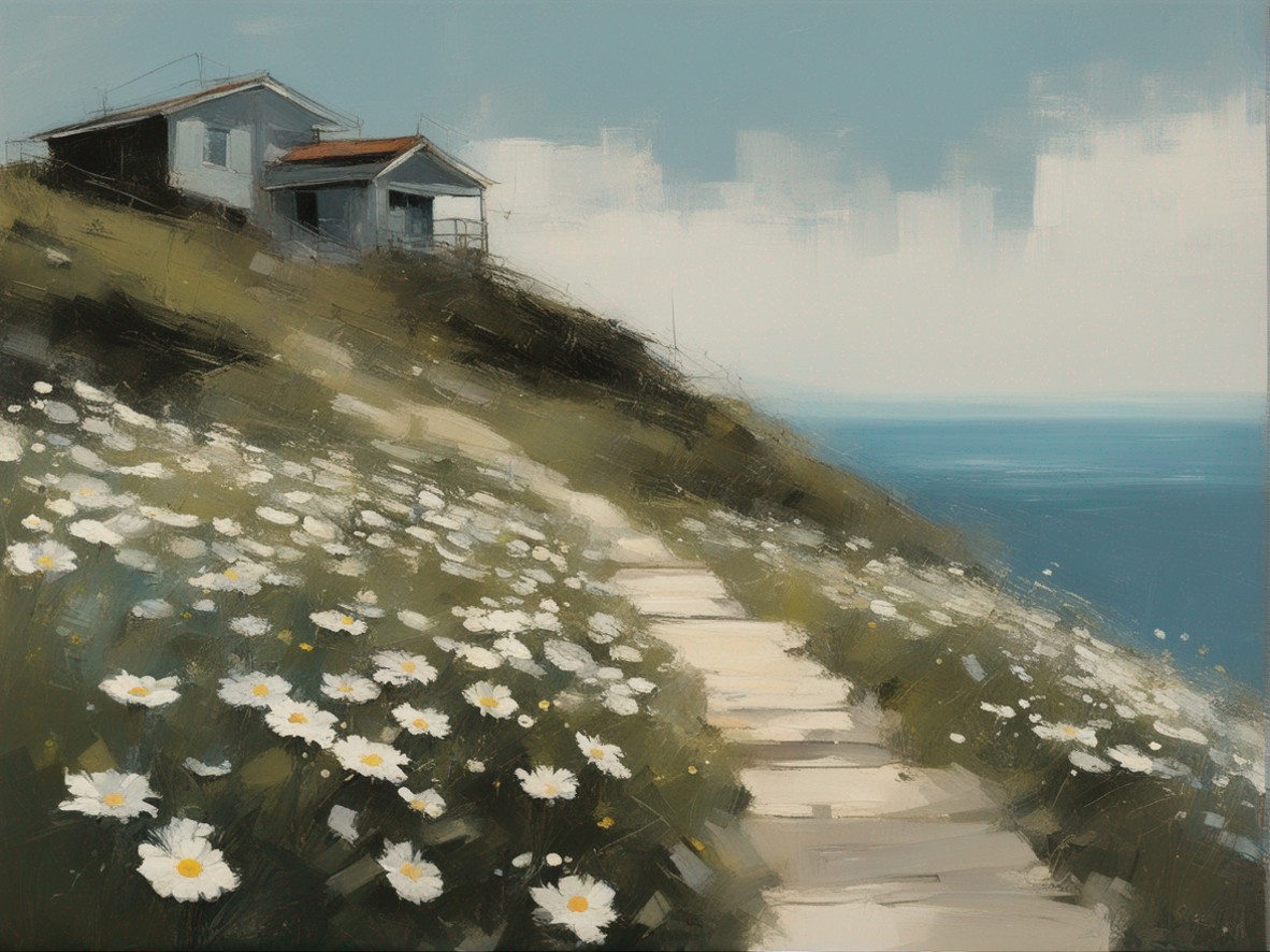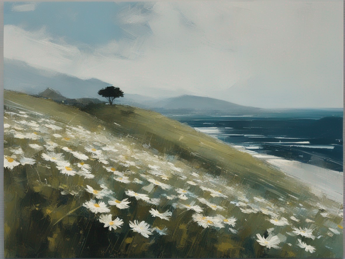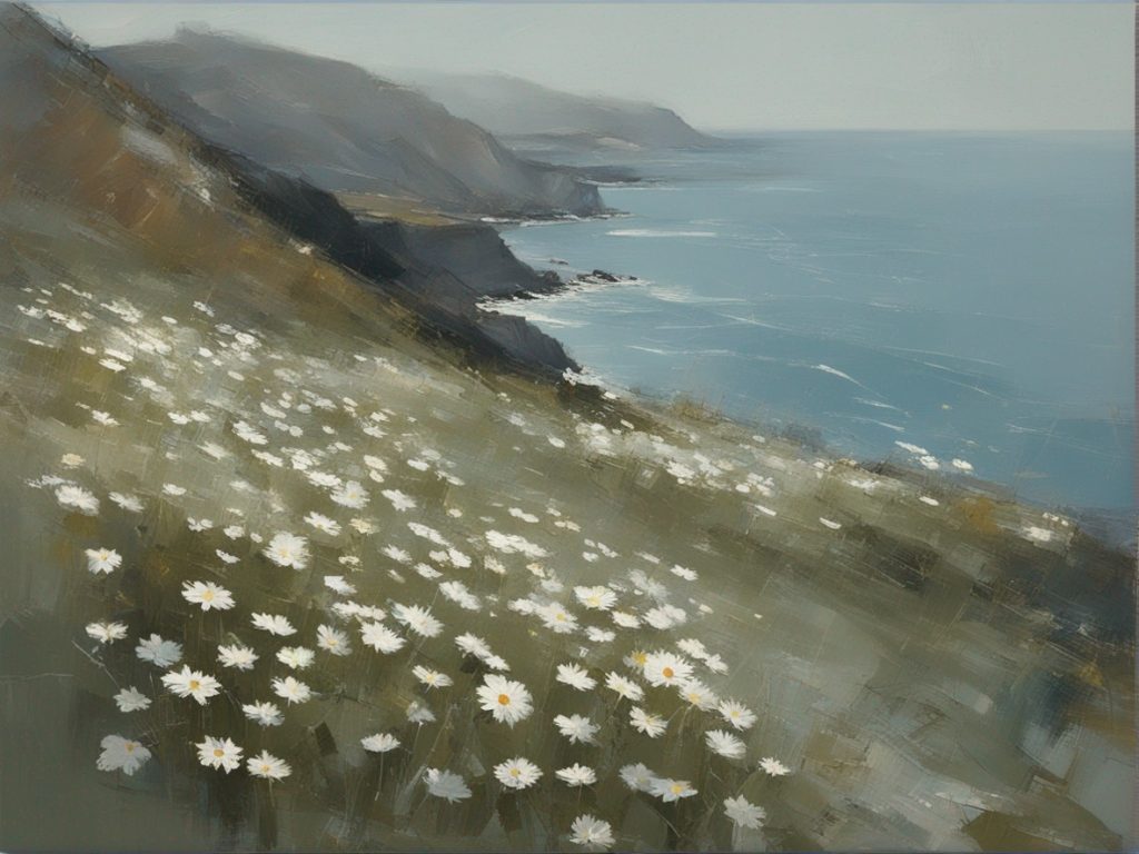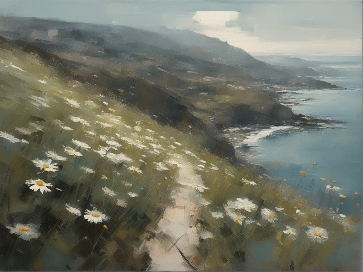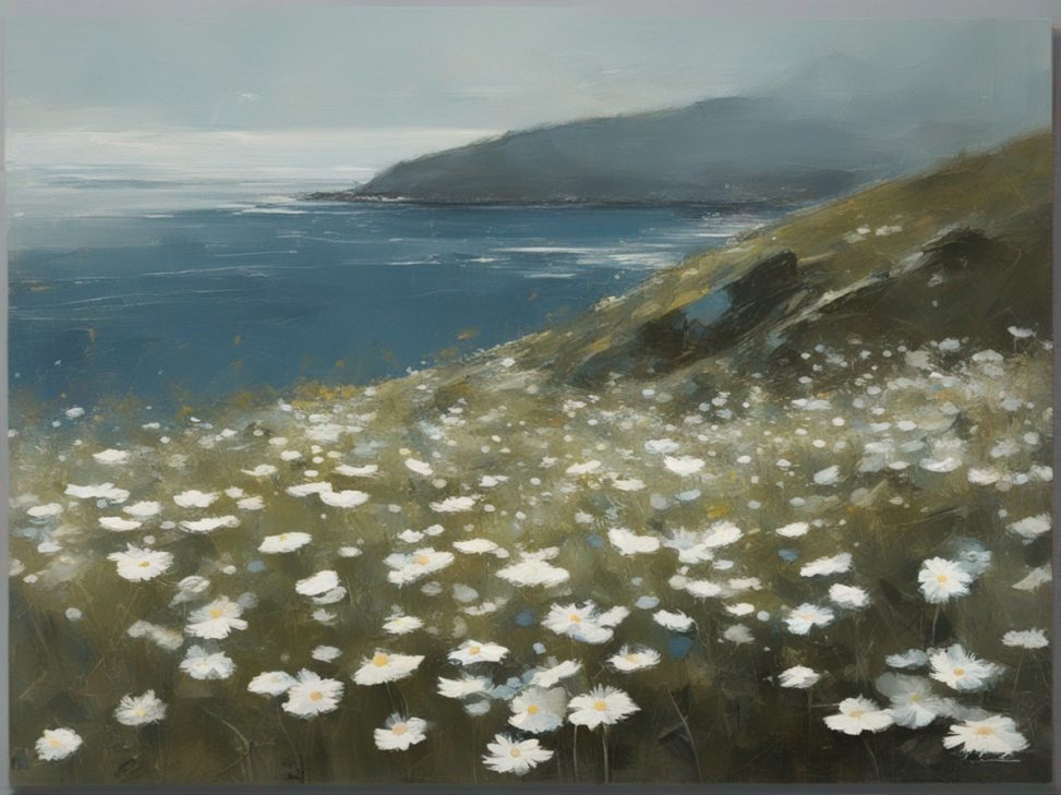 ハッシュタグ: #風景画,#マーガレット,#海峡,#崖,#大胆な筆使い,#自然,#荒々しさ,#生命の儚さ,#穏やかな世界
