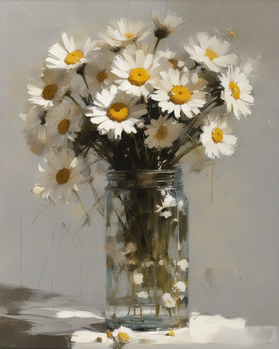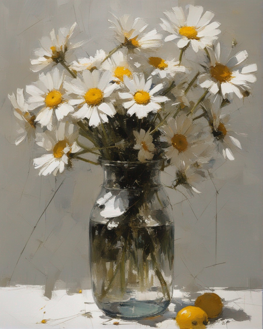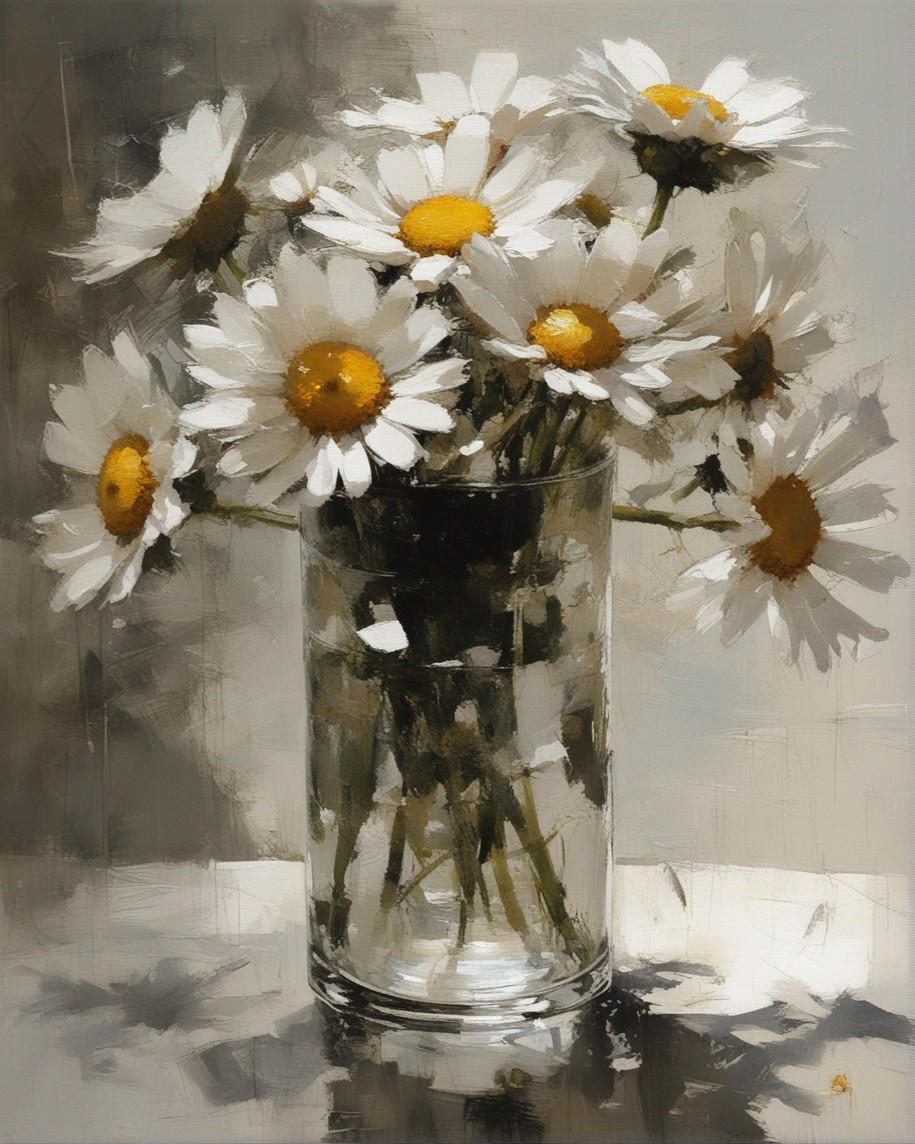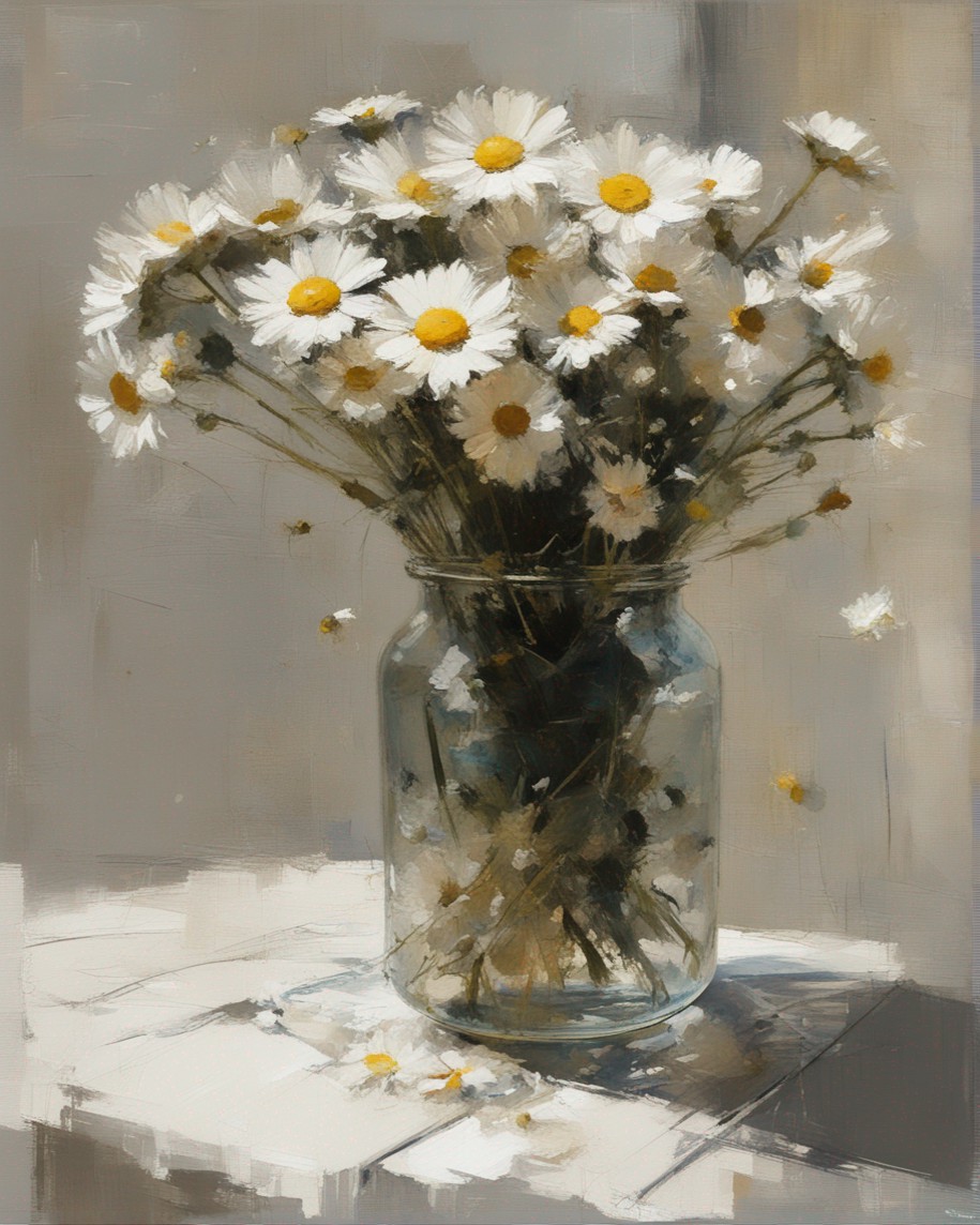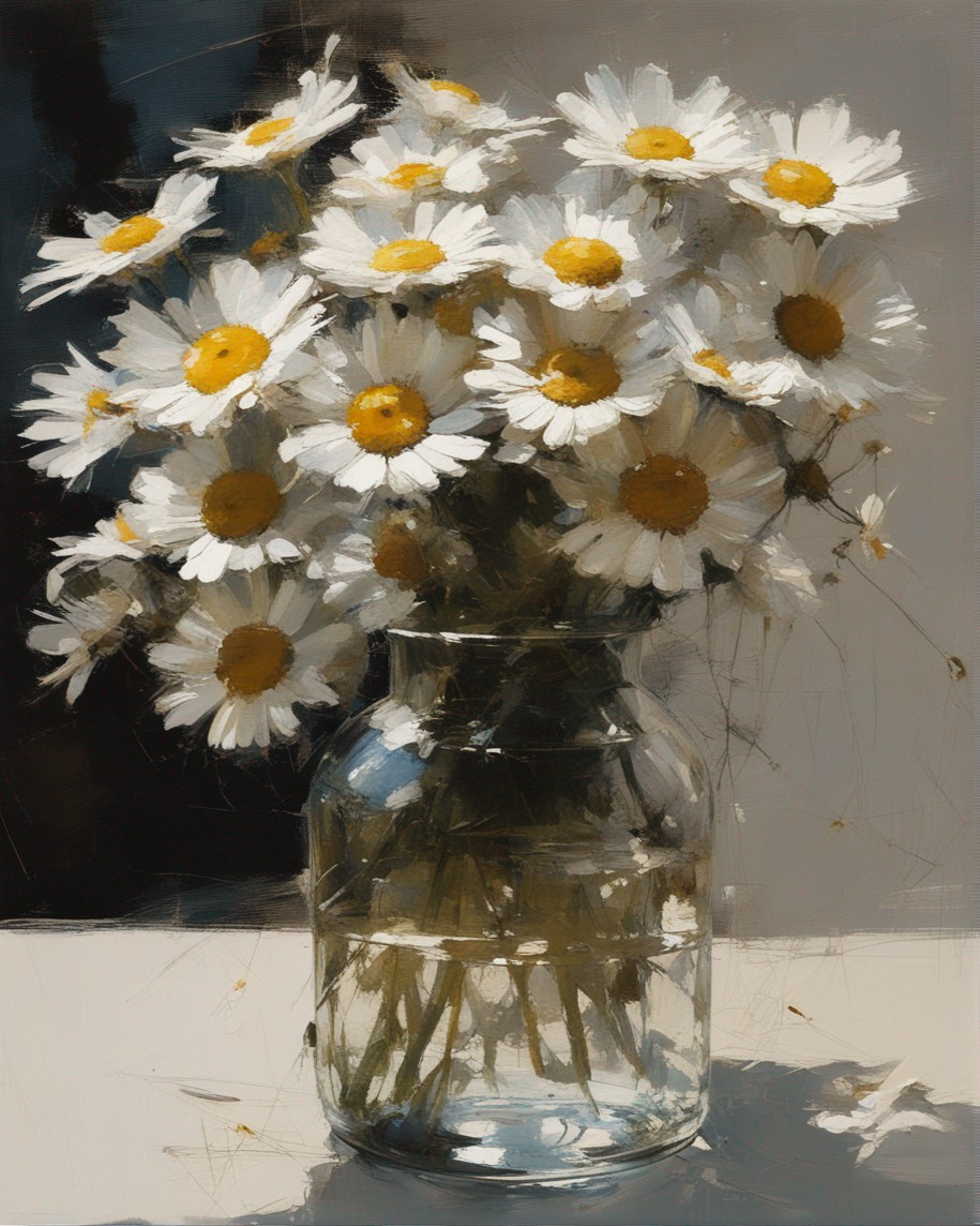 ハッシュタグ: #静物画,#マーガレット,#光と影,#透明な瓶,#白い花弁,#黄色い中心,#力強い筆使い,#生命力,#穏やかな雰囲気