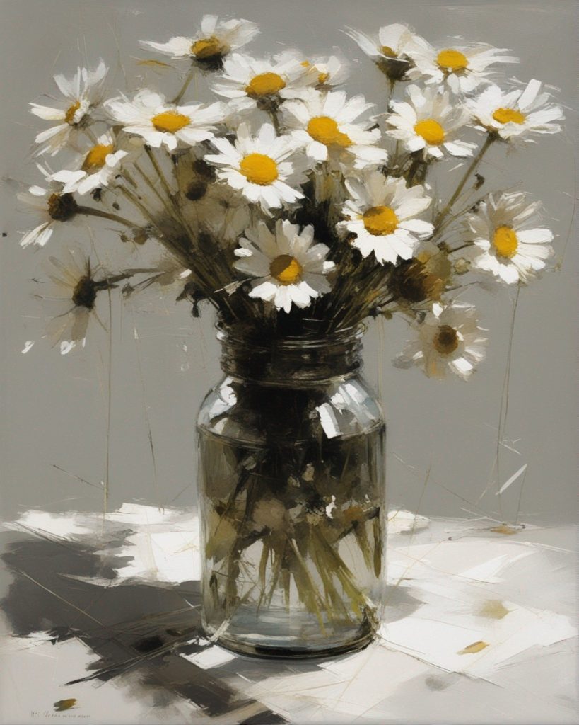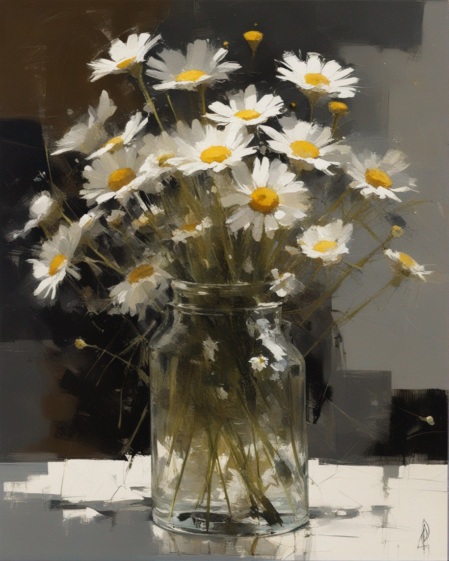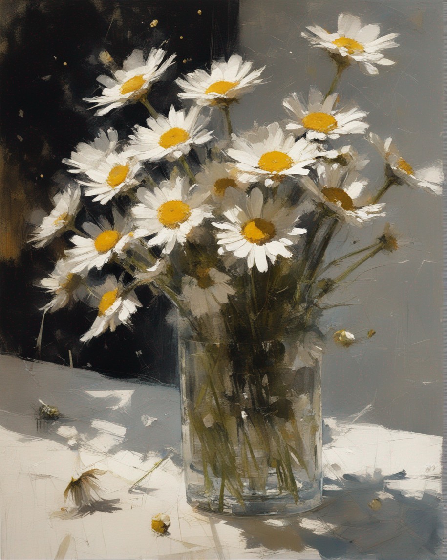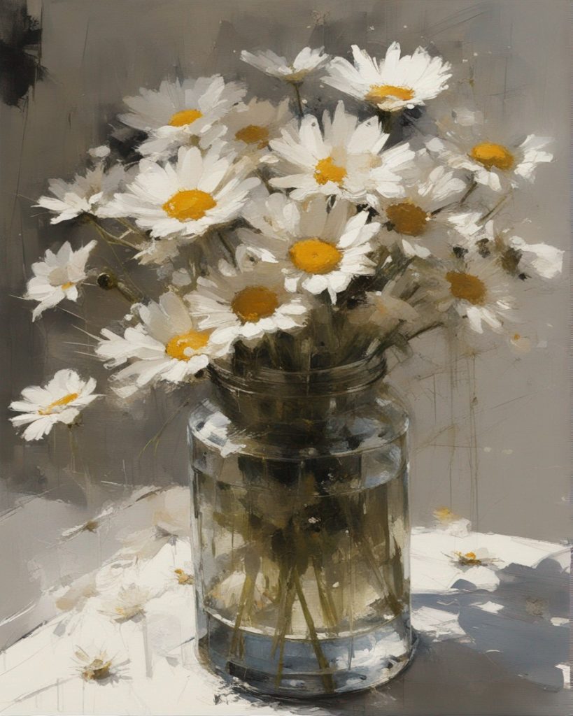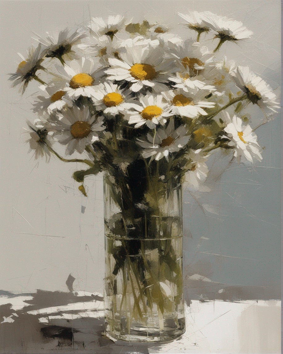 ハッシュタグ: #静物画,#マーガレット,#光と影,#透明な瓶,#白い花弁,#黄色い中心,#力強い筆使い,#生命力,#穏やかな雰囲気