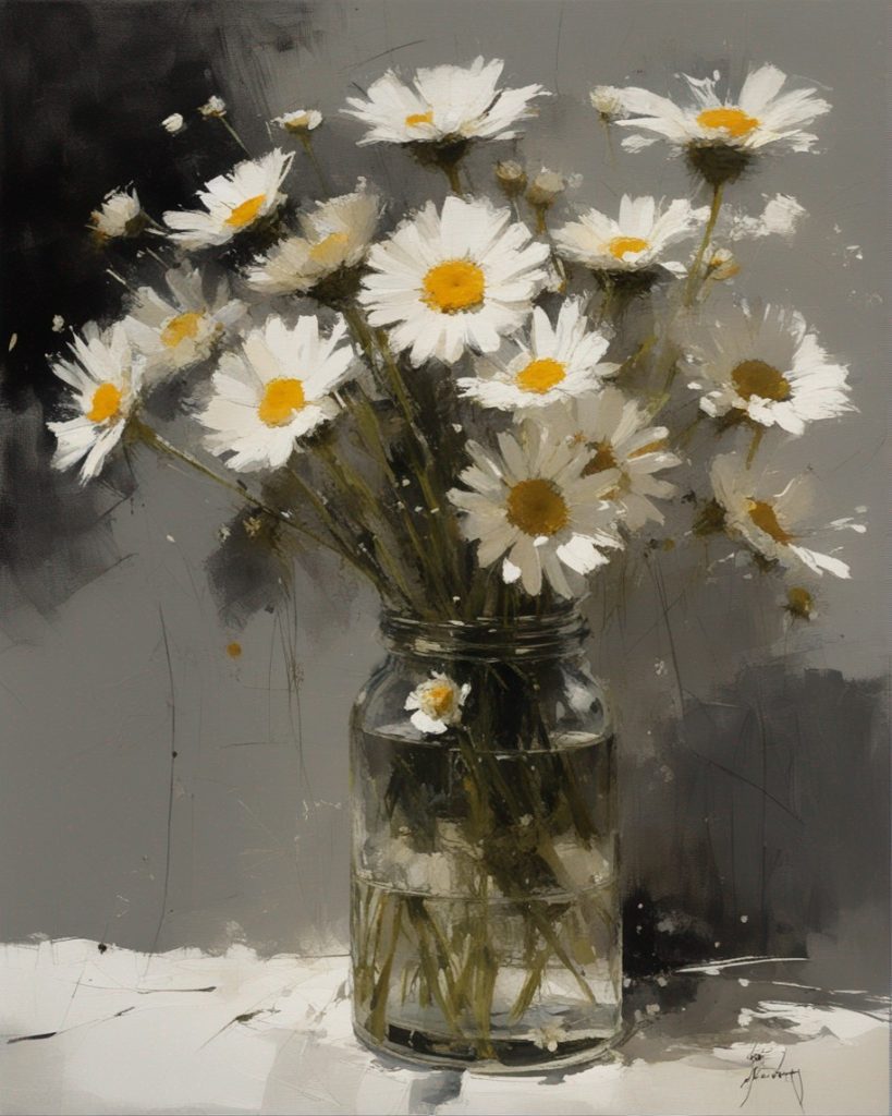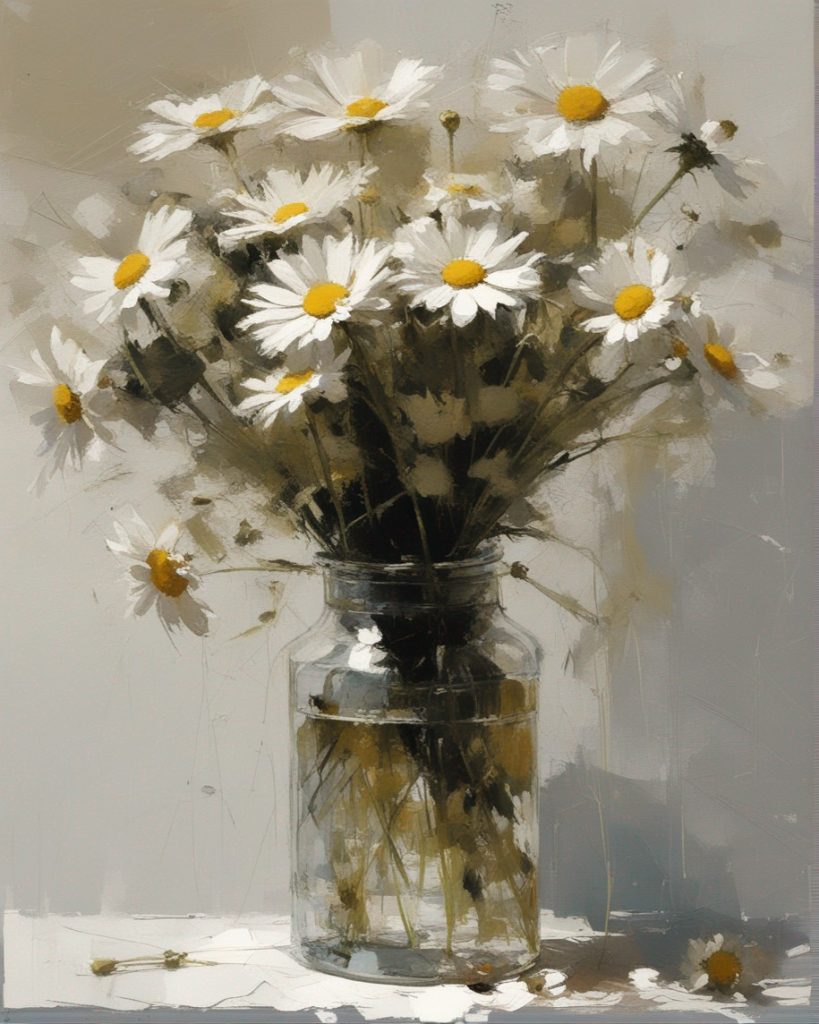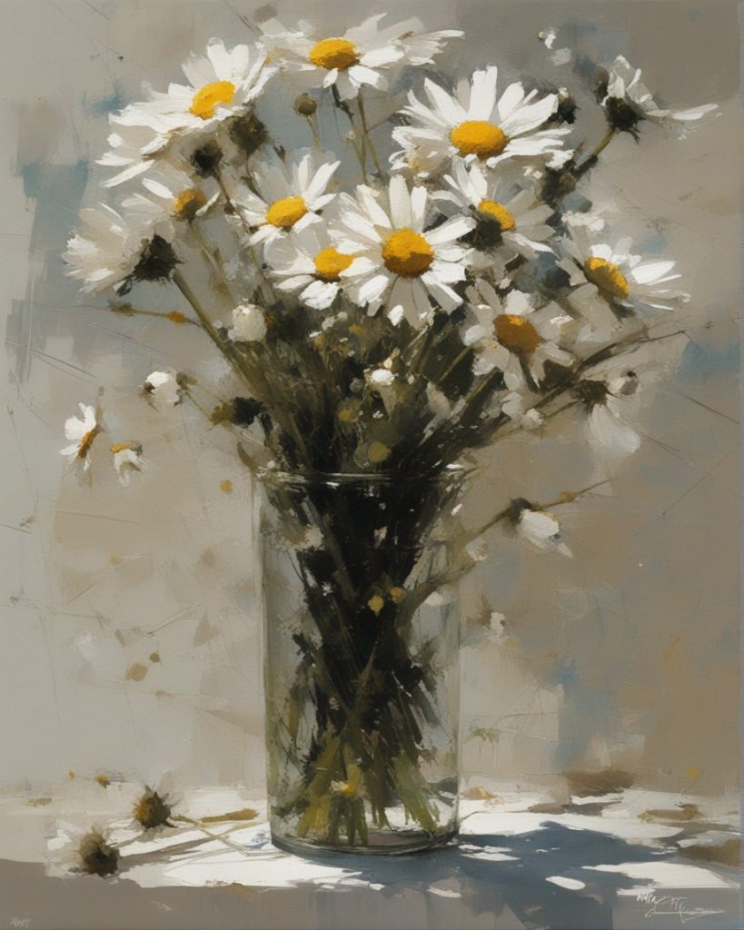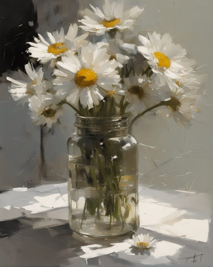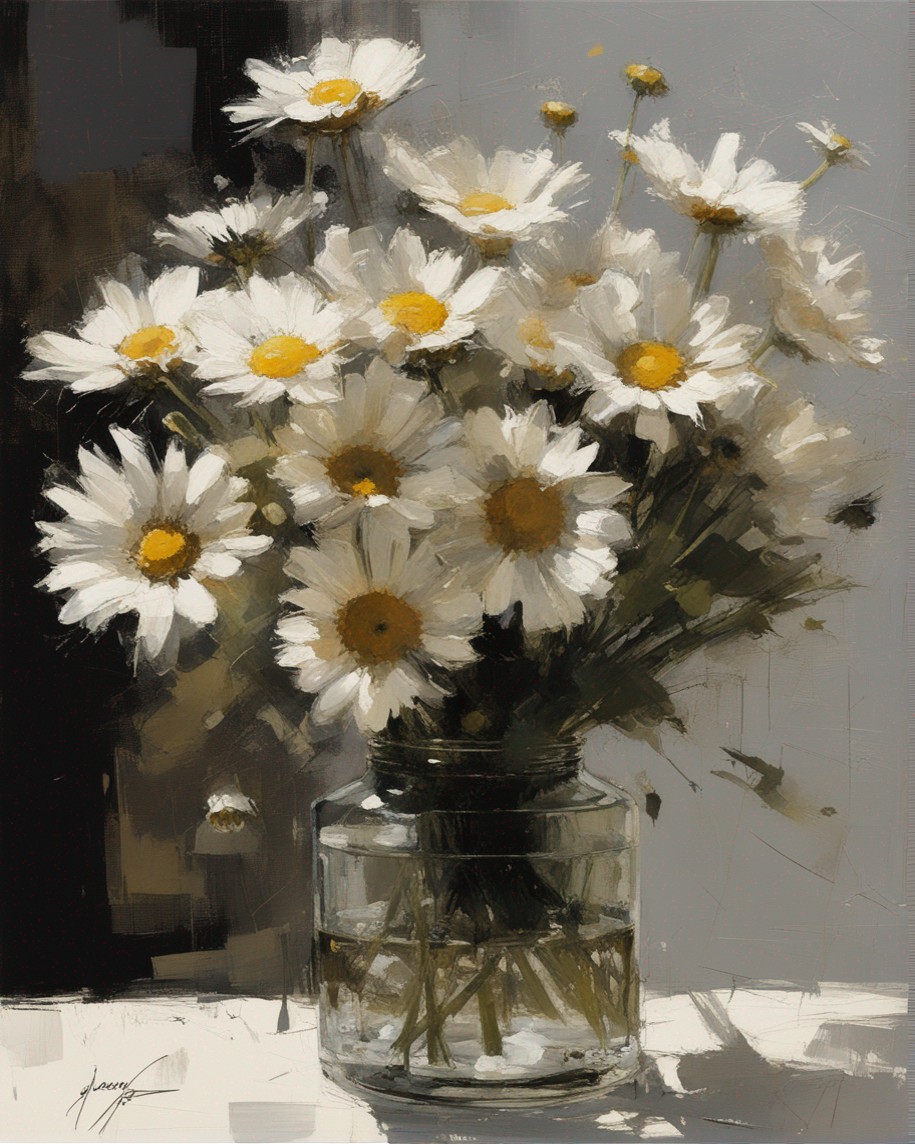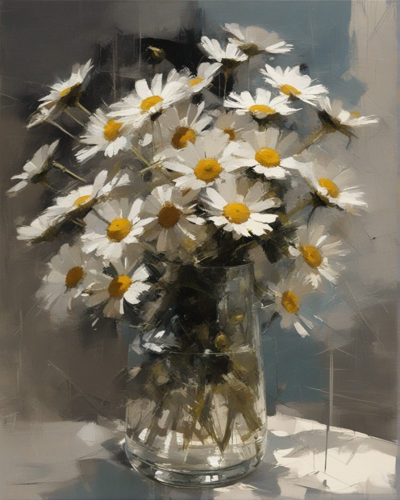 ハッシュタグ: #静物画,#マーガレット,#光と影,#透明な瓶,#白い花弁,#黄色い中心,#力強い筆使い,#生命力,#穏やかな雰囲気