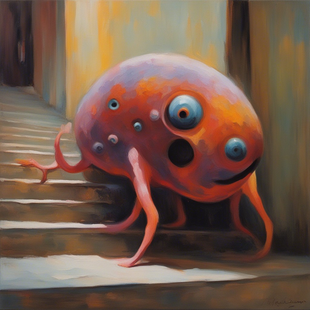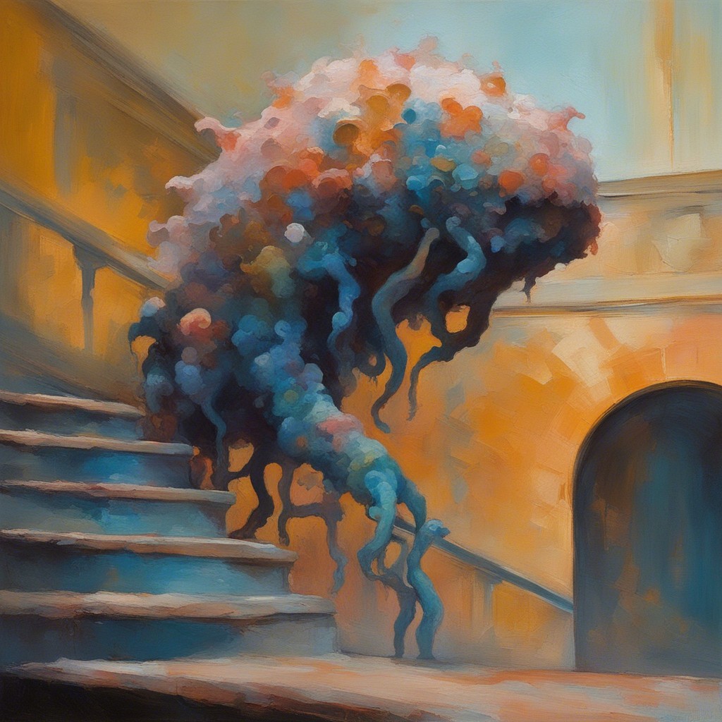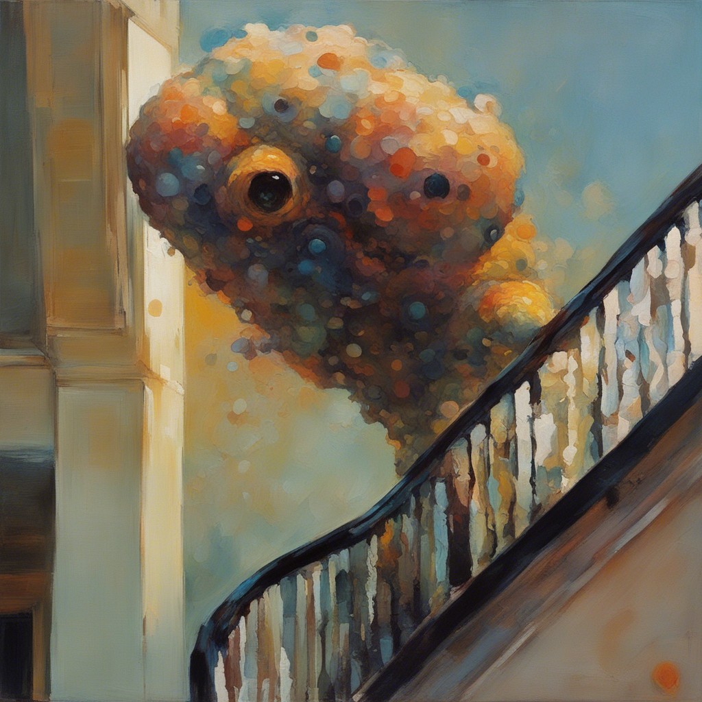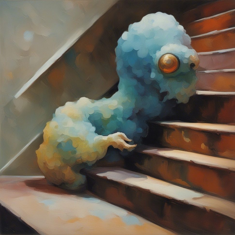 謎めいた生命体がひっそりと階段を上る様子を描いています。生命体の色合いは青から黄色へのグラデーションで表現され、その柔らかなフォルムが印象派のタッチを思わせます。観る者はこの生命体が「夜」の擬人化であり、静かに日々の喧騒から抜け出し、平穏へと向かう象徴であると想像するかもしれません。この絵は、日常とは異なる視点を提供し、見る者に想像力をかき立てます。