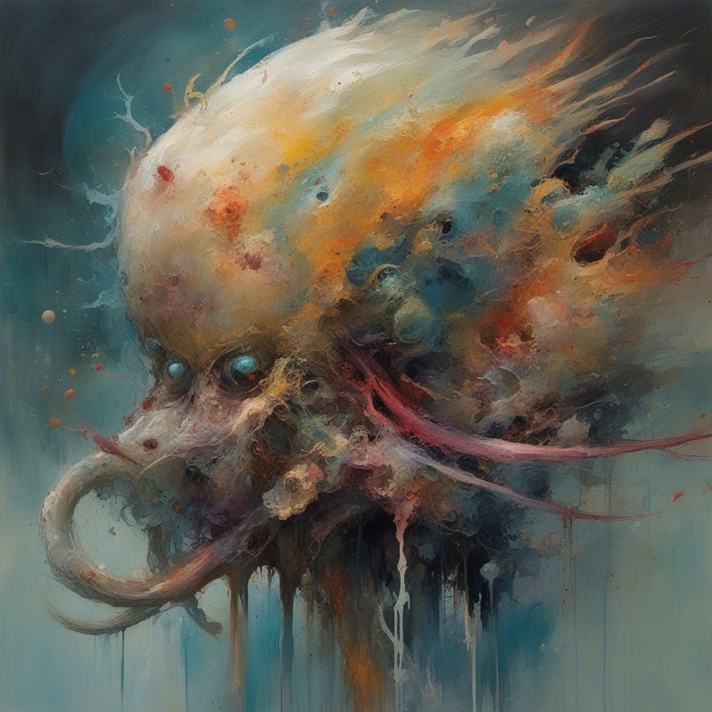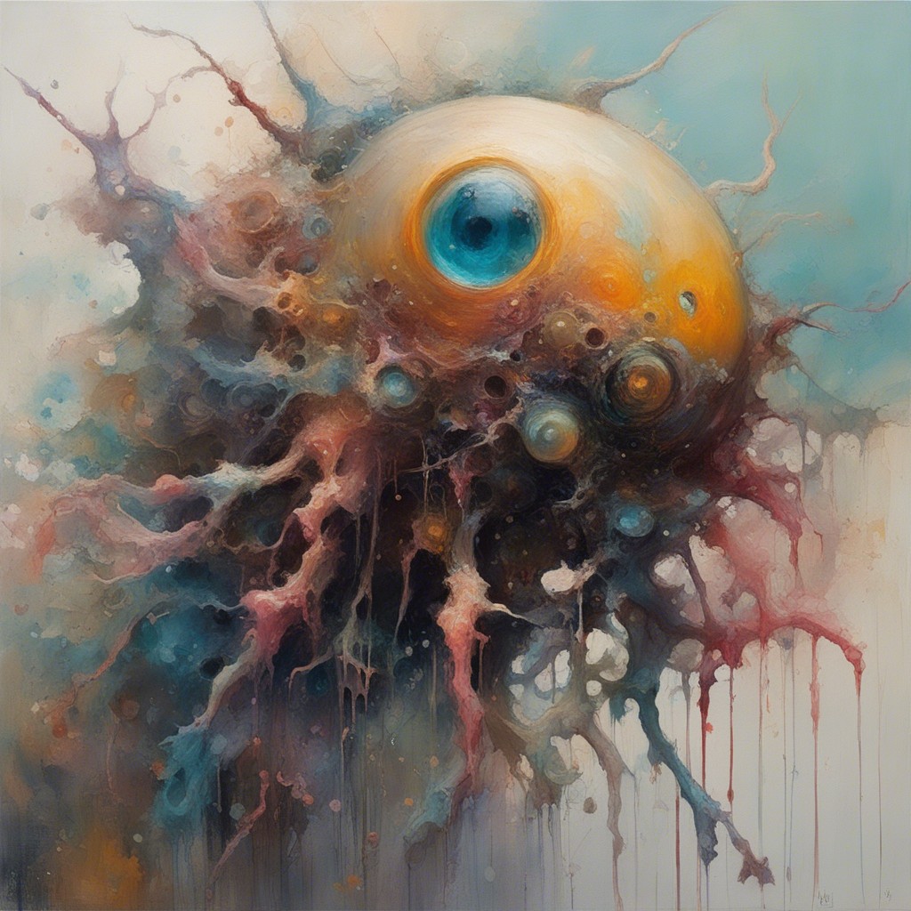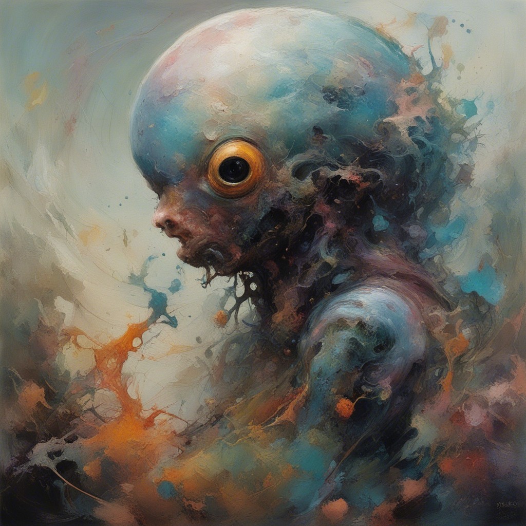 謎めいた生命体がひっそりと階段を上る様子を描いています。生命体の色合いは青から黄色へのグラデーションで表現され、その柔らかなフォルムが印象派のタッチを思わせます。観る者はこの生命体が「夜」の擬人化であり、静かに日々の喧騒から抜け出し、平穏へと向かう象徴であると想像するかもしれません。この絵は、日常とは異なる視点を提供し、見る者に想像力をかき立てます。