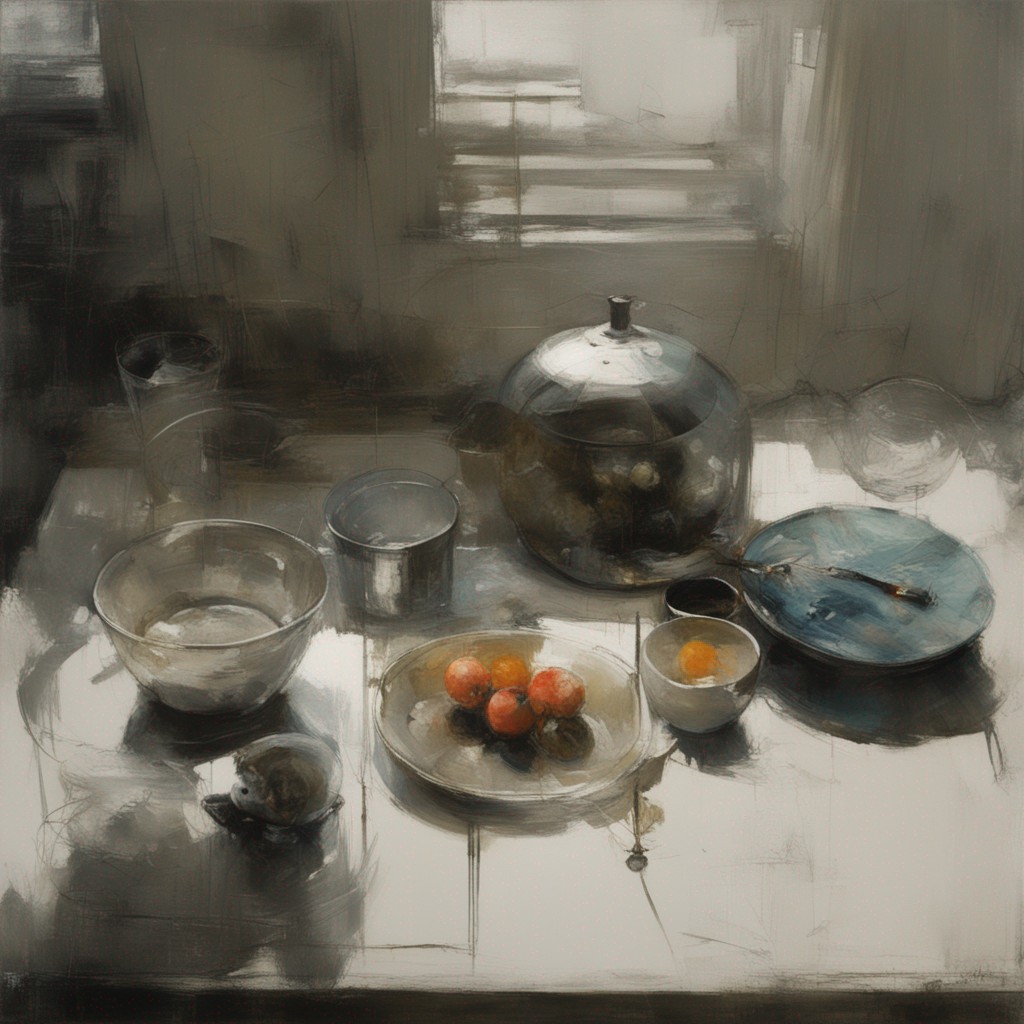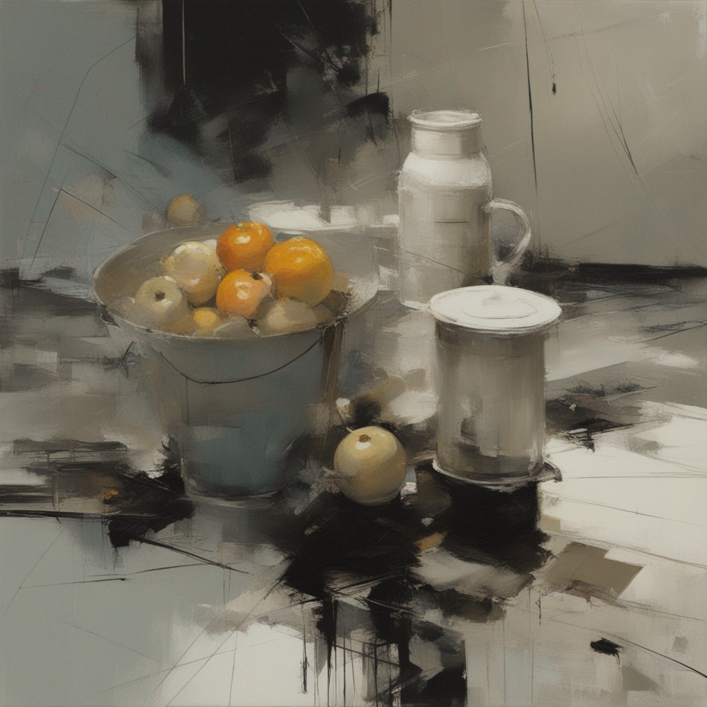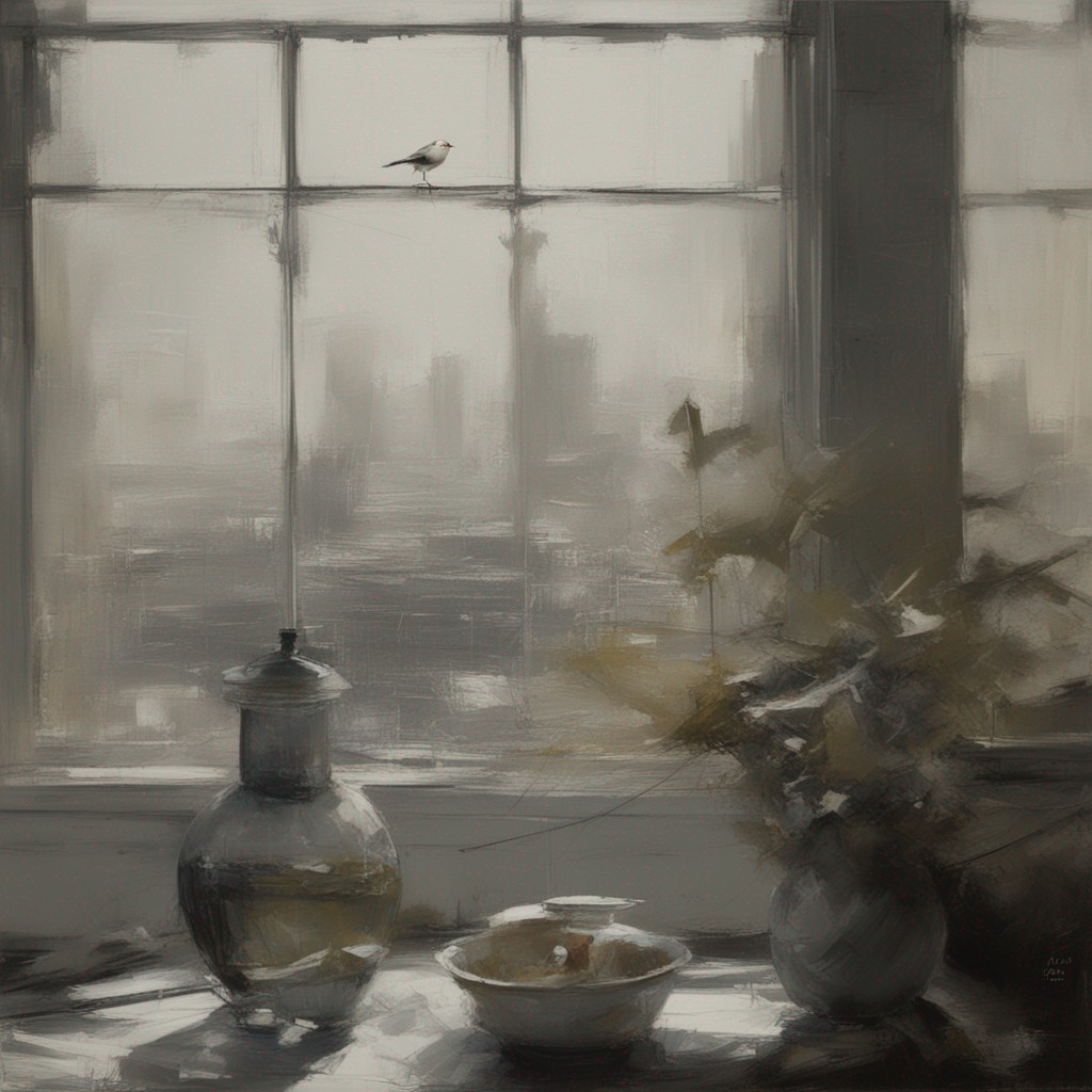黄金色の果実と一緒に描かれた一羽の青鳥を主題にしています。絵の中で青鳥は、静かに物思いにふけるかのように佇み、果実と共に優美な静けさを演出しています。背景は抽象的な筆使いでぼかされており、鳥と果実のディテールが際立つようにしています。この絵は、自然の美しさと生き物と無生物の微妙な関係を描き出し、観る者に穏やかな観察の喜びを提供しています。
