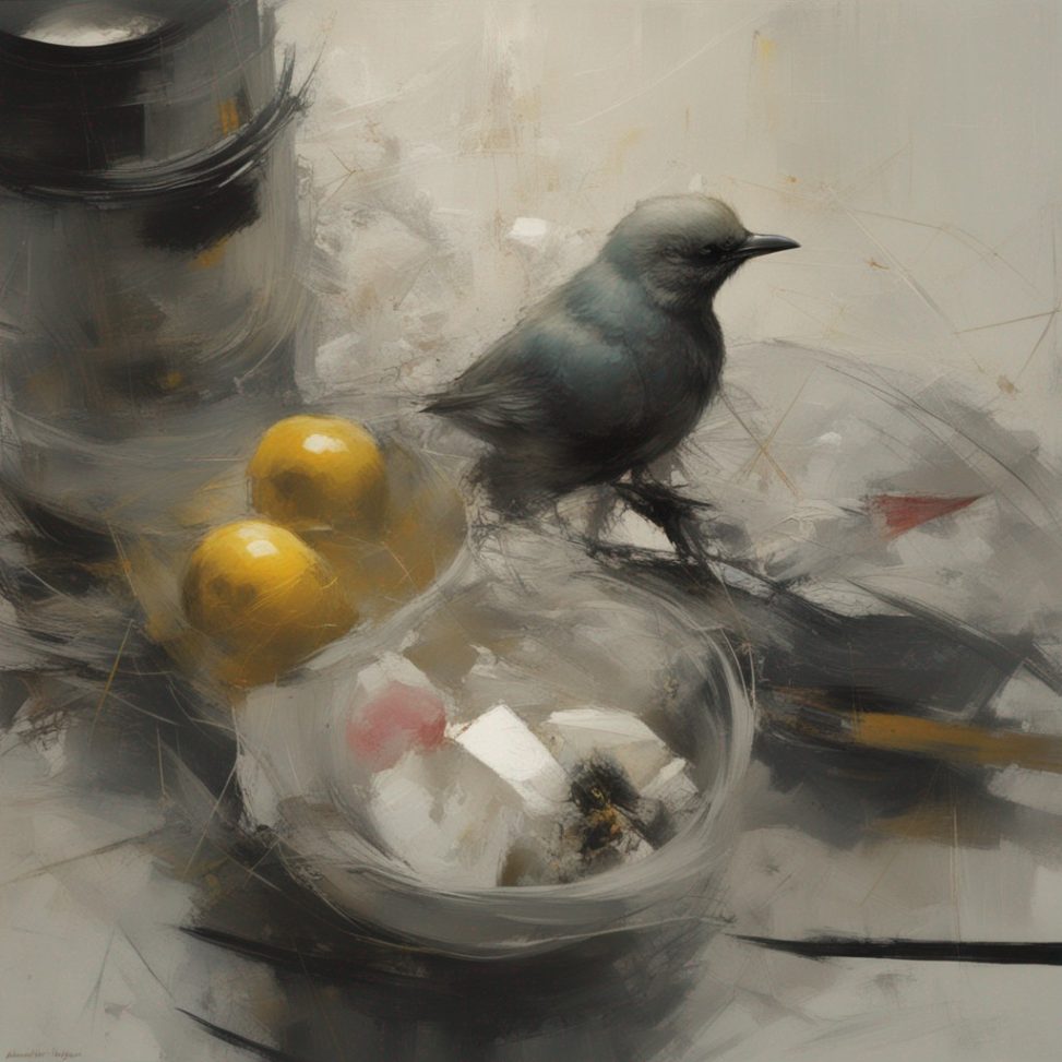 ハッシュタグ: #静物画,#青鳥,#黄金の果実,#抽象的背景,#ディテール,#自然の美,#生き物と無生物,#静けさ,#観察の喜び