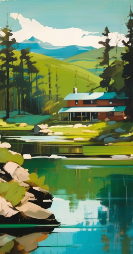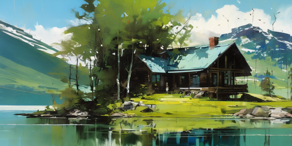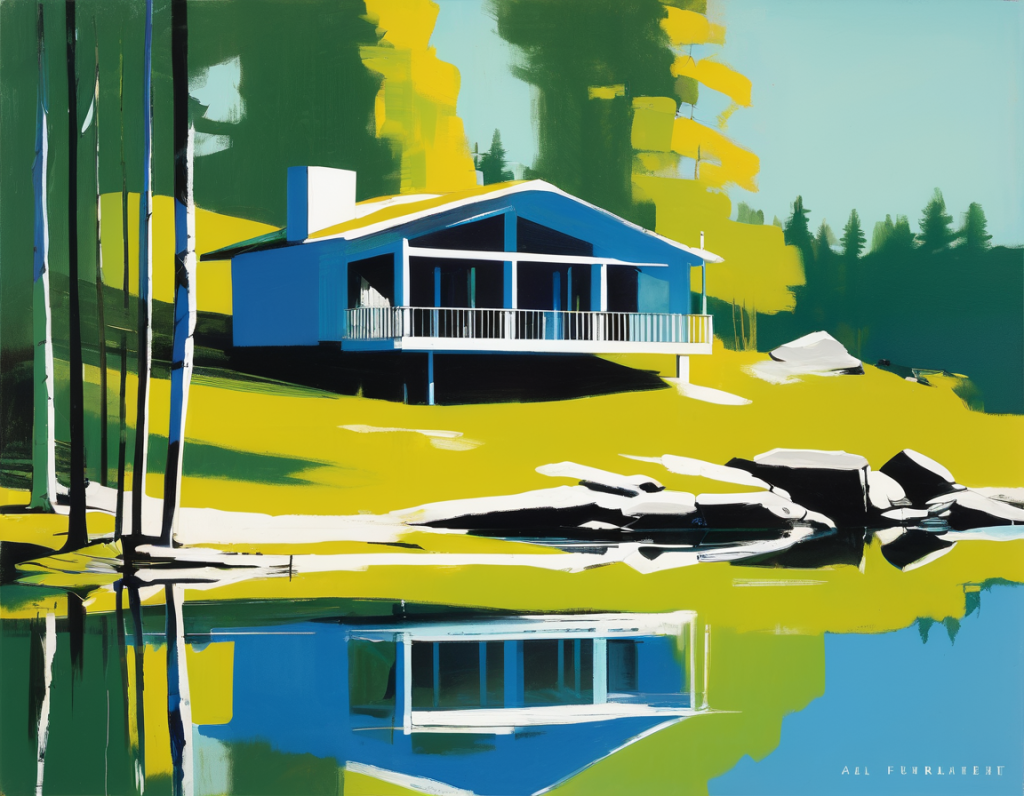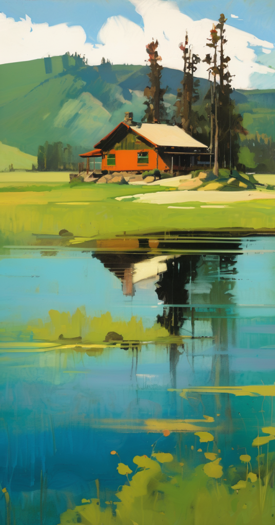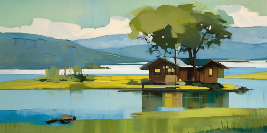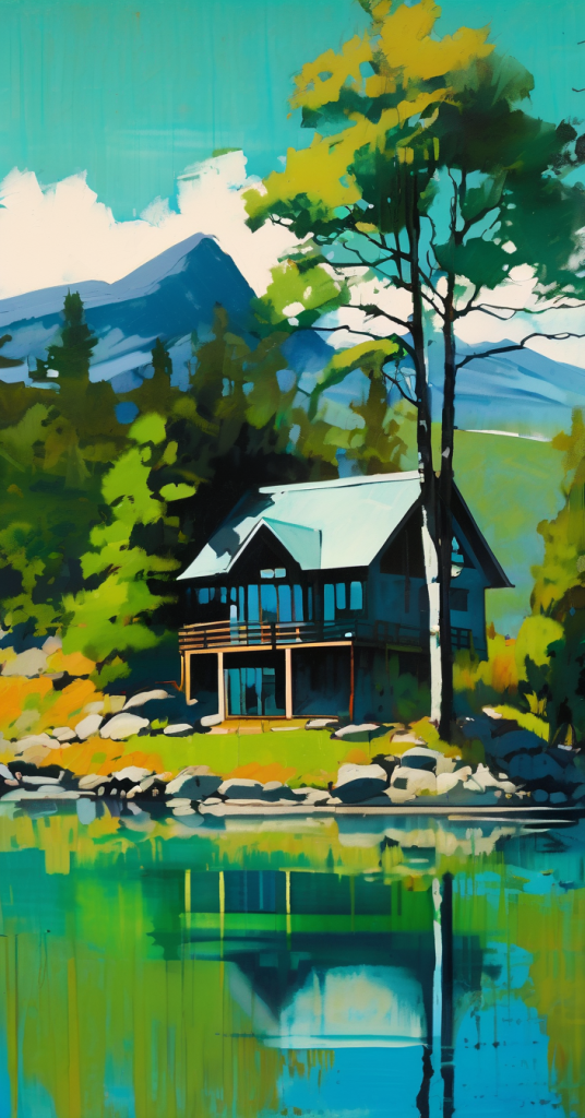 湖畔に佇む小さな家と、広がる静かな水面が特徴的なこの現代風景画は、観る者に穏やかな安らぎを提供します。ビビッドな色彩と大胆な筆遣いが、自然の豊かな生命力と穏やかな時間の流れを捉えています。この絵は、日常の喧騒から離れ、心を落ち着ける場所へと誘います。反映された水面と、その上に浮かぶ優雅な木々のシルエットが、見る者の心に静けさをもたらすでしょう。