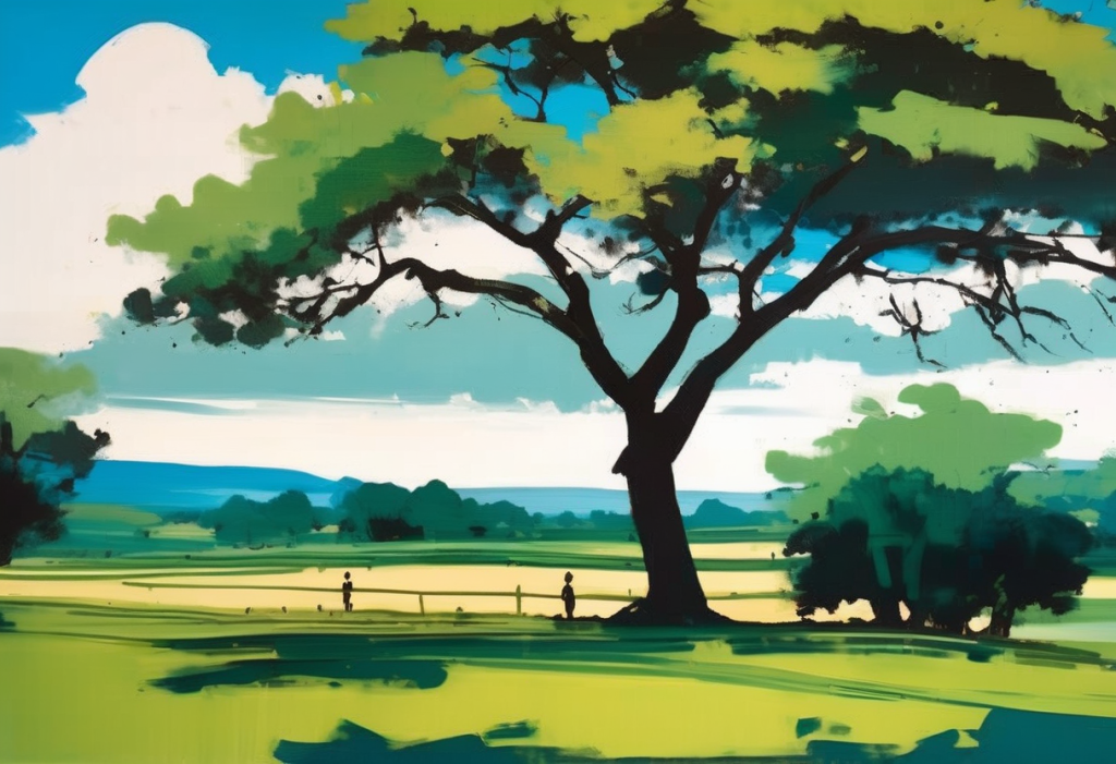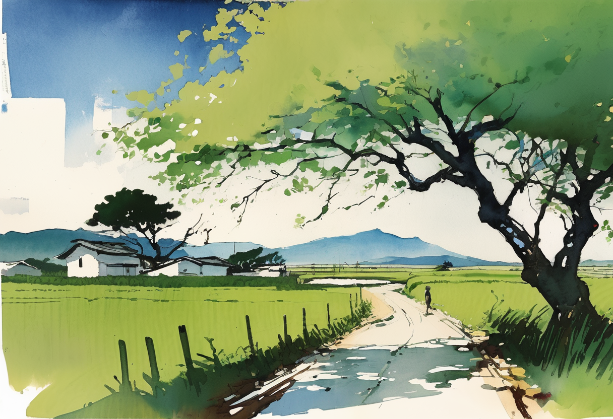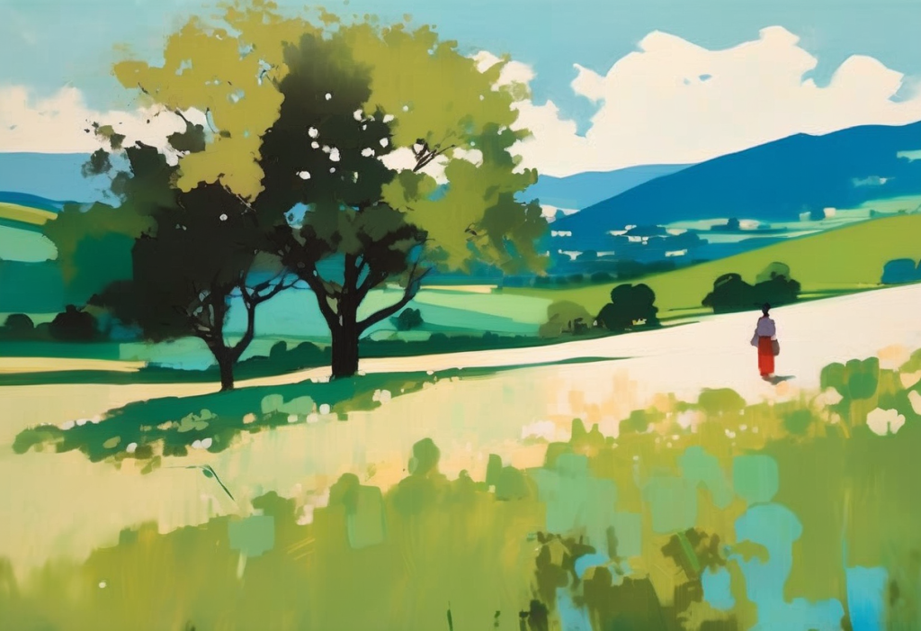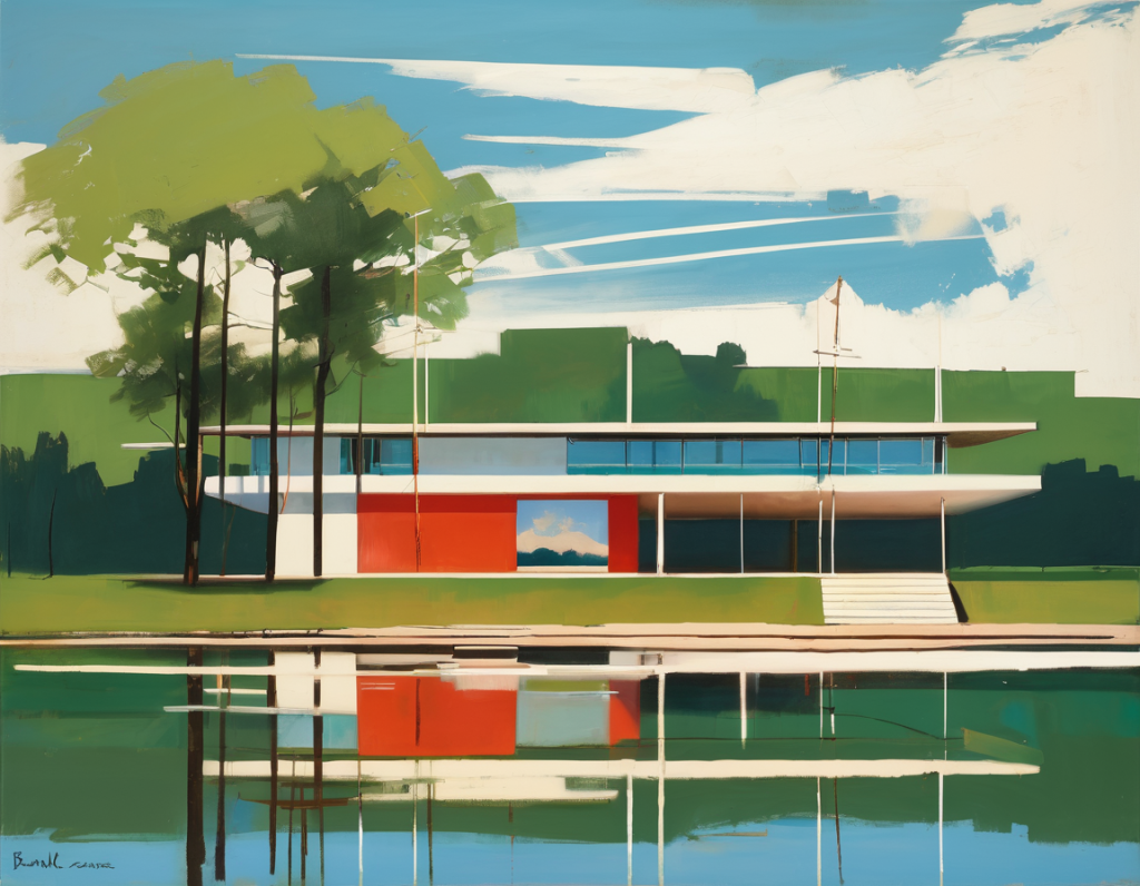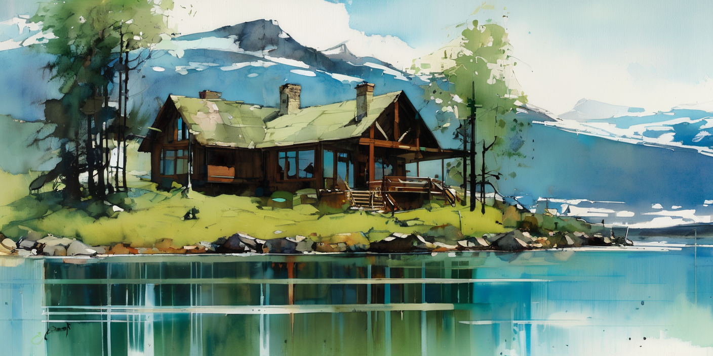 湖畔に佇む小さな家と、広がる静かな水面が特徴的なこの現代風景画は、観る者に穏やかな安らぎを提供します。ビビッドな色彩と大胆な筆遣いが、自然の豊かな生命力と穏やかな時間の流れを捉えています。この絵は、日常の喧騒から離れ、心を落ち着ける場所へと誘います。反映された水面と、その上に浮かぶ優雅な木々のシルエットが、見る者の心に静けさをもたらすでしょう。