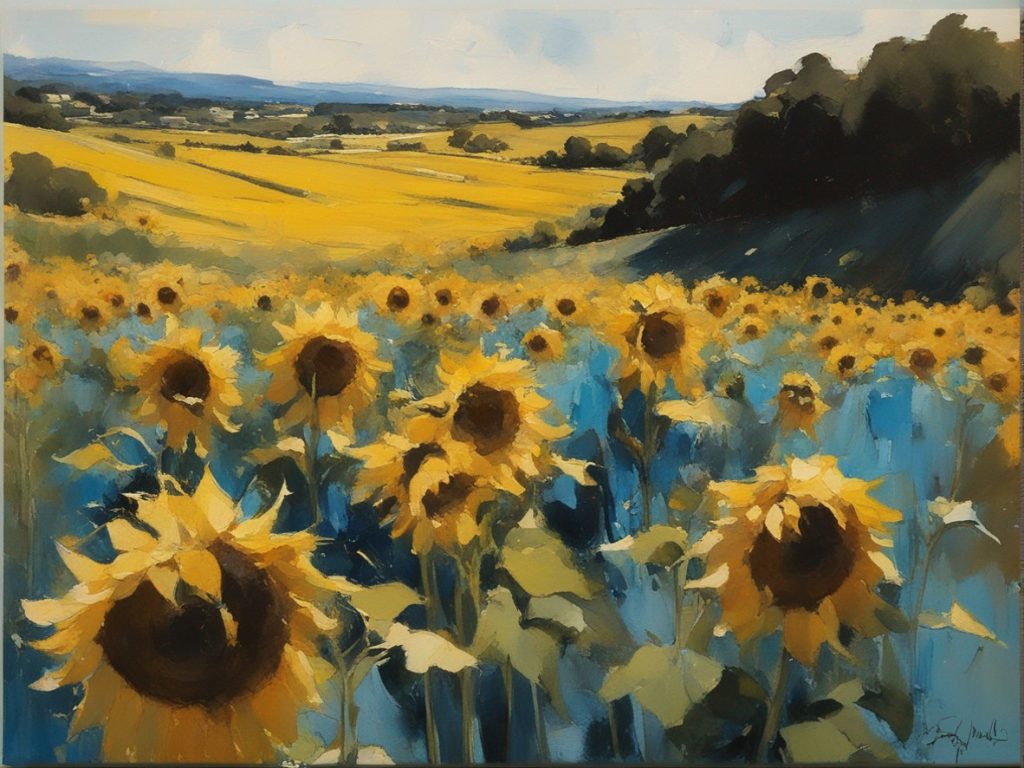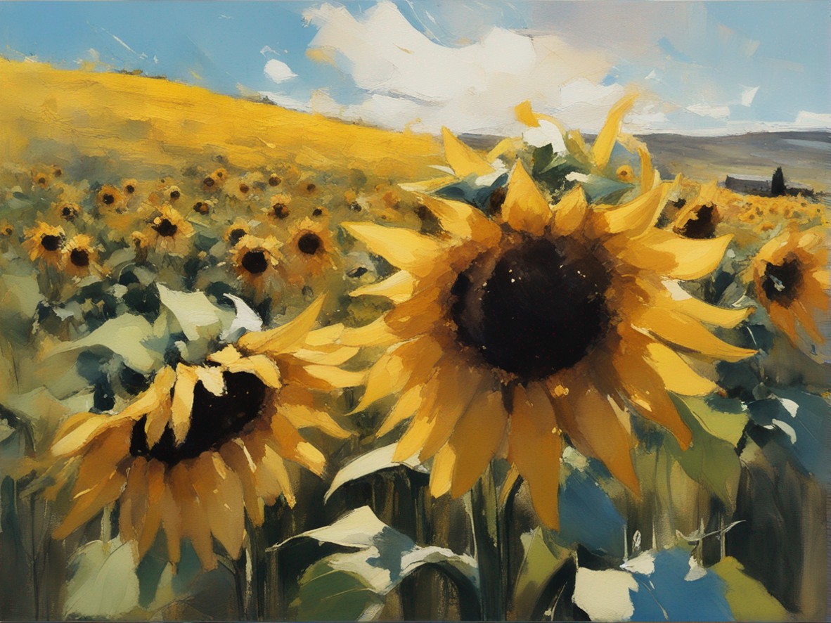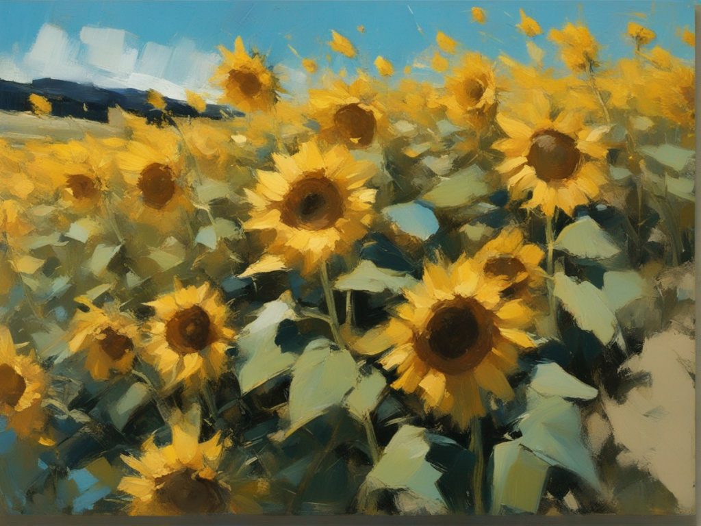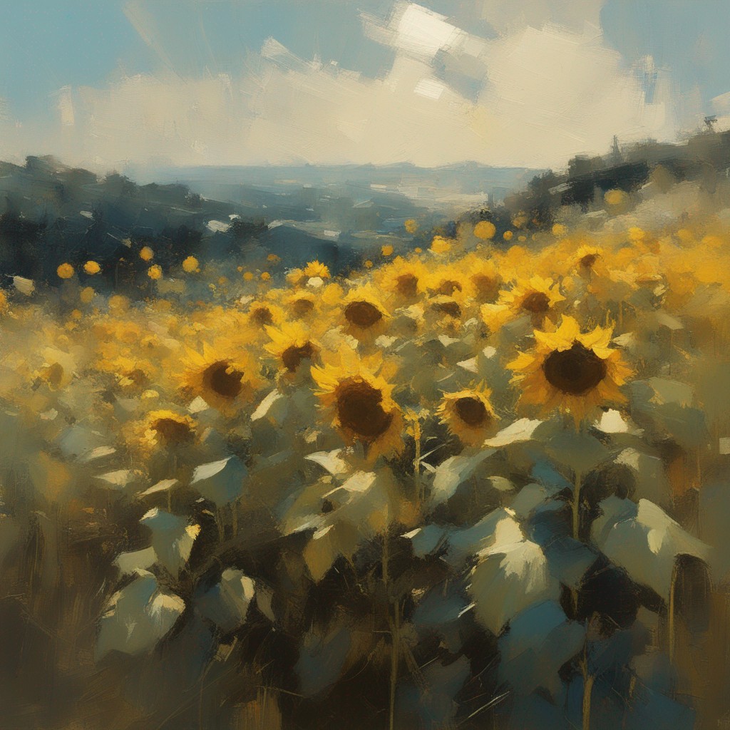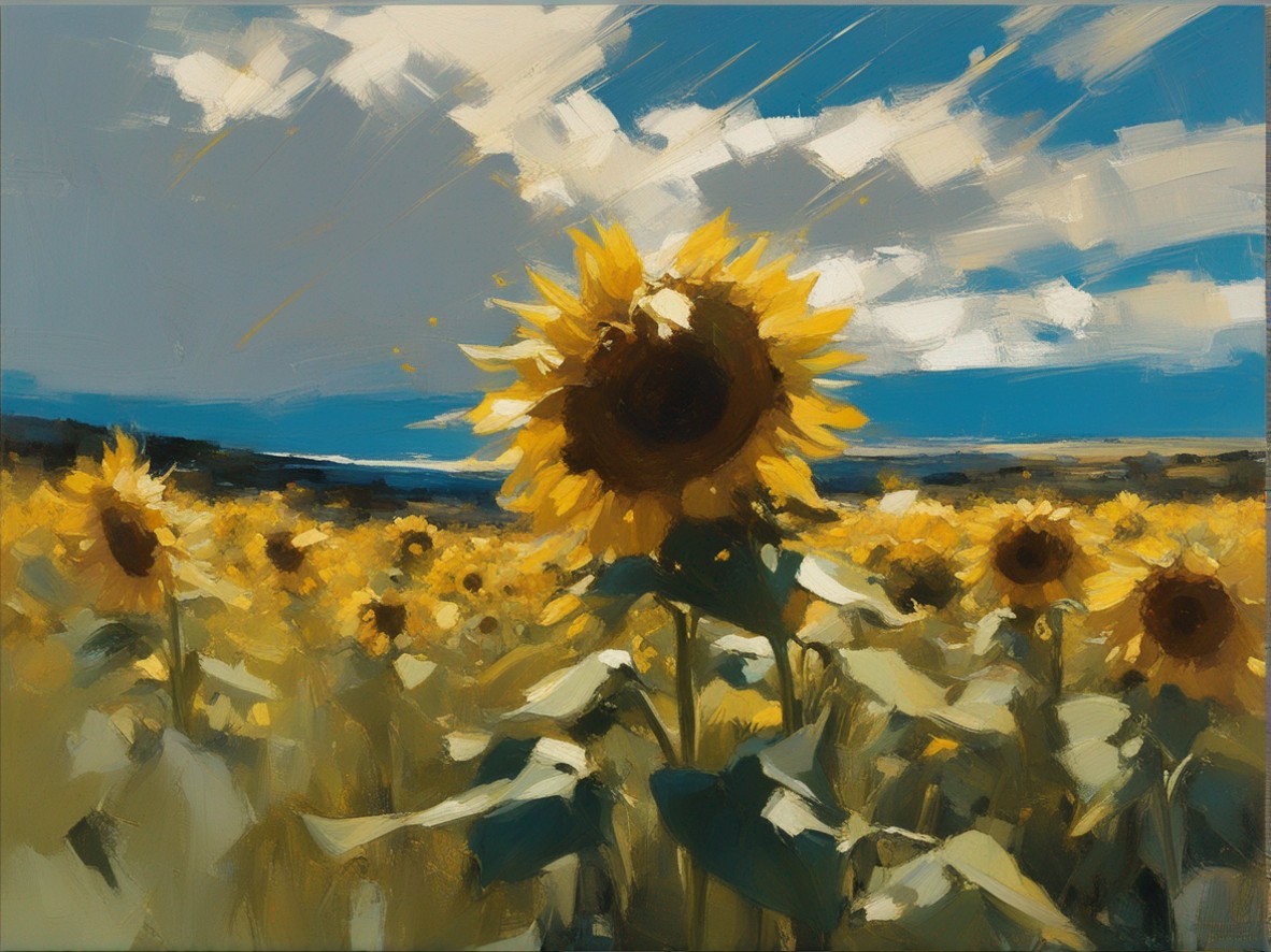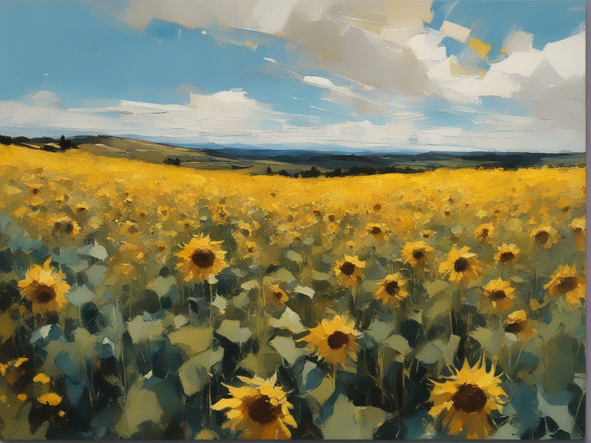 広がる蒼い空の下で風に揺れるひまわり畑を捉えた風景画です。勢いよく描かれた筆のストロークが、ひまわりの生命力と自然のダイナミズムを表現しています。画面を覆う豊かな黄色は、太陽の光を浴びて輝くひまわりの花々を象徴しており、観る者に暖かさと希望の感覚を提供します。遠くの空と地平線が交わる場所には、穏やかな青色が広がり、開放感を演出しています。この作品は、夏の日の活気と爽やかな風を感じさせる力強い作品です。