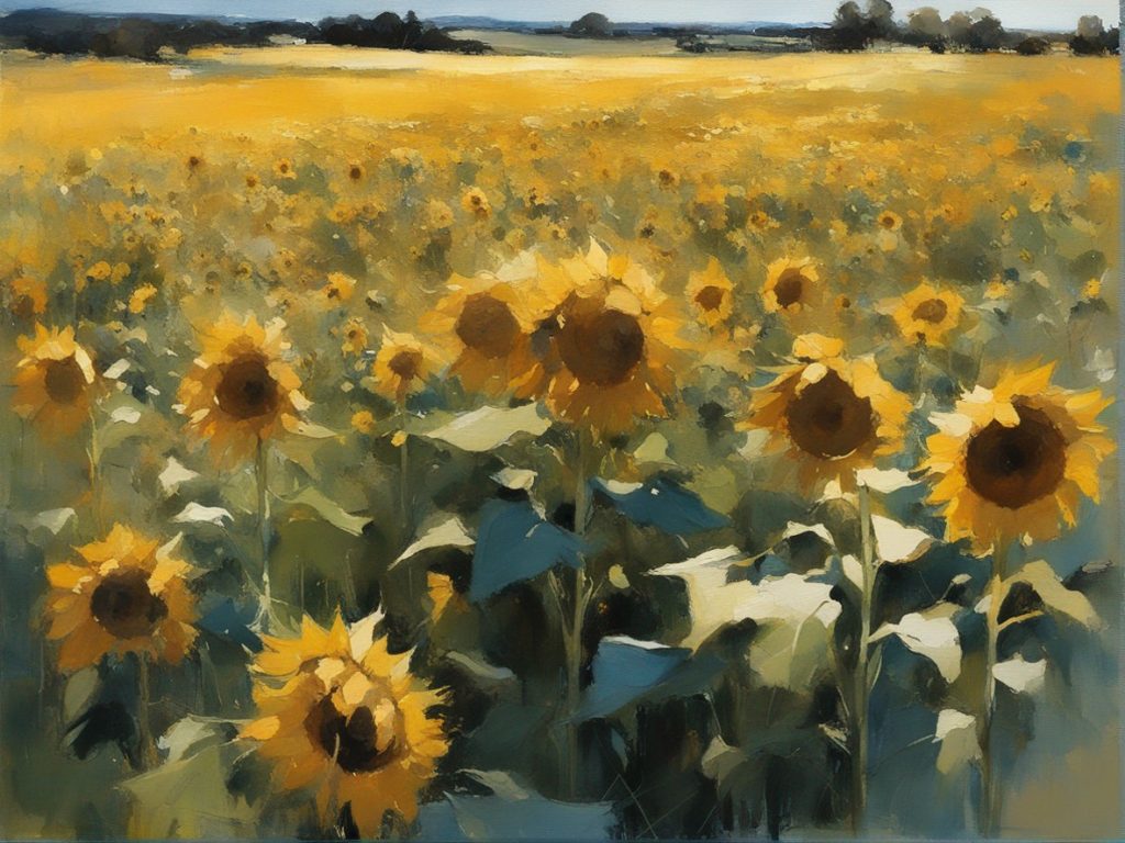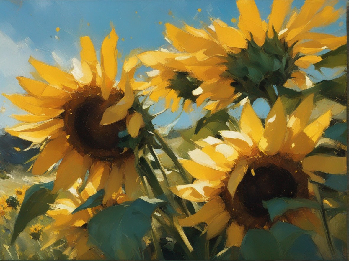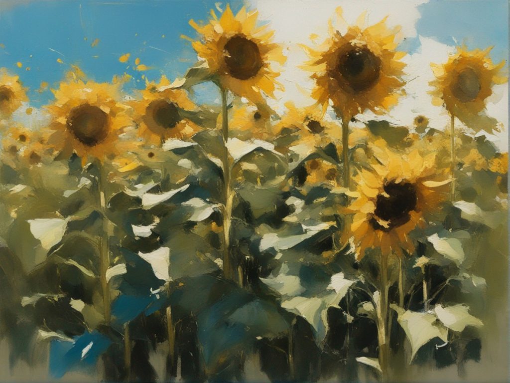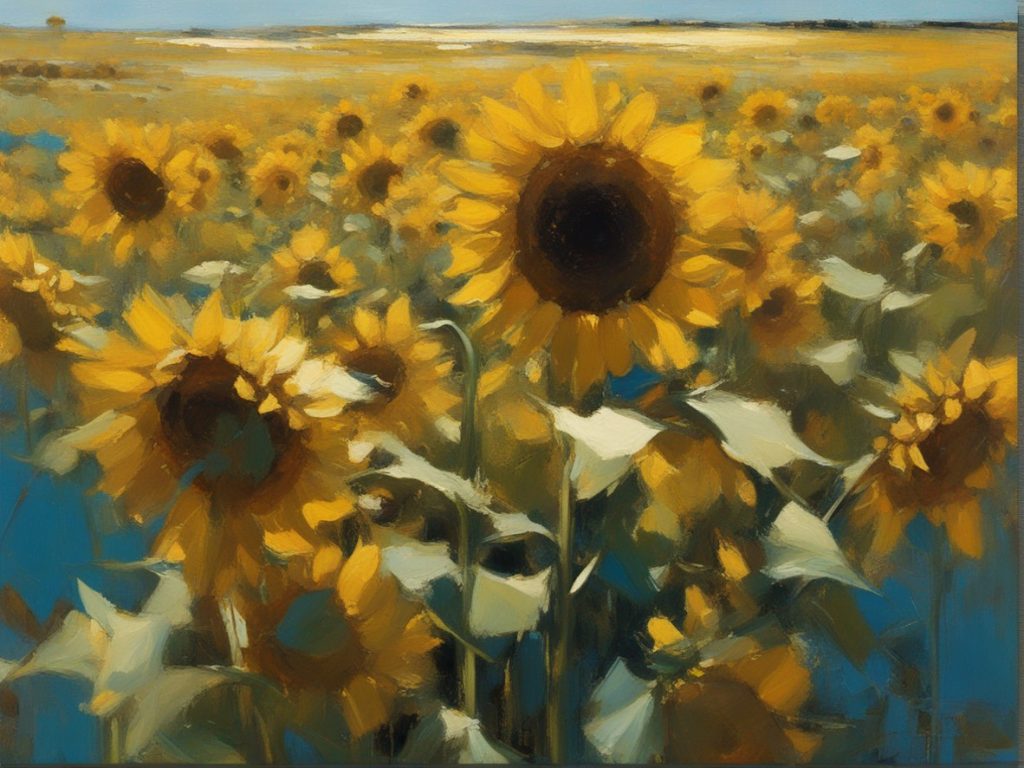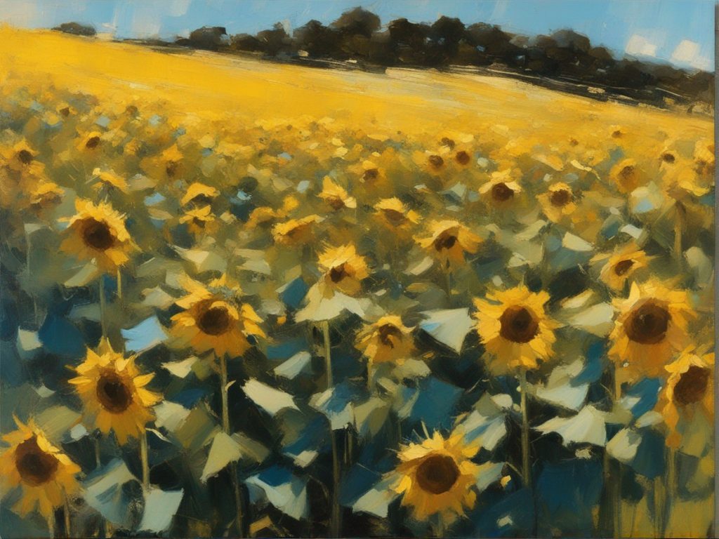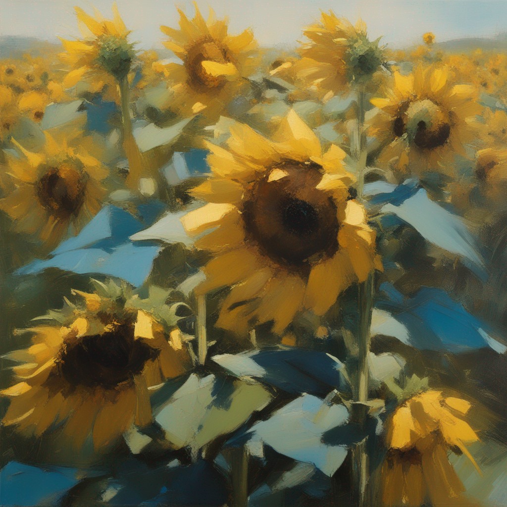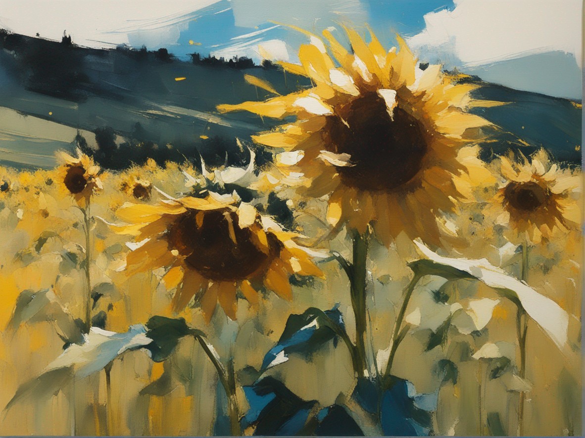 広がる蒼い空の下で風に揺れるひまわり畑を捉えた風景画です。勢いよく描かれた筆のストロークが、ひまわりの生命力と自然のダイナミズムを表現しています。画面を覆う豊かな黄色は、太陽の光を浴びて輝くひまわりの花々を象徴しており、観る者に暖かさと希望の感覚を提供します。遠くの空と地平線が交わる場所には、穏やかな青色が広がり、開放感を演出しています。この作品は、夏の日の活気と爽やかな風を感じさせる力強い作品です。